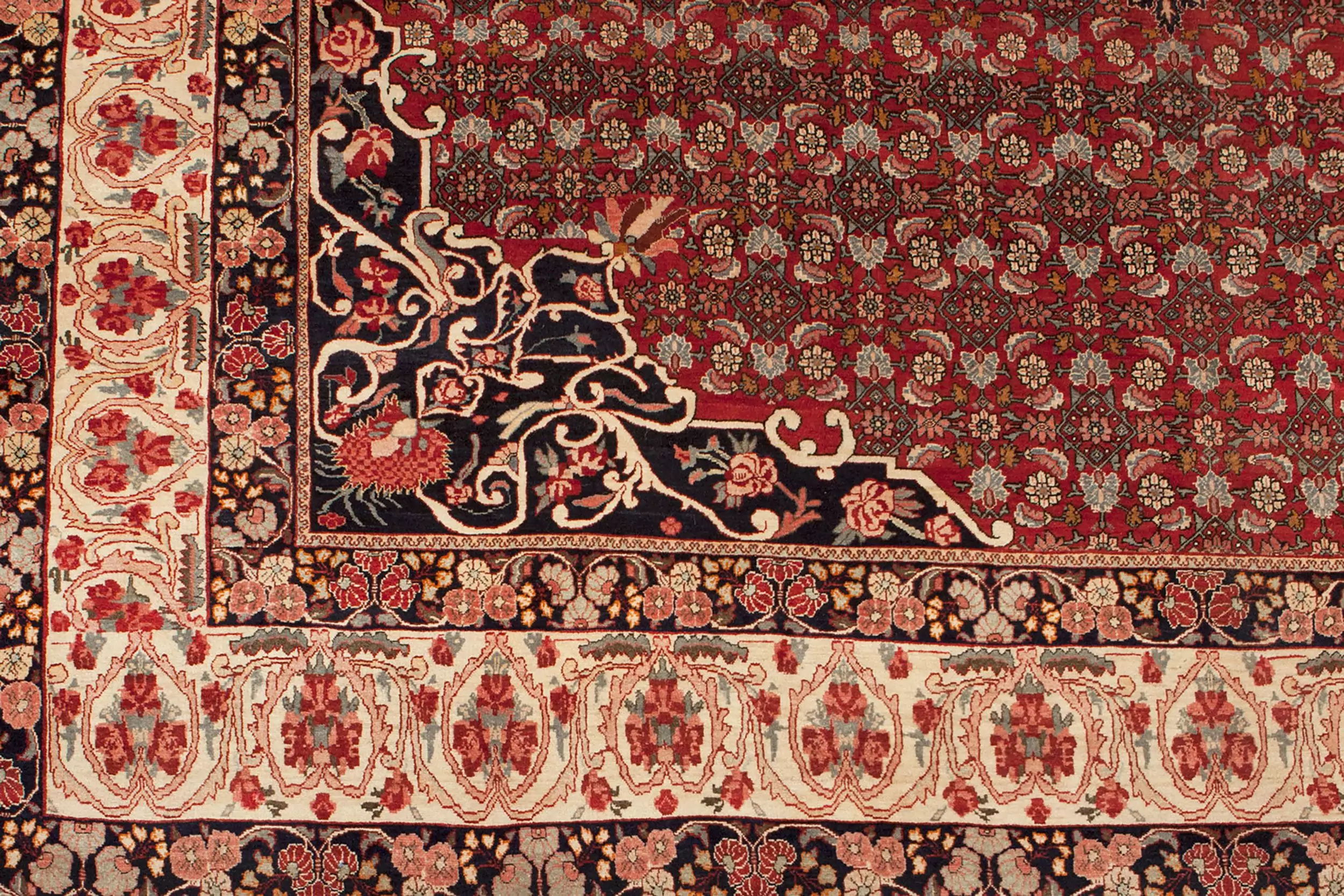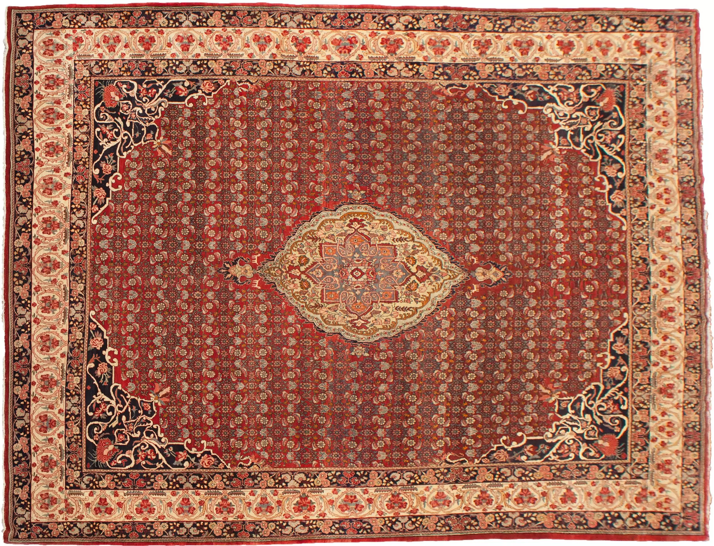 A large vintage Bijar carpet with a strong medallion design and dense wool construction. Rich red tones with cream and blue details make this an ideal centrepiece for formal living or dining spaces.