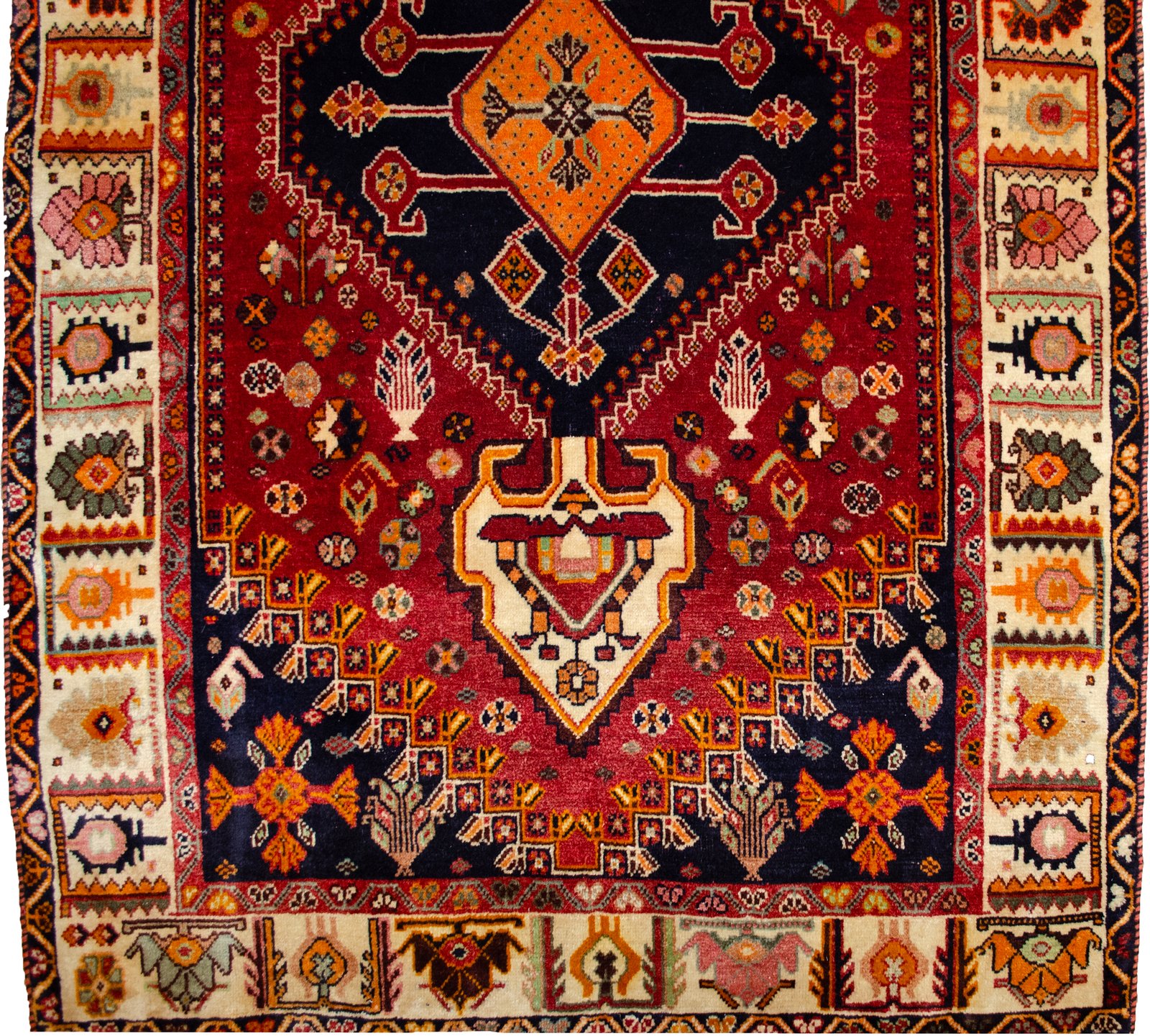 The rug’s deep red background radiates warmth and creates an inviting visual depth, serving as the perfect backdrop for its intricate and balanced design. At the center lies a bold lozenge-shaped medallion in dark blue and orange, carefully woven to reflect traditional Persian geometry while drawing the viewer’s eye with its clarity and contrast.