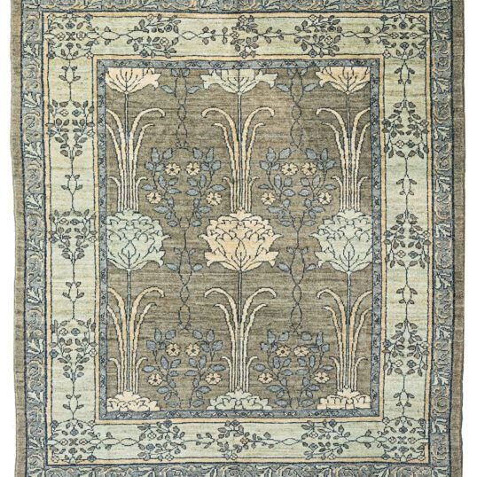 This exceptional hand-knotted rug pays homage to Charles Voysey, one of the most influential figures of the Arts and Crafts movement. Meticulously crafted using traditional knotting techniques, this piece embodies both historical reverence and modern refinement, making it a true heirloom-quality textile.