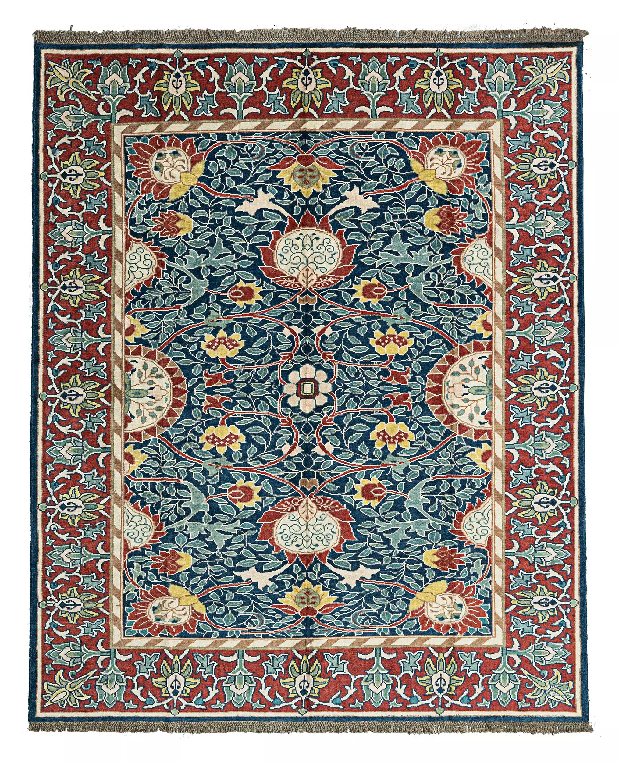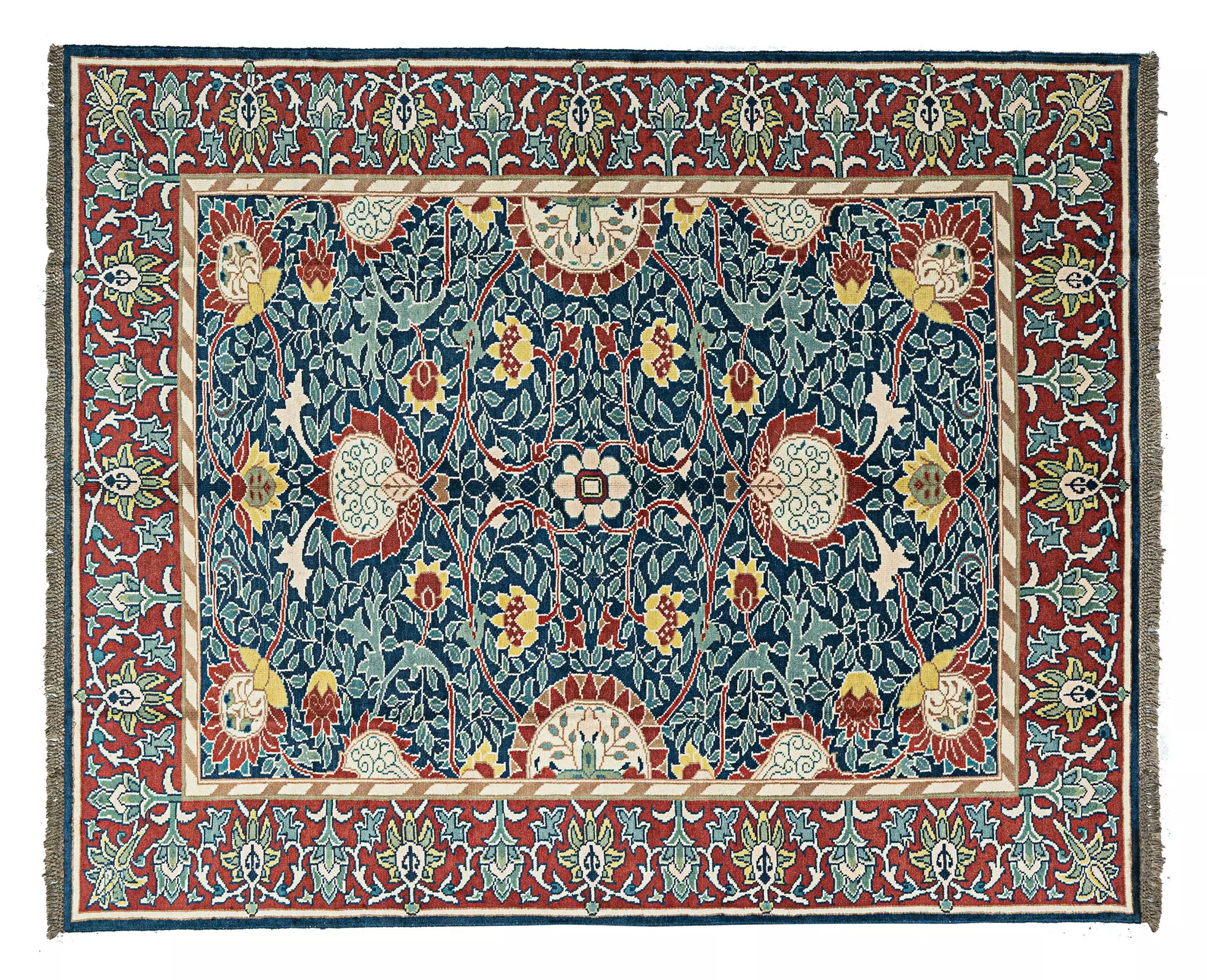 William Morris (1834–1896), a pioneer of the British Arts and Crafts Movement, was known for his reverence for nature, bold use of color, and commitment to quality craftsmanship. Though he admired Persian carpets, he preferred to use the Turkish (Ghiordes) knot in his own hand-knotted designs, typically woven at a density of 25 knots per square inch. This rug reflects that same approach, showcasing both floral elegance and technical precision.