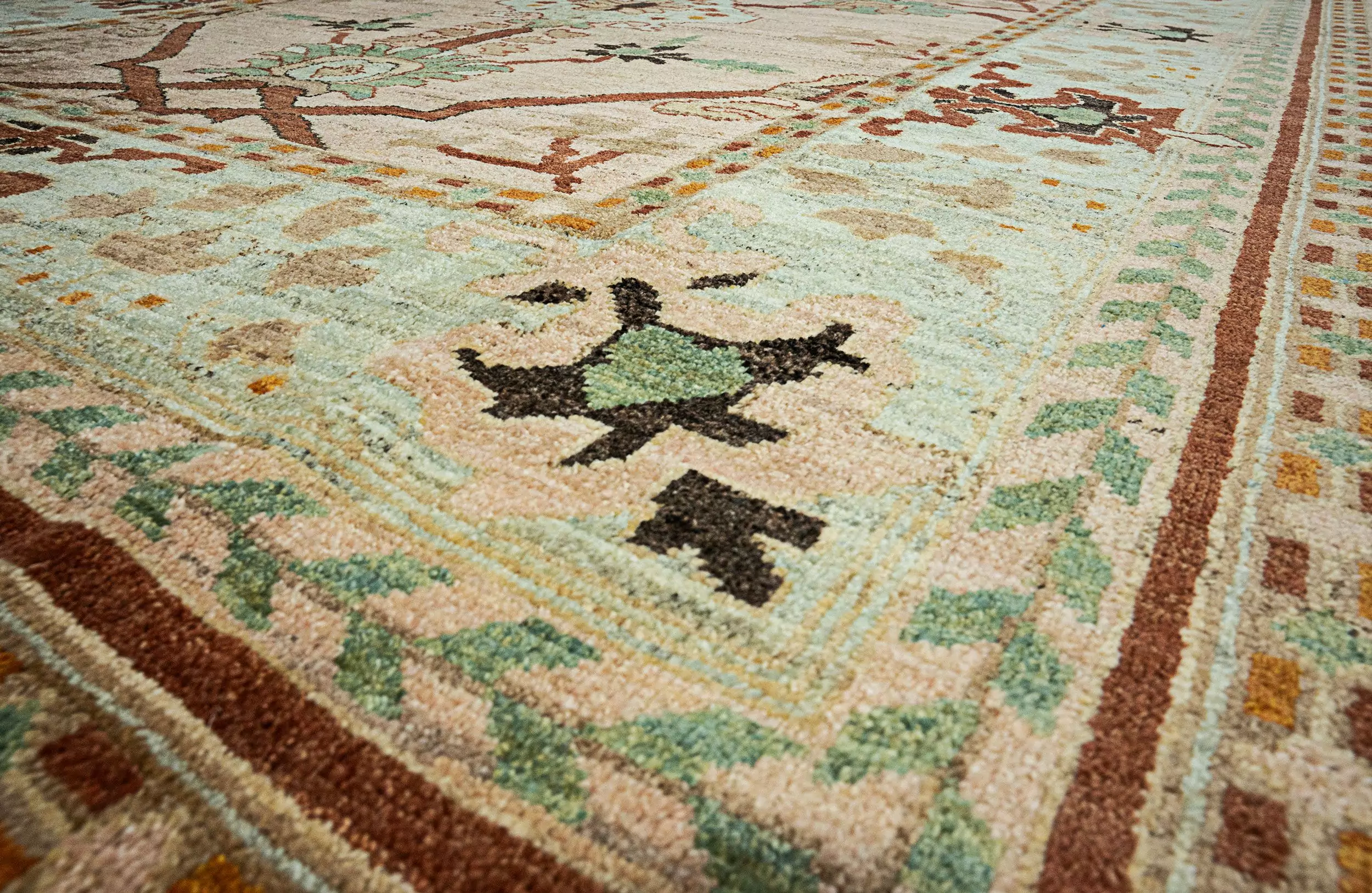 A standout feature is the aqua green border, which elegantly contrasts the central field while maintaining harmony through branching forms that extend into the frame. This thoughtful continuity makes the composition feel both balanced and dynamic. Encasing the entire piece are multiple narrow guard borders, which introduce rhythm and formality, gently focusing the eye inward on the main design.