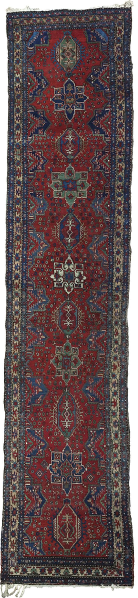 This impressive antique Heriz runner is a powerful statement piece from the rug-weaving villages of Northwest Iran, renowned for their bold, geometric designs and durable construction. This runner boasts a deep, saturated red field, a colour prized in Heriz carpets for its intensity and decorative flexibility.