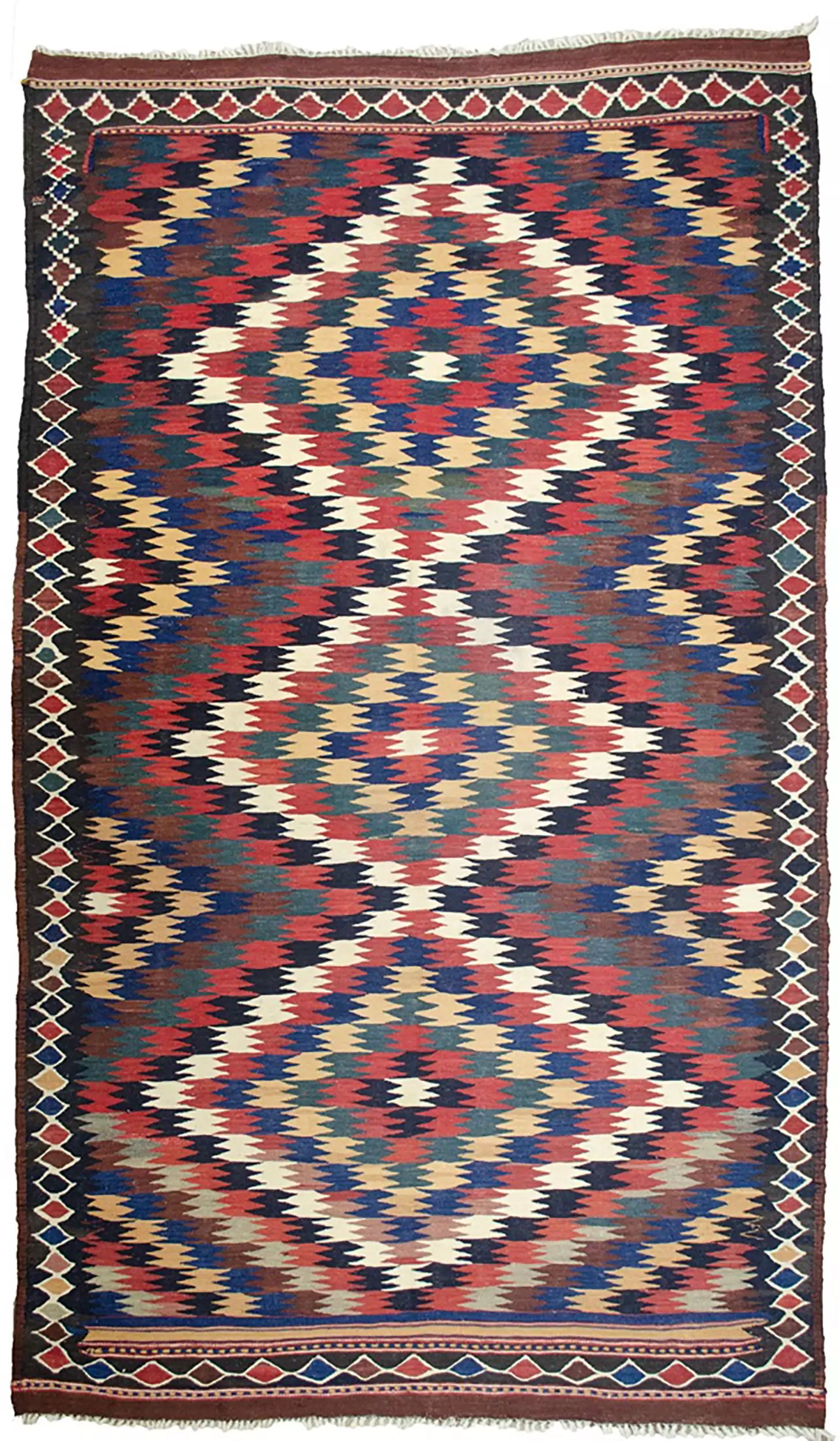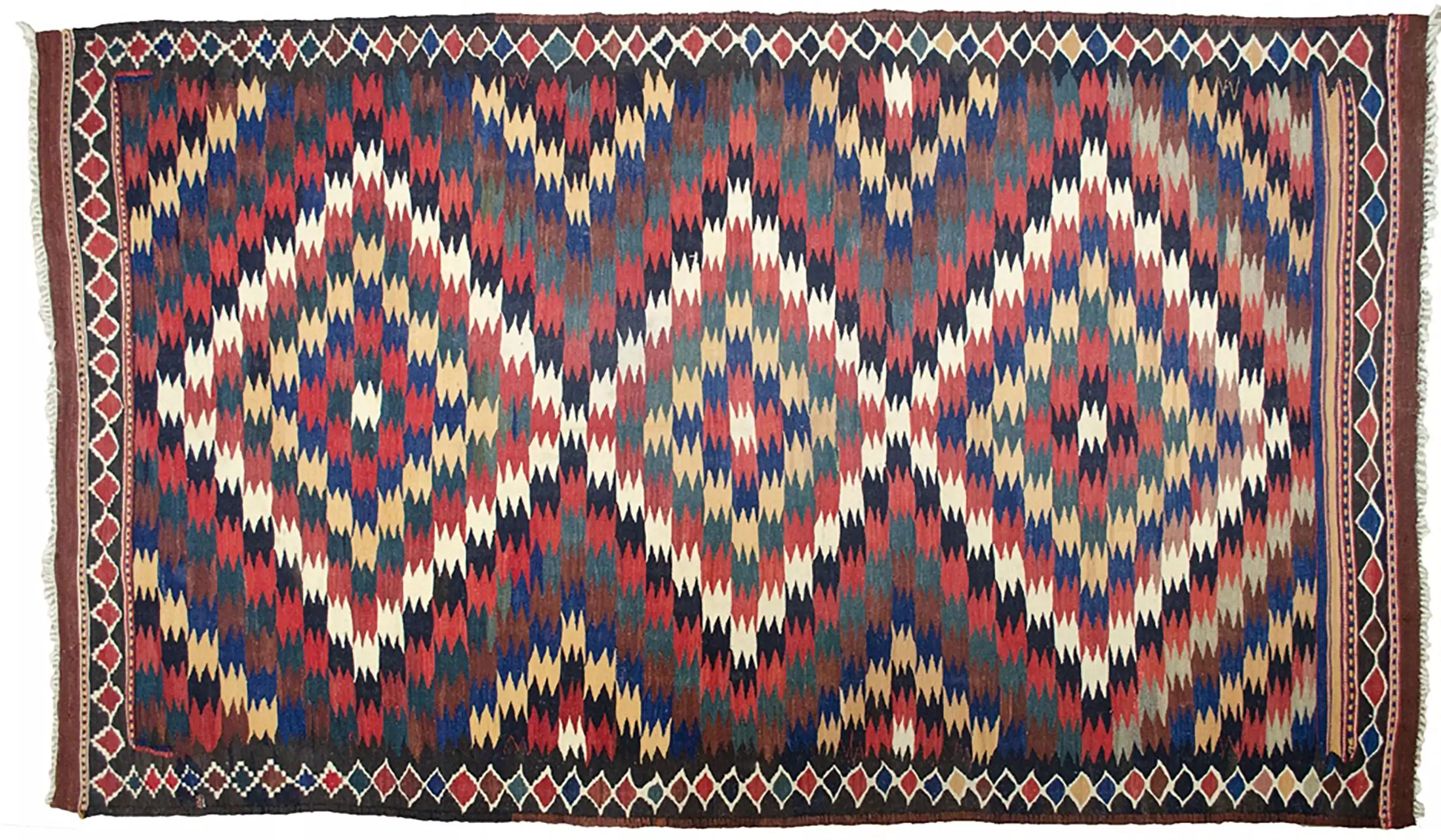 This intriguing antique kilim originates from Varamin, a town in Central Iran known for producing some of the most sought-after flatweaves. Varamin kilims are highly prized by collectors and designers alike—not only because of their limited historical production, but also due to their high-quality craftsmanship and striking, often unusual designs.