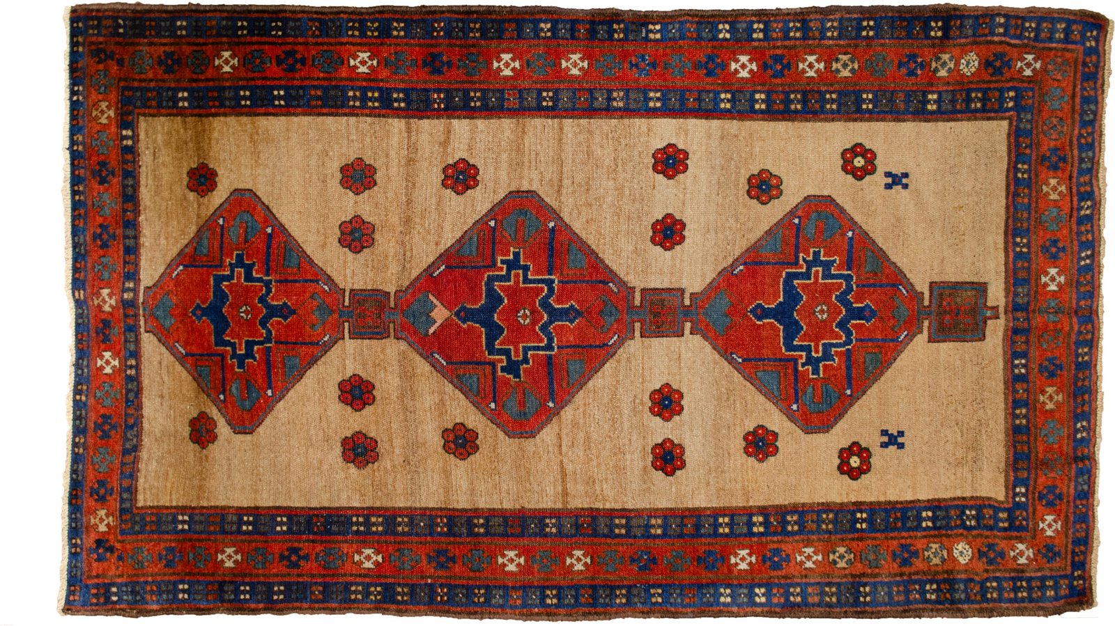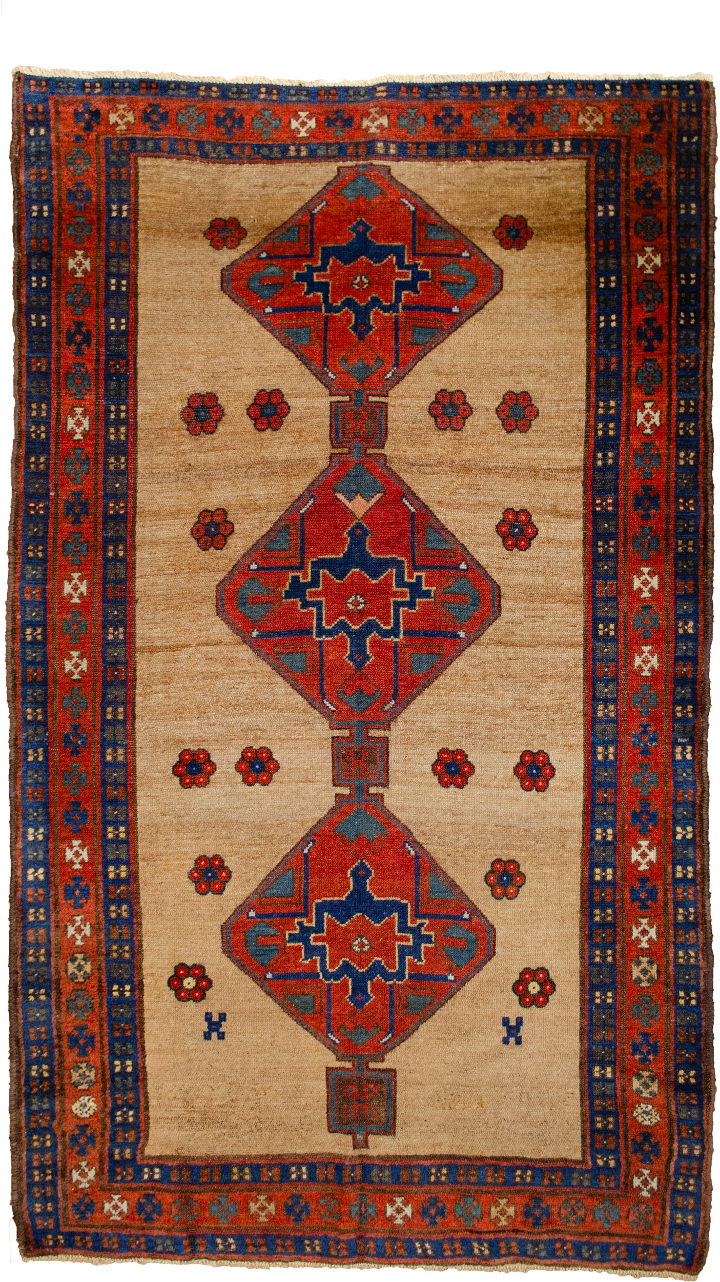 The carpet features a warm camel-colored field, providing a natural and earthy base that beautifully anchors the piece. At its heart are three prominently placed medallions, classic in Kurdish design, accompanied by scattered flower heads that add decorative rhythm and balance.