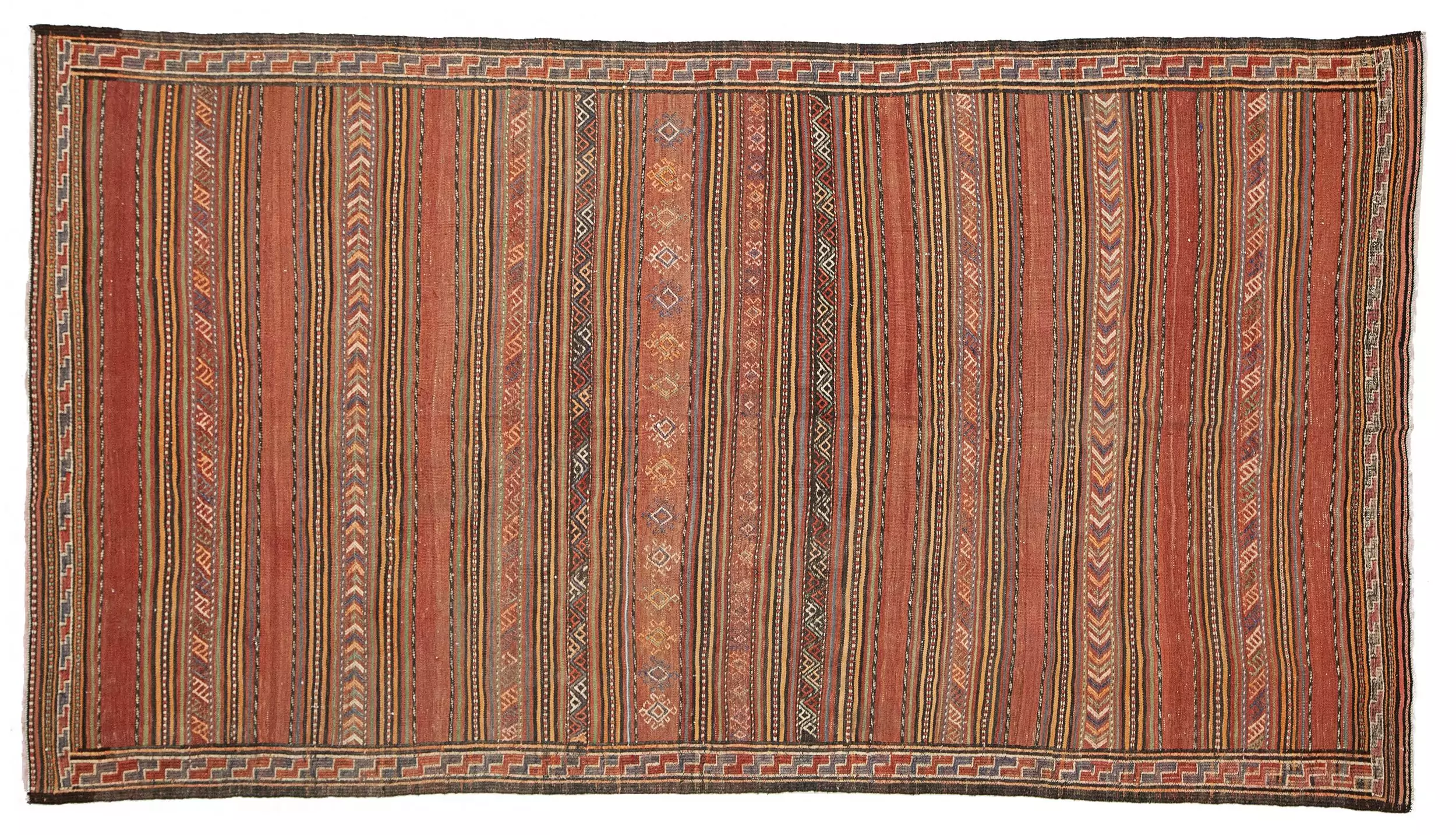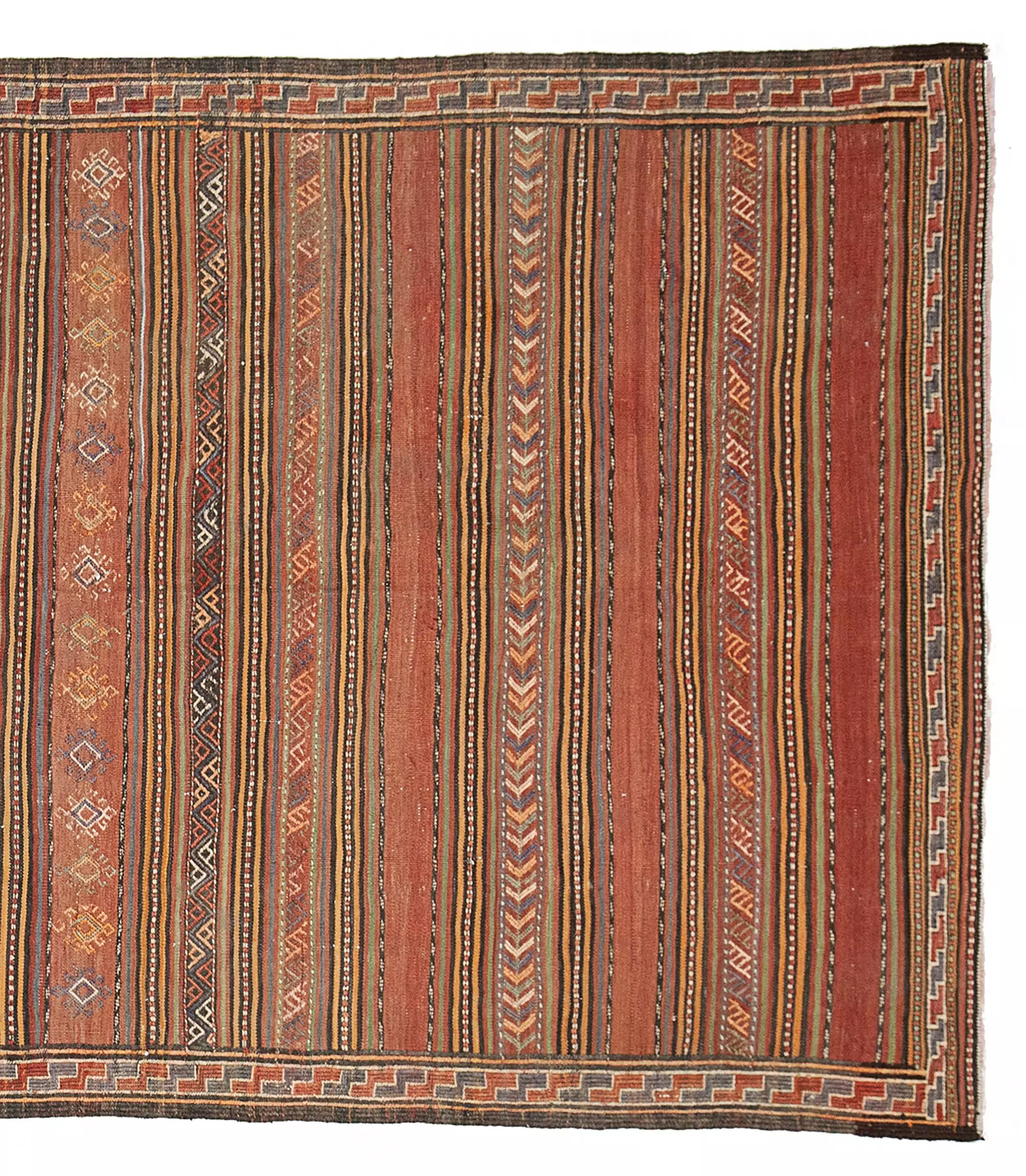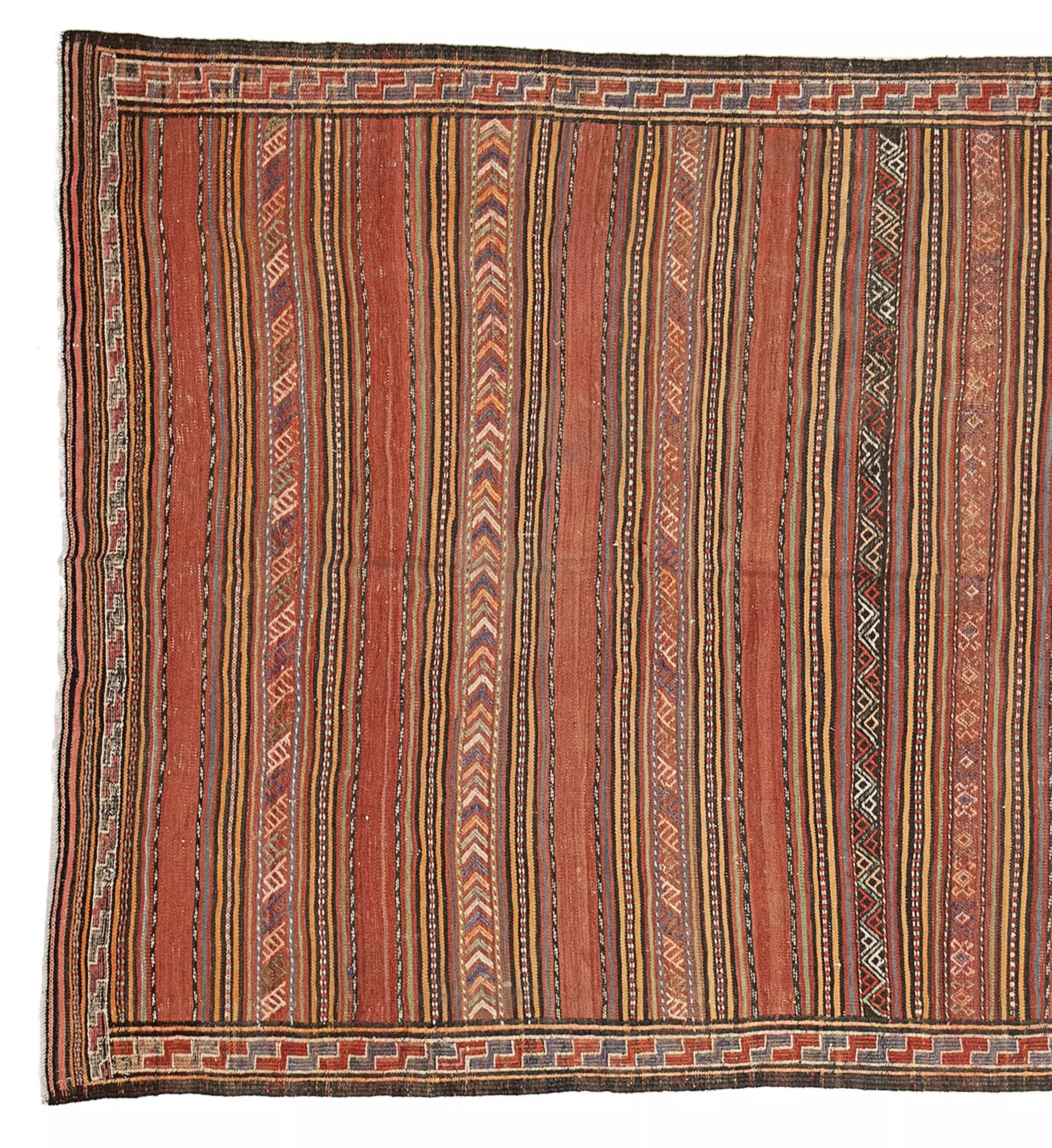 Framing the central bands is a narrow, continuous “S” motif border—a protective and symbolic element commonly used in tribal rugs. This detail, along with the intricate end finishes, reveals the high level of skill and attention that went into the kilim’s creation.