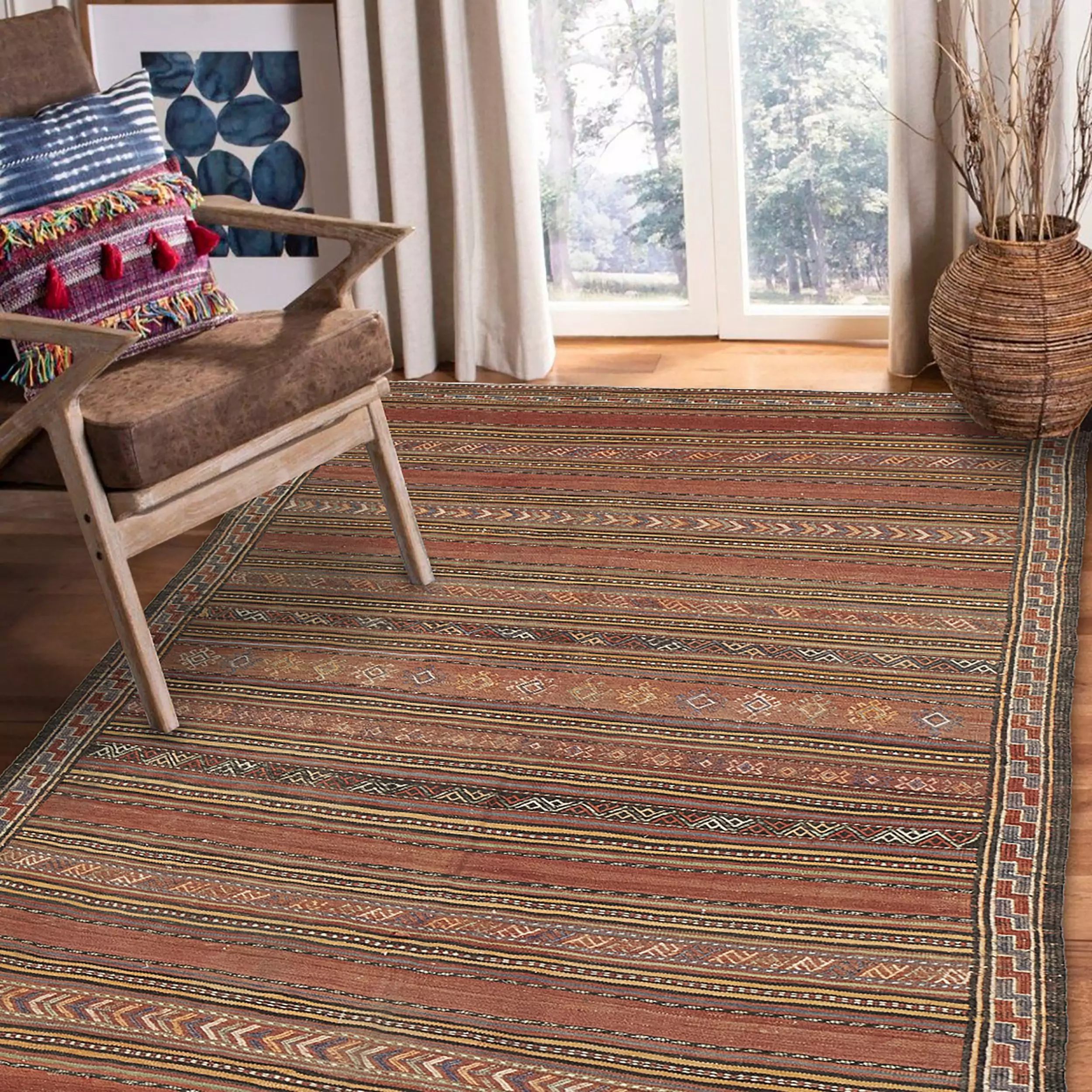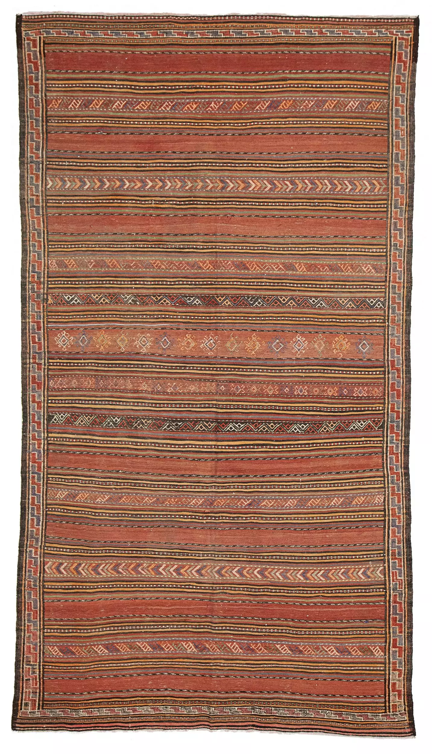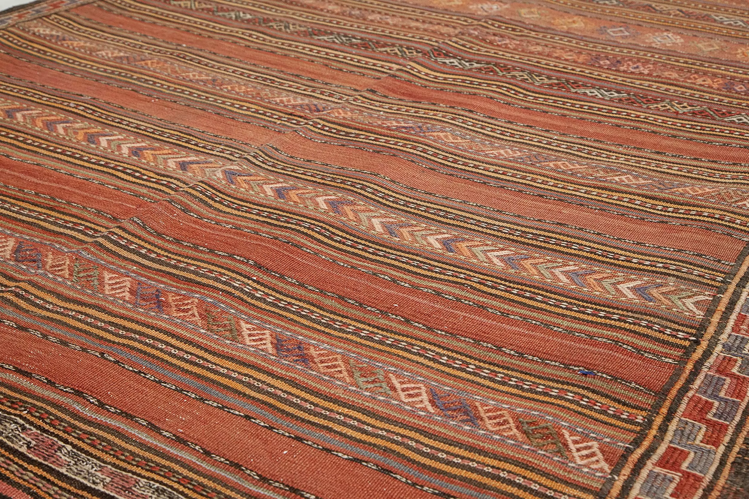 Framing the central bands is a narrow, continuous “S” motif border—a protective and symbolic element commonly used in tribal rugs. This detail, along with the intricate end finishes, reveals the high level of skill and attention that went into the kilim’s creation.