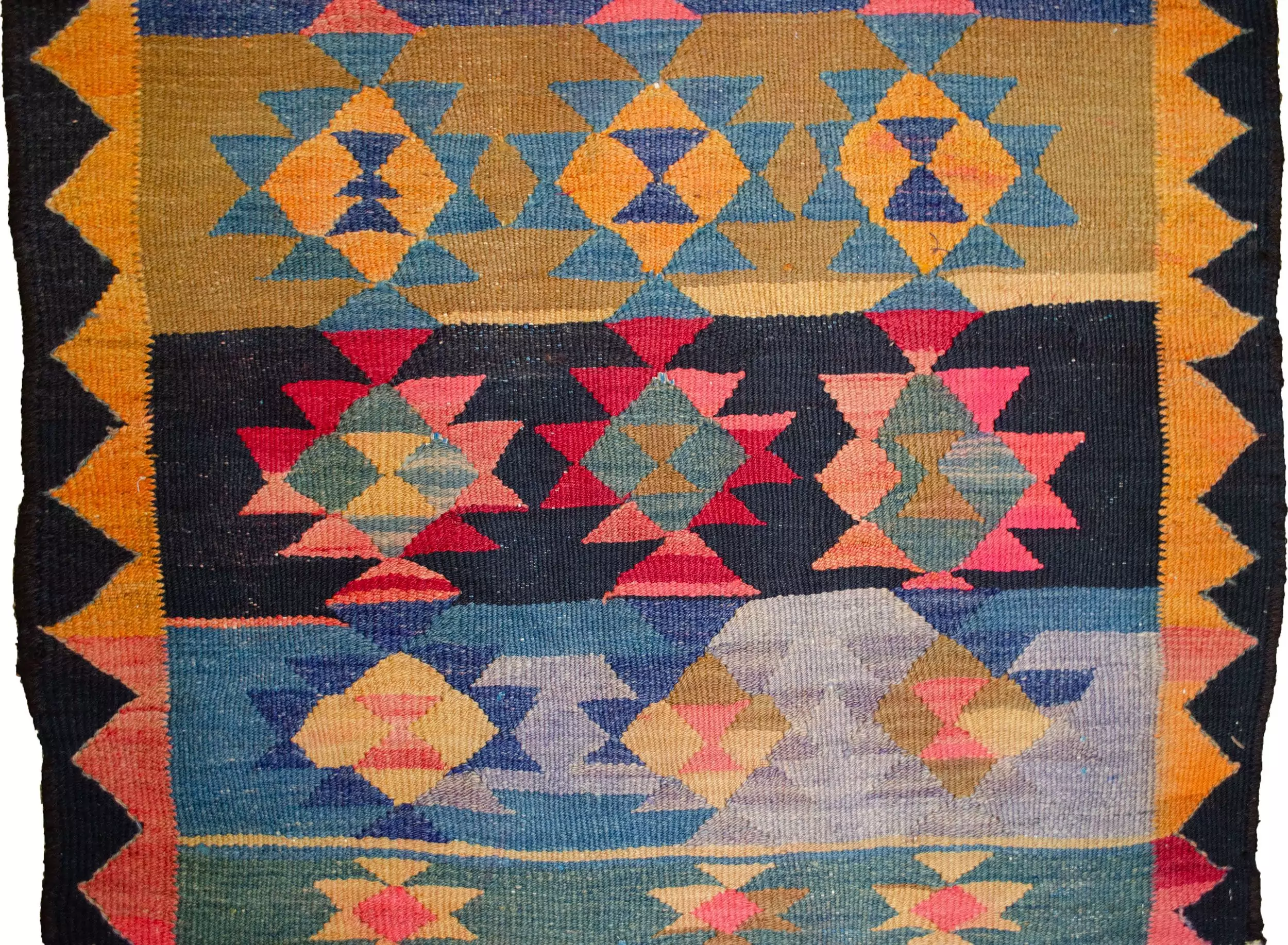 Woven in the tradition of Kordi subgroups—such as Senneh, Bijar, and Harsin—this kilim stands out with its horizontal bands of tribal motifs, each stripe adding rhythm, color, and cultural narrative. The composition is elegantly framed by a bold jagged border in mustard yellow and charcoal grey, creating a dynamic contrast that enhances the visual appeal.