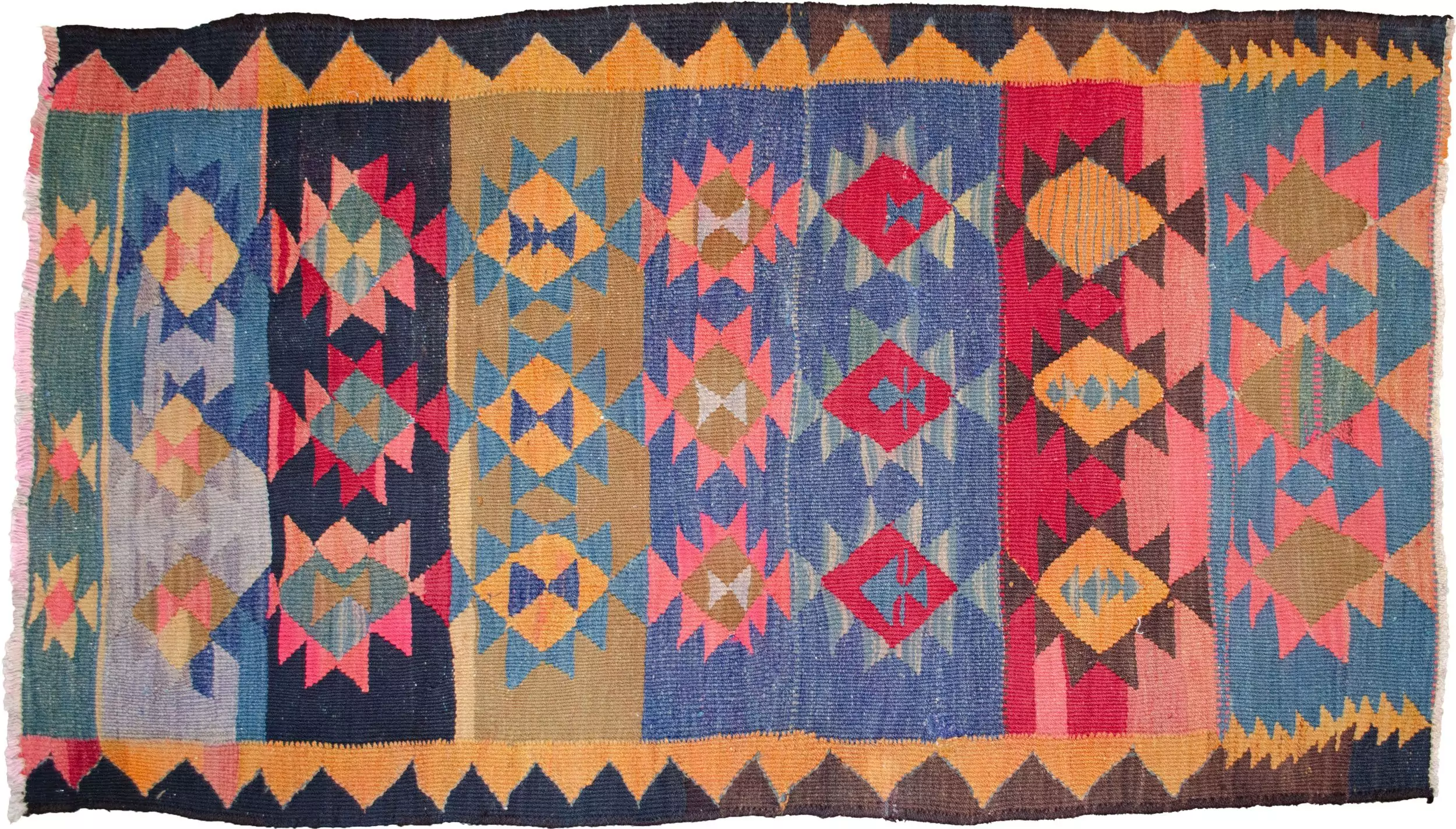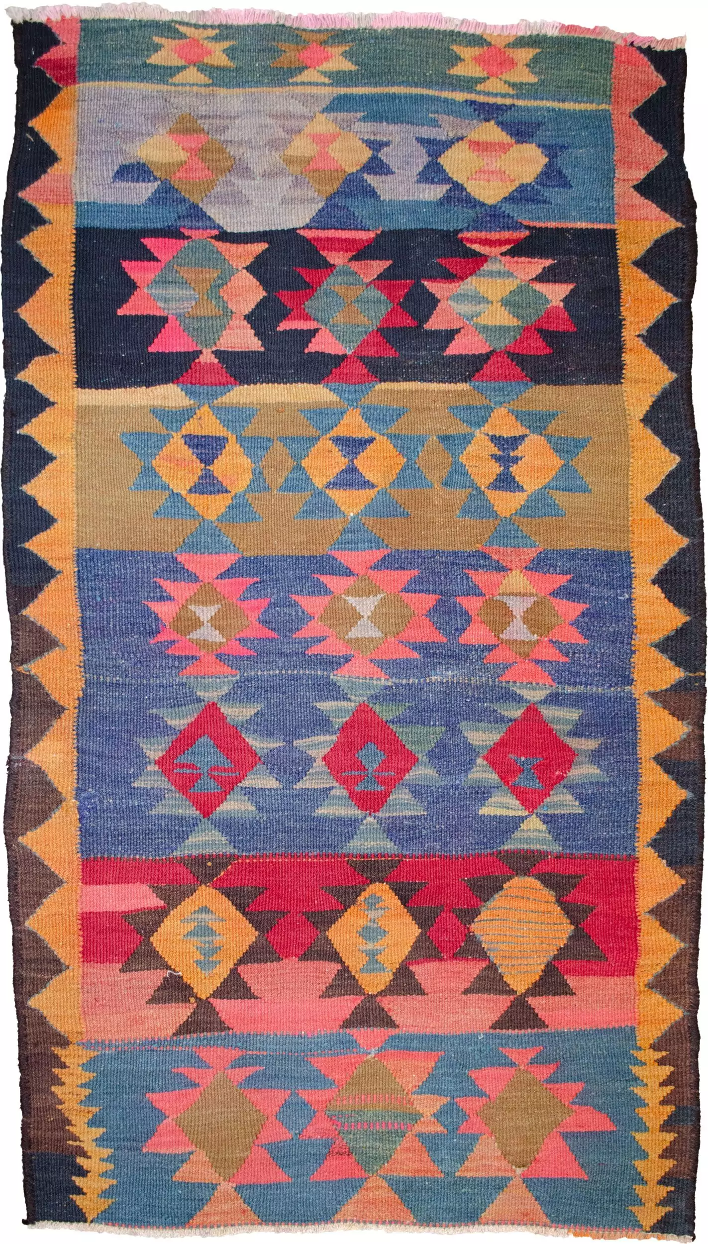 This authentic Kordi kilim is a vibrant expression of tribal weaving tradition, renowned for its exceptional quality, decorative strength, and distinct structure. Heavier than typical kilims, Kordi pieces are known for lying beautifully flat on the floor, making them both functional and striking.