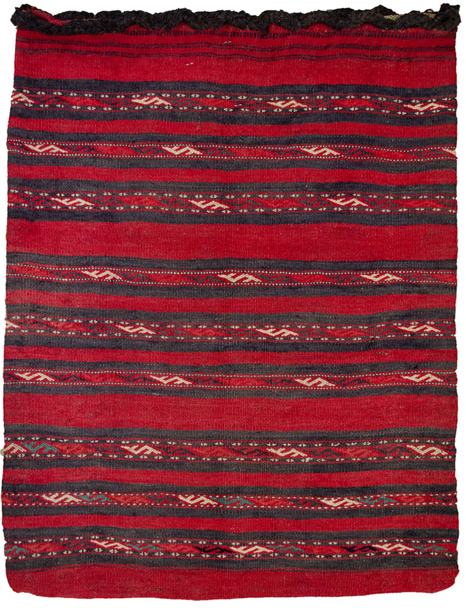 This lovely vintage Turkman Tobreh bag, woven in Northeast Iran, is a fine example of traditional tribal textile art. Tobrehs—nomadic storage or grain bags—were both utilitarian and expressive, often reflecting the identity of their maker through symbolic patterns and colour choices.