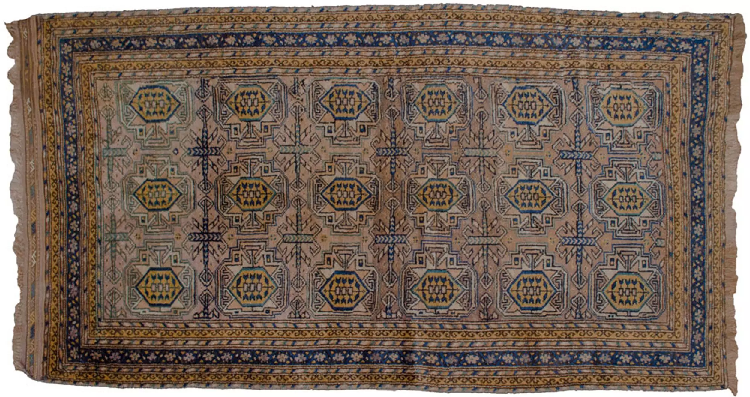 This particular carpet features a striking pinkish-grey ground, an unusual and elegant base that sets it apart from more common colour palettes. Adorning the field are three rows of large elephant foot motifs, woven with balance and boldness—classic symbols in tribal design representing strength and protection.