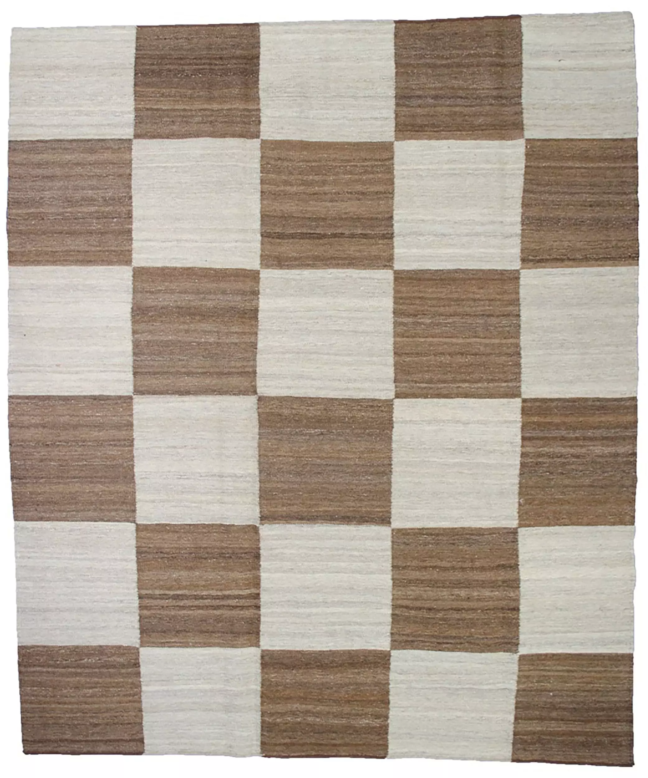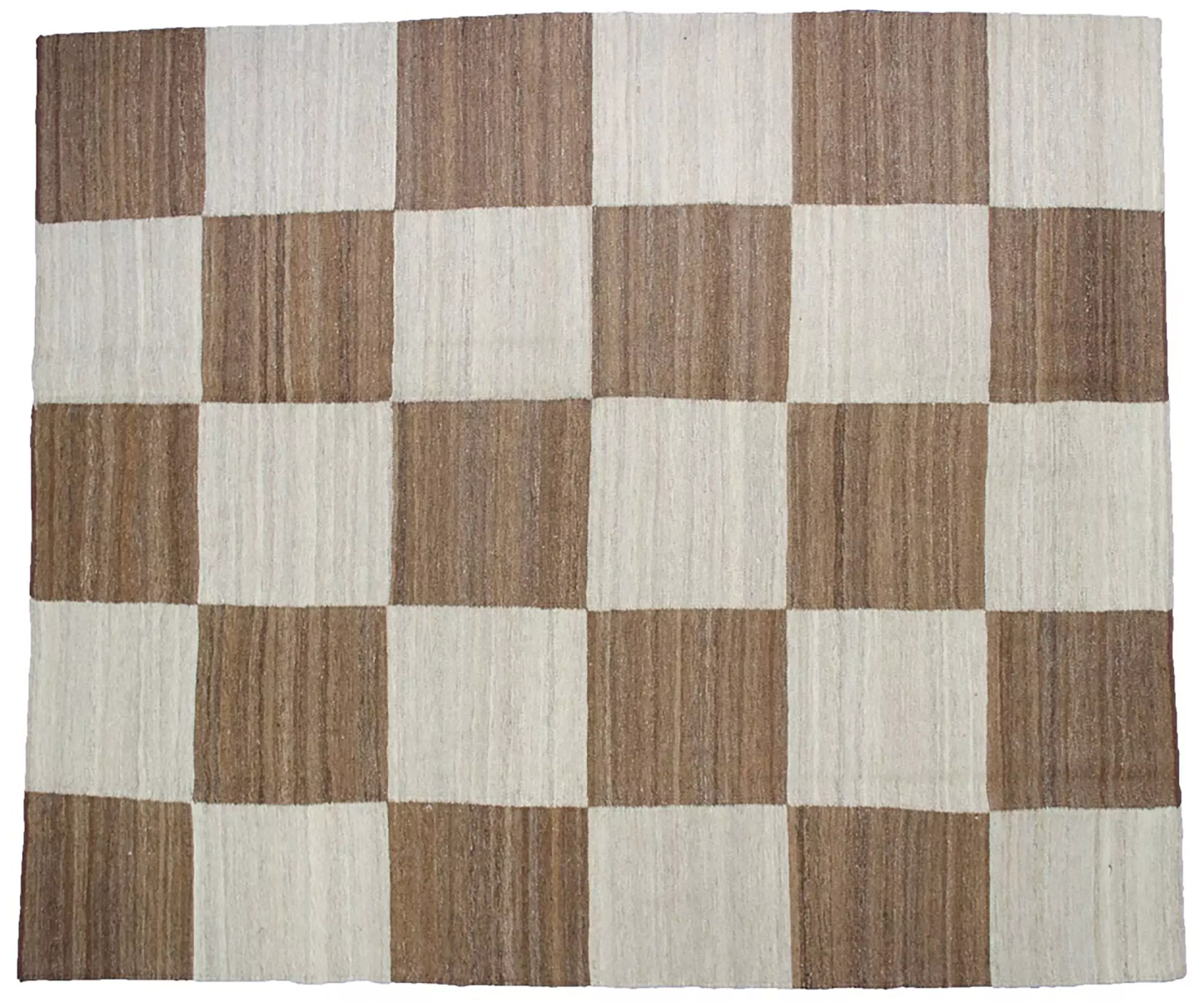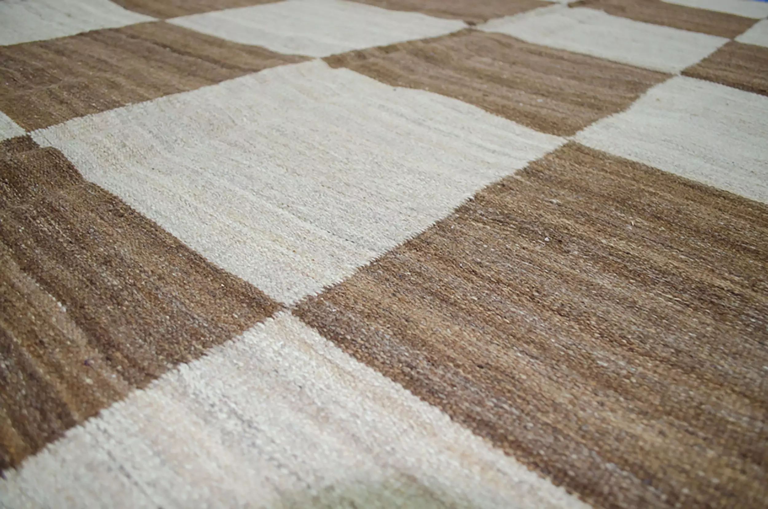 Fine Persian kilim of our own production. Decorative large check design with abrush running throughout giving a wonderful overall effect. The unusual squarish size is not often found in kilims. This is woven with handspun undyed wool and is heavy, so it sits nicely on the floor.