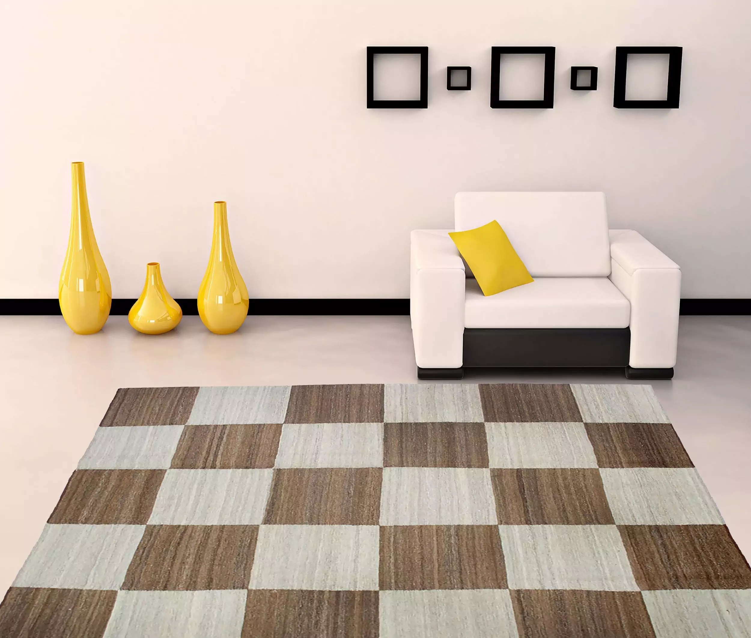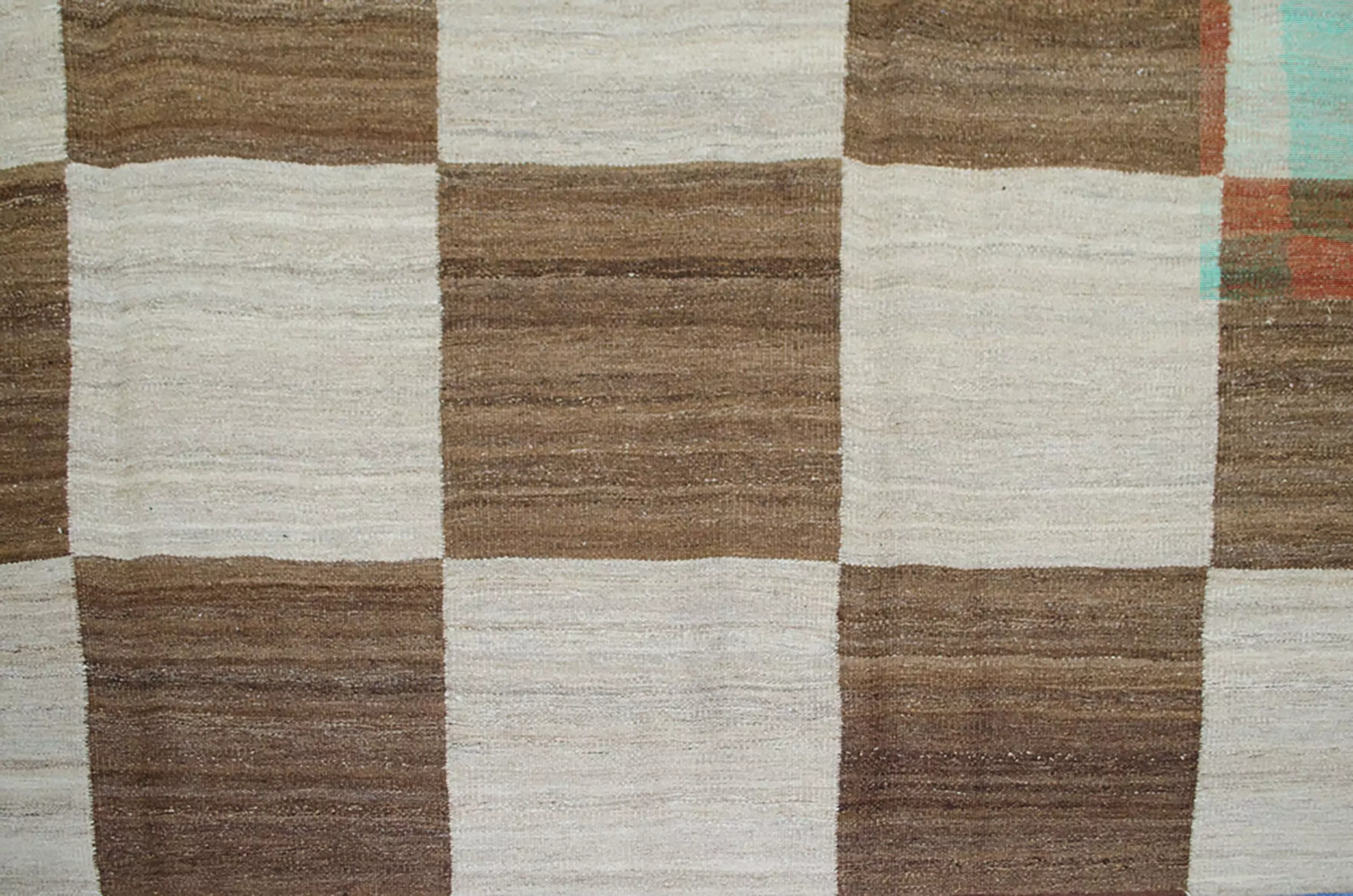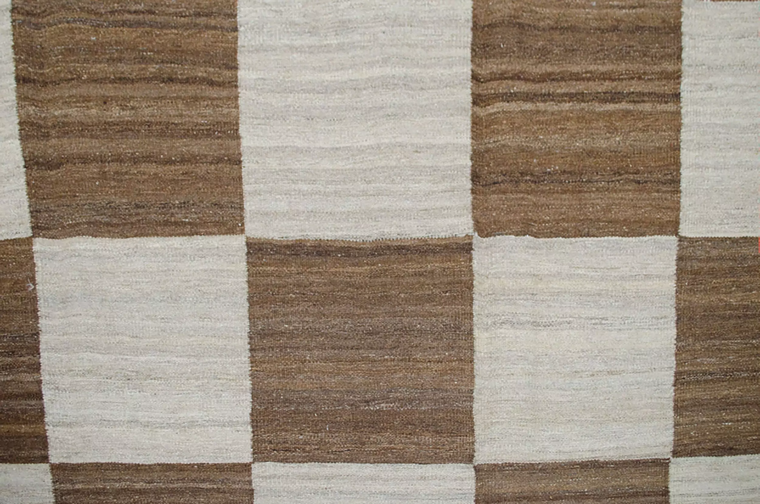 Fine Persian kilim of our own production. Decorative large check design with abrush running throughout giving a wonderful overall effect. The unusual squarish size is not often found in kilims. This is woven with handspun undyed wool and is heavy, so it sits nicely on the floor.