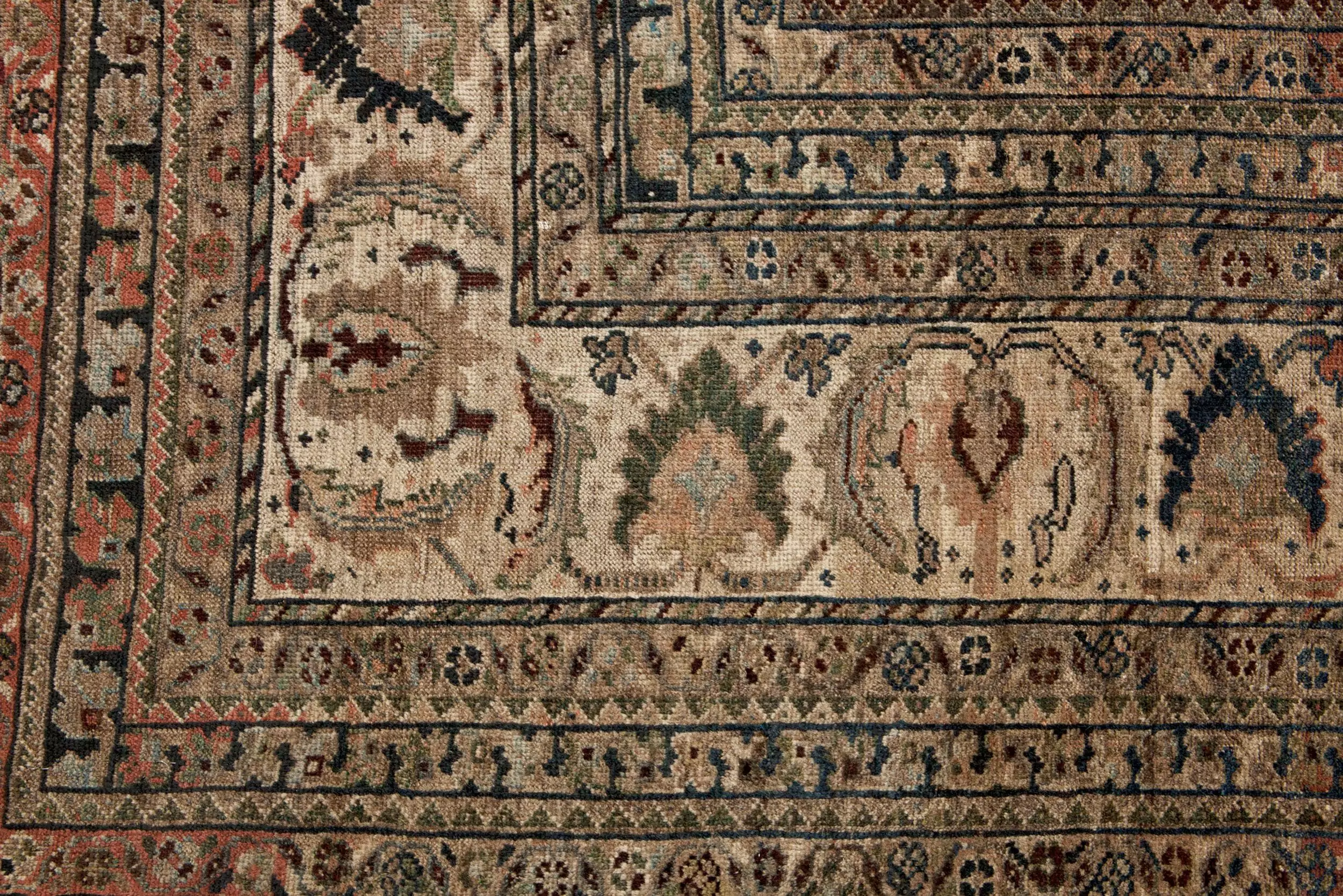 A soft cream main border, framed by complementary secondary borders, provides balance and elegance while enhancing the boldness of the central composition. At one end, a subtle abrash, a natural variation in dye, adds depth, movement, and authenticity, serving as a hallmark of genuinely antique, naturally dyed rugs.