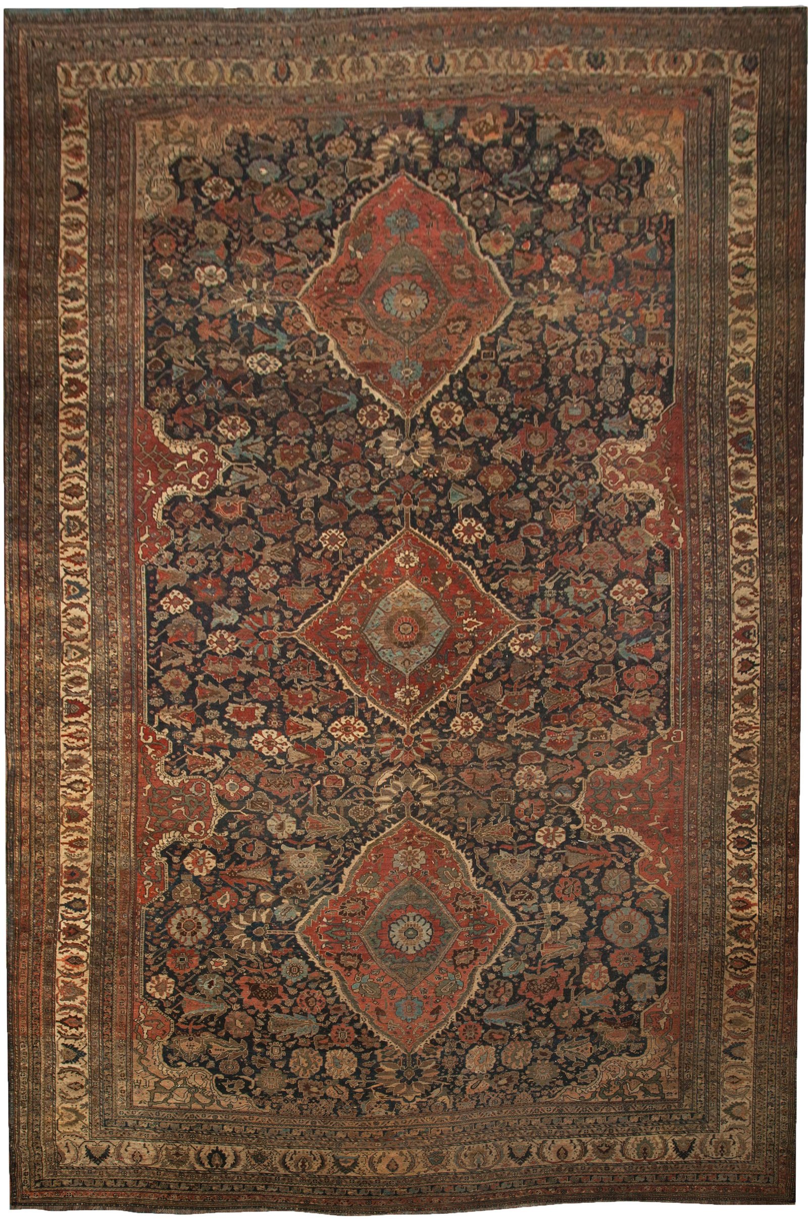 The design features three intricately rendered medallions symmetrically placed on a deep navy blue field, interspersed with stylized floral motifs and tribal emblems. The main cream border is flanked by secondary borders, enhancing the carpet’s visual balance and sophistication. A subtle abrash at one end—a natural variation in dye—adds an authentic dimension of movement and depth, characteristic of genuinely antique rugs.