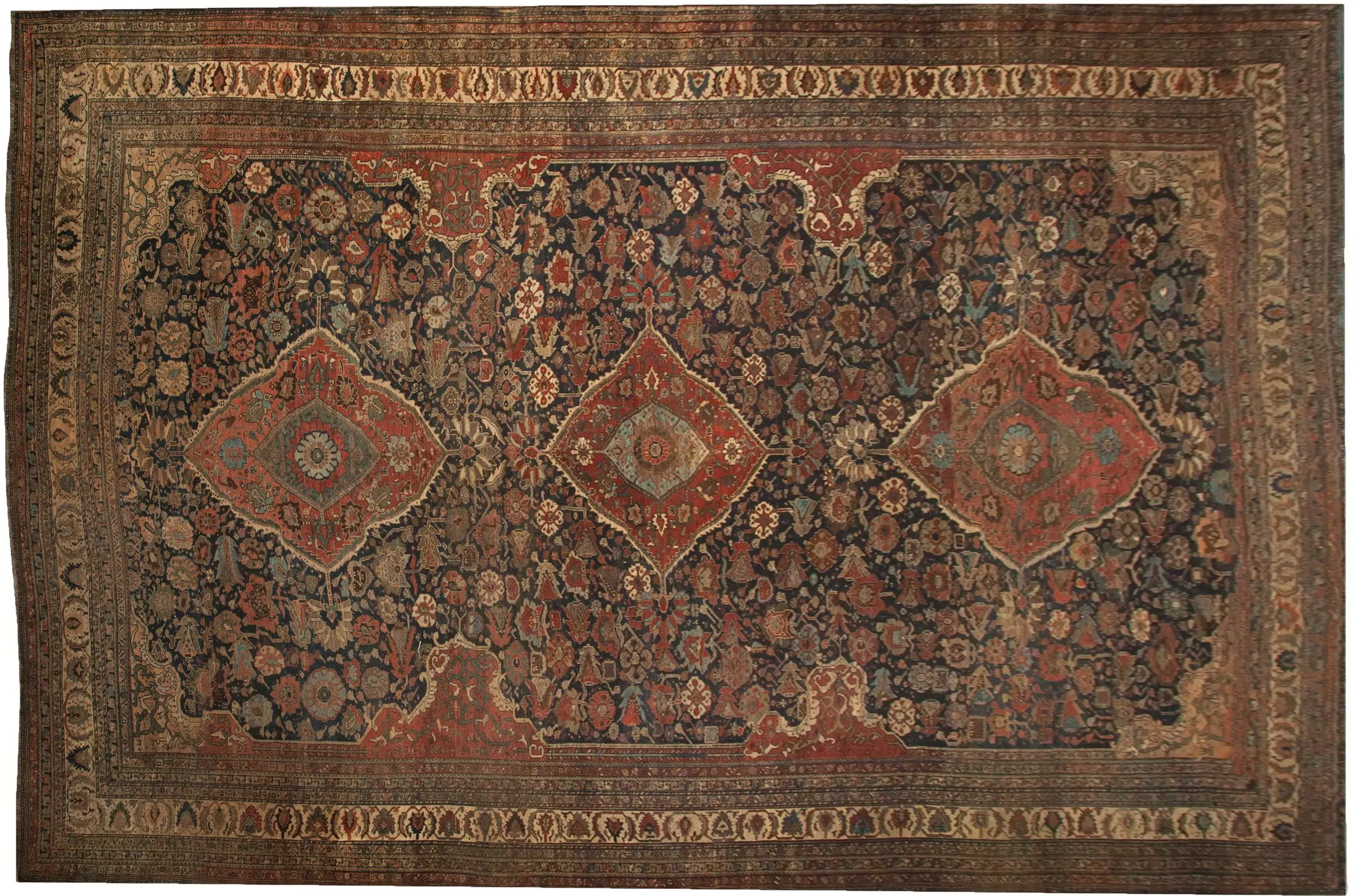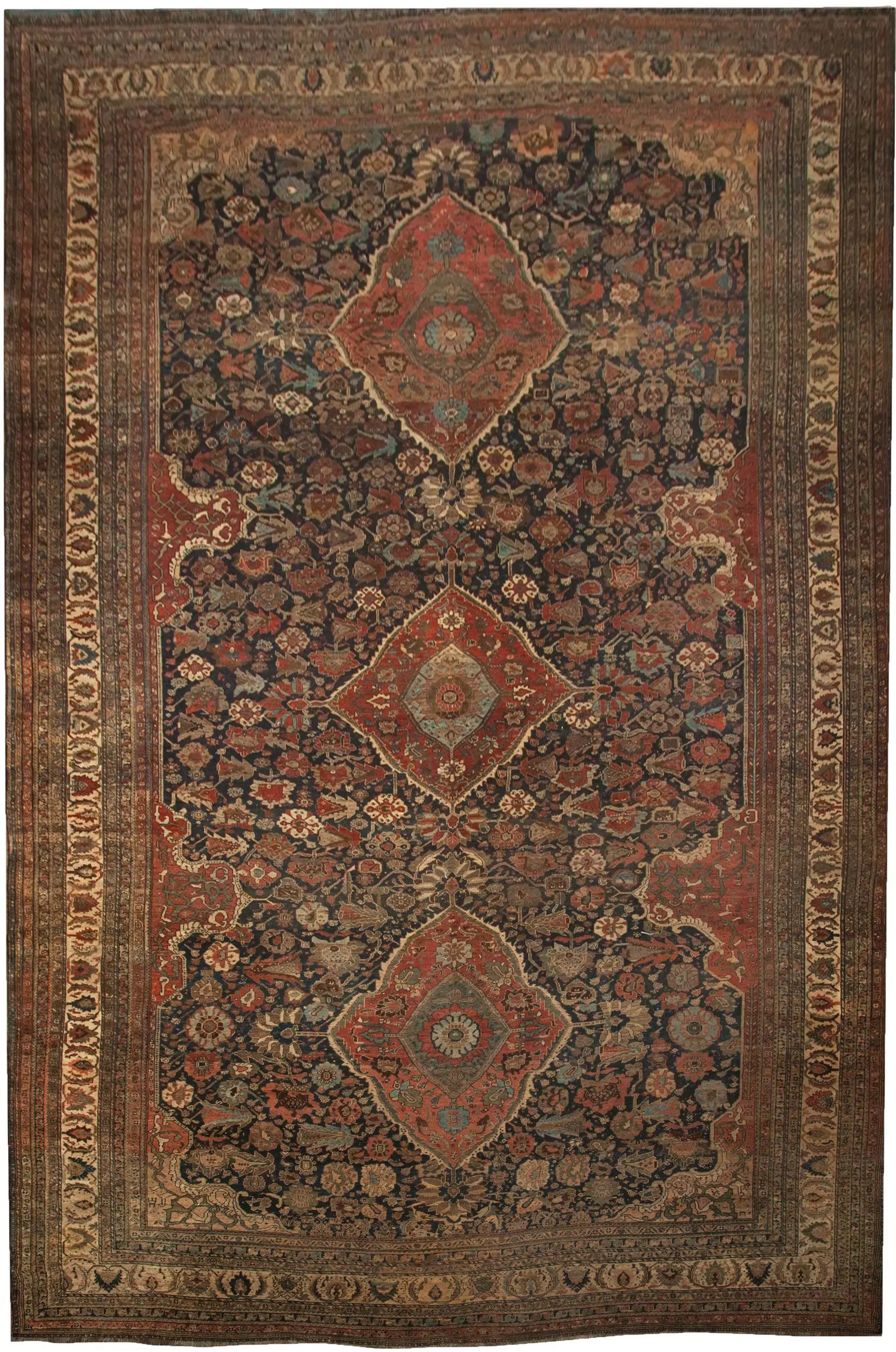 An exceptionally large and rare antique Qashqai carpet from Iran, dating to circa 1880. Featuring a striking triple medallion design on a deep blue ground with rich rust accents, this tribal masterpiece was likely commissioned for a tribal leader and stands as a remarkable collector’s piece.