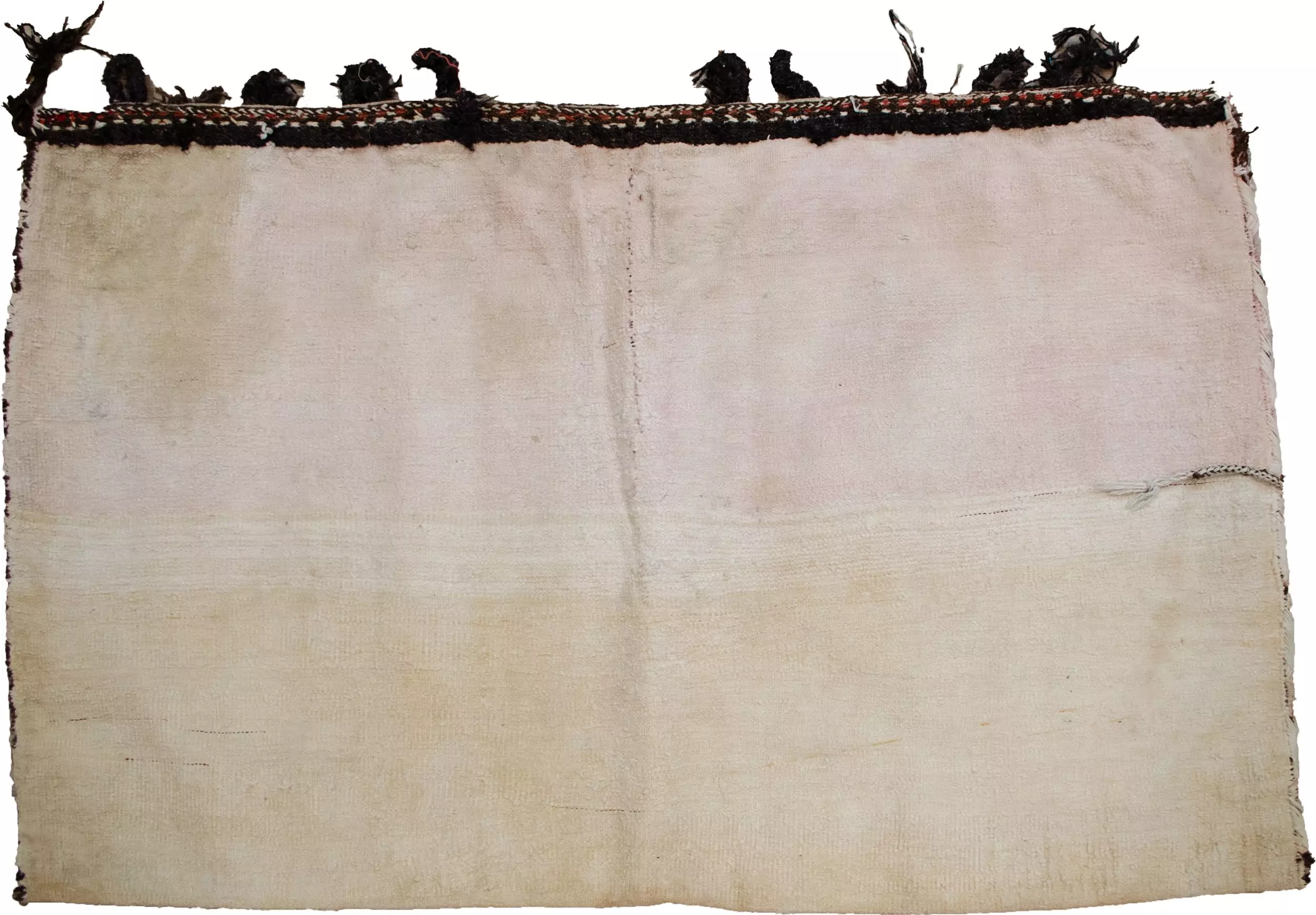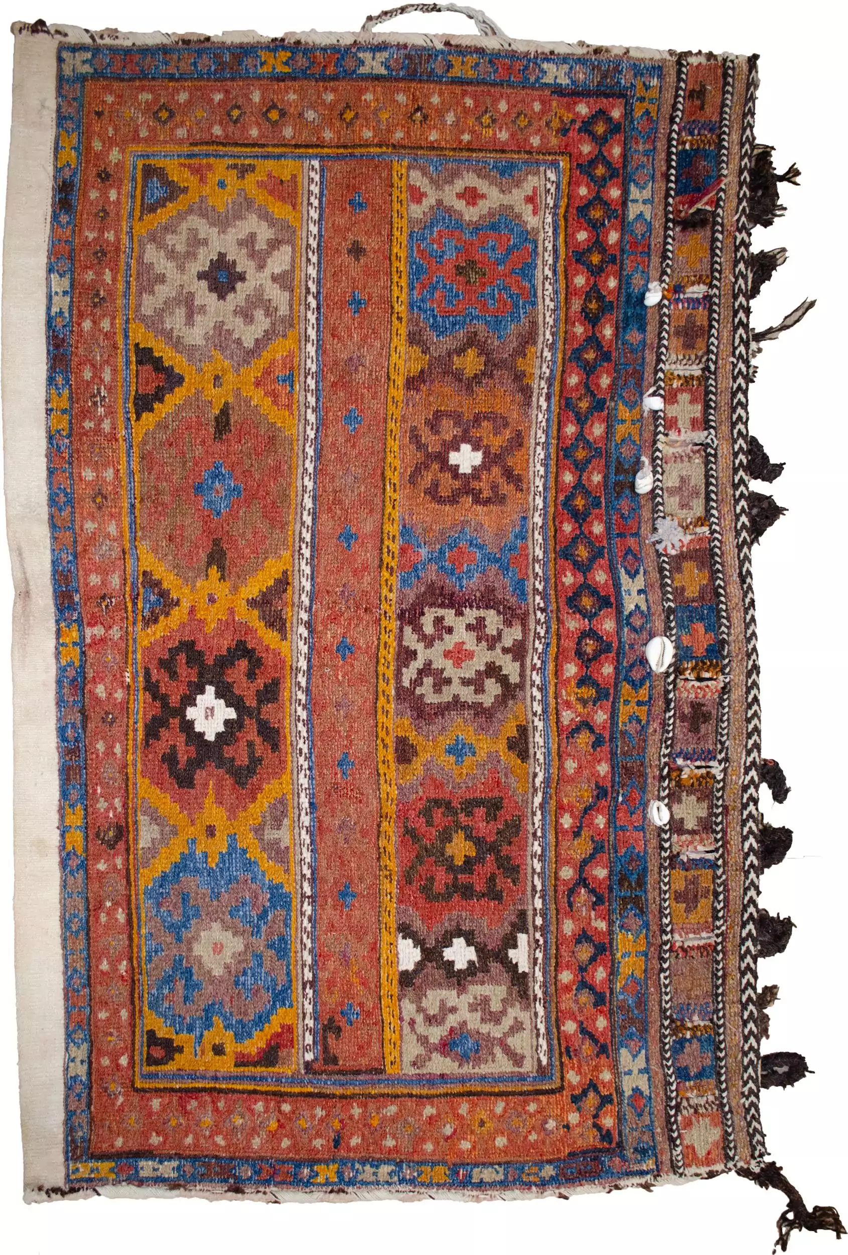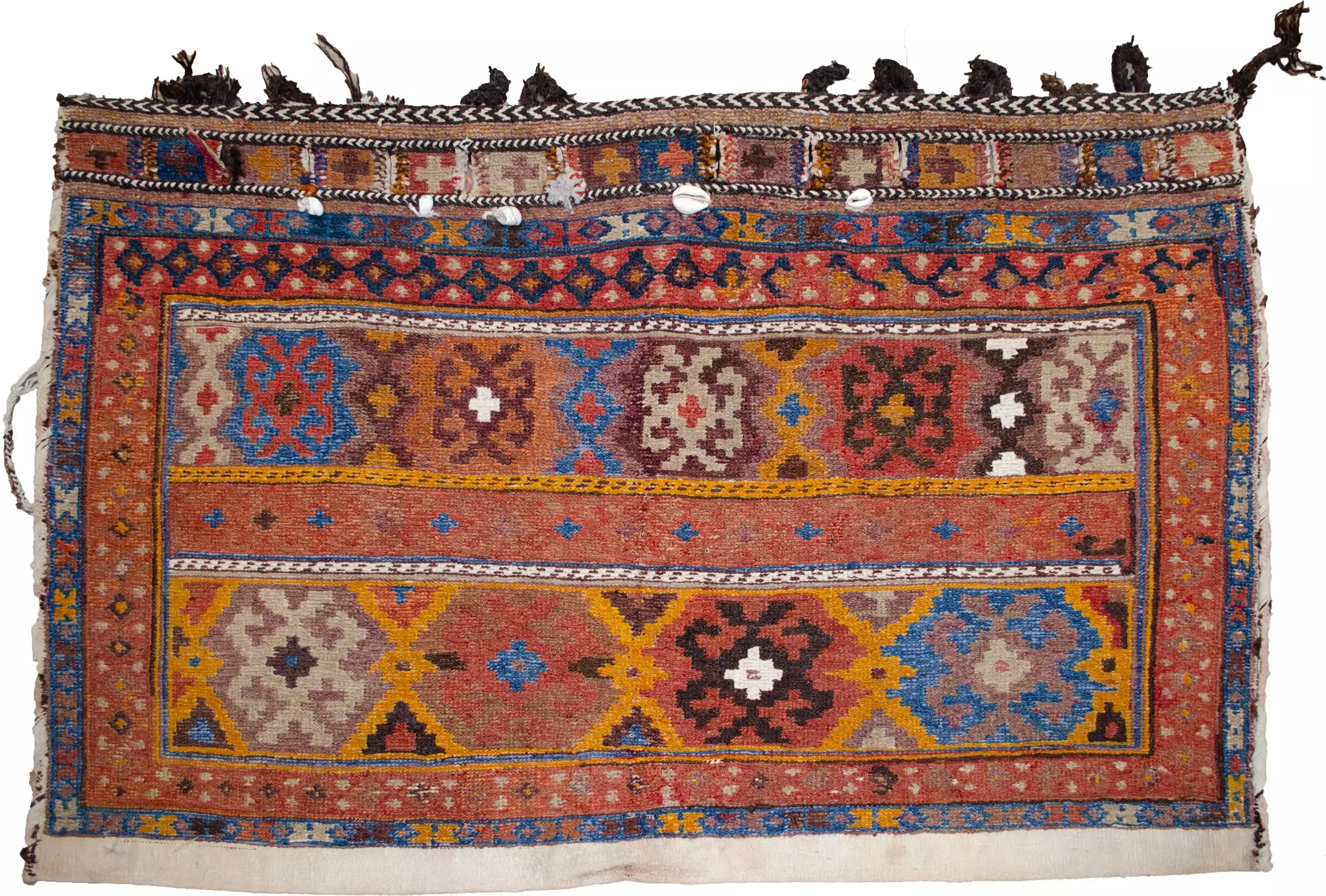 A terracotta inner border frames the design with earthy strength, while the light blue outer border softens the overall look and enhances the visual rhythm. Adding to its rarity, the bag retains its original woven locking tabs, still intact and beautifully preserved. These functional details highlight the intelligence and craftsmanship behind nomadic weaving.