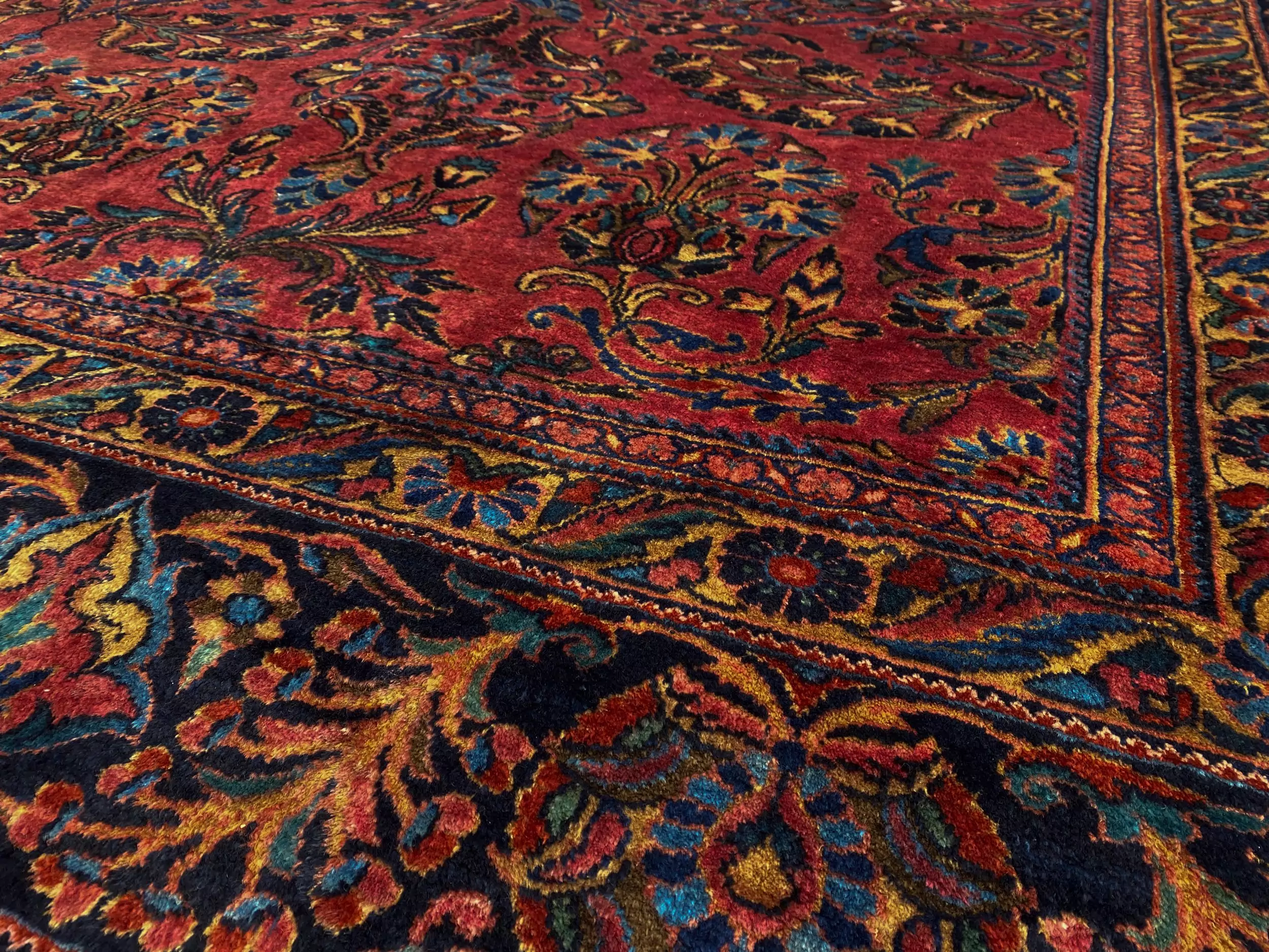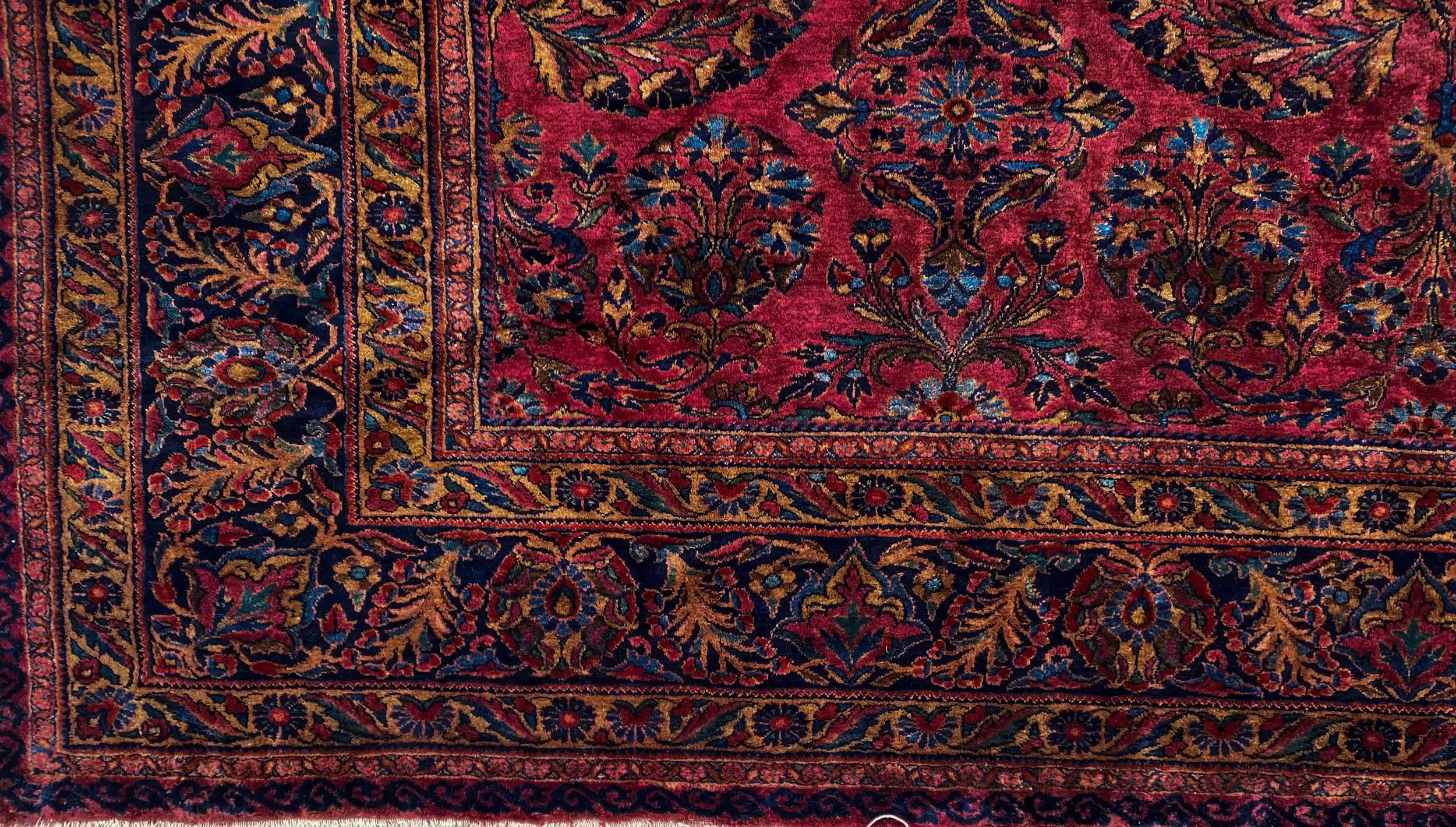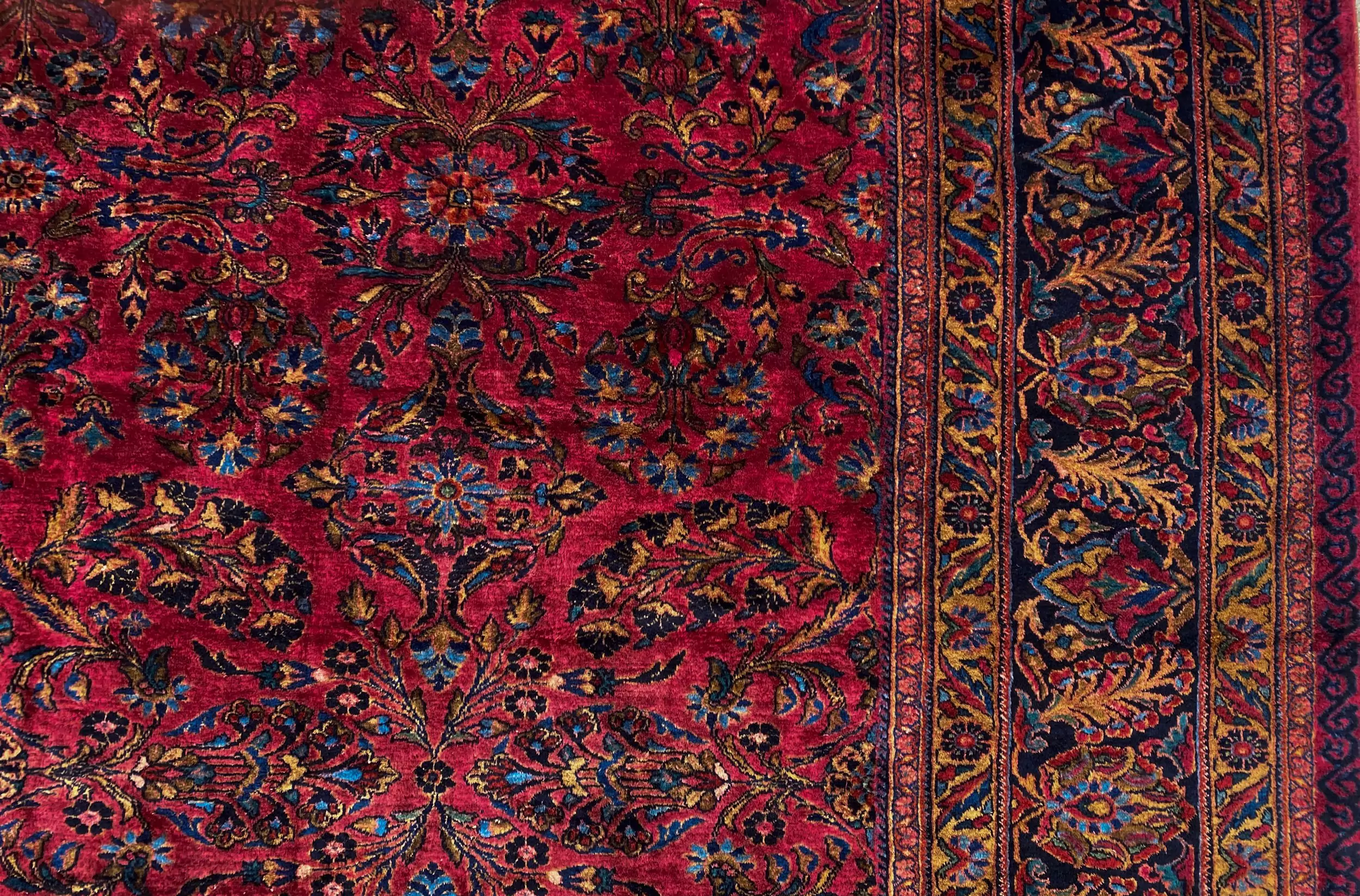 A dark blue floral border frames the field with strength and contrast. This border not only anchors the design but enhances the vibrancy of the red ground, creating a harmonious interplay between warm and cool tones. Subtle variations from natural vegetable dyes lend the palette softness and depth, giving the carpet a mature and dignified character.