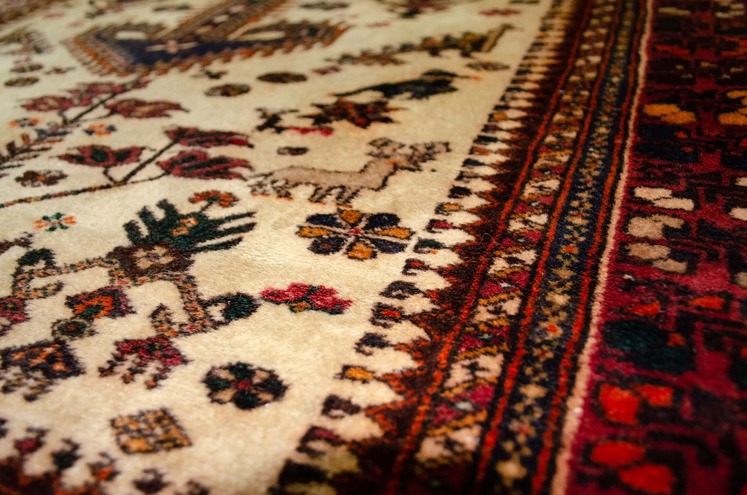 Field: Cream with tribal motifs – peacocks, deer, shrubs, flower pots