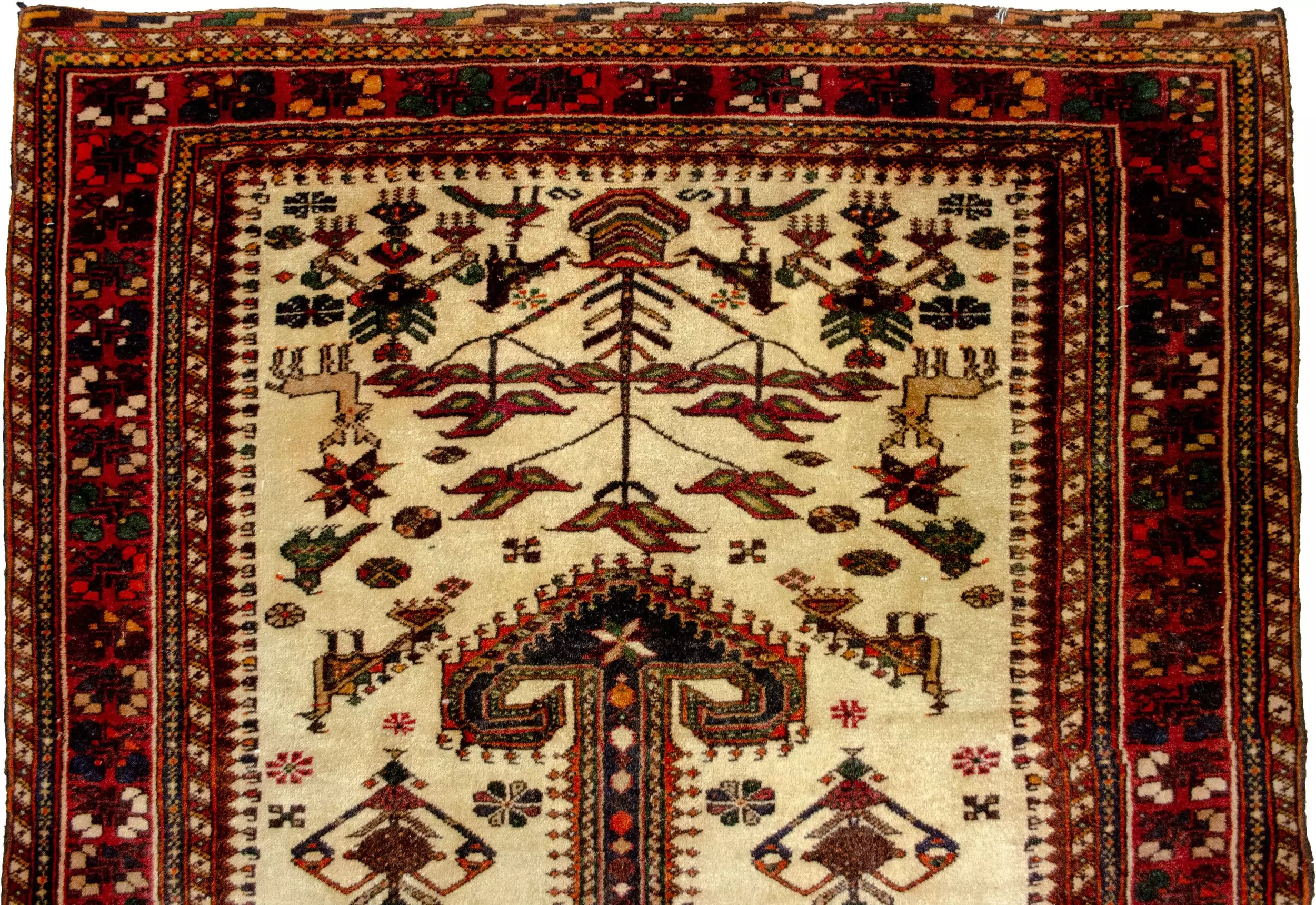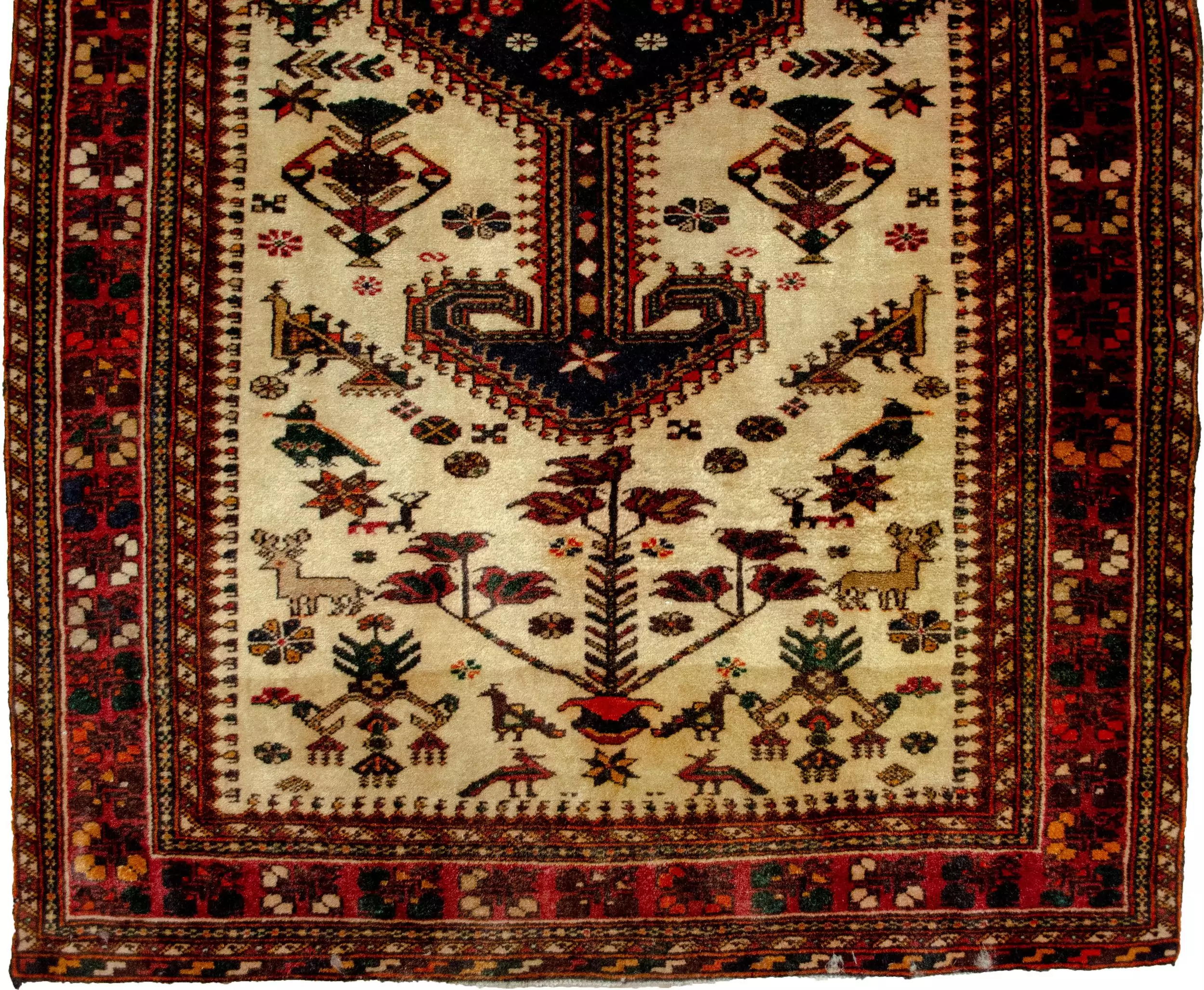 This particular piece is a standout example of Nasrabad weaving, showcasing the classic double anchor medallion—a distinctive design element typical of the area. Set on a cream ground, the rug is brought to life with charming, stylized motifs including peacocks, deer, shrubs, and flower pots—each contributing to its warm, whimsical character.