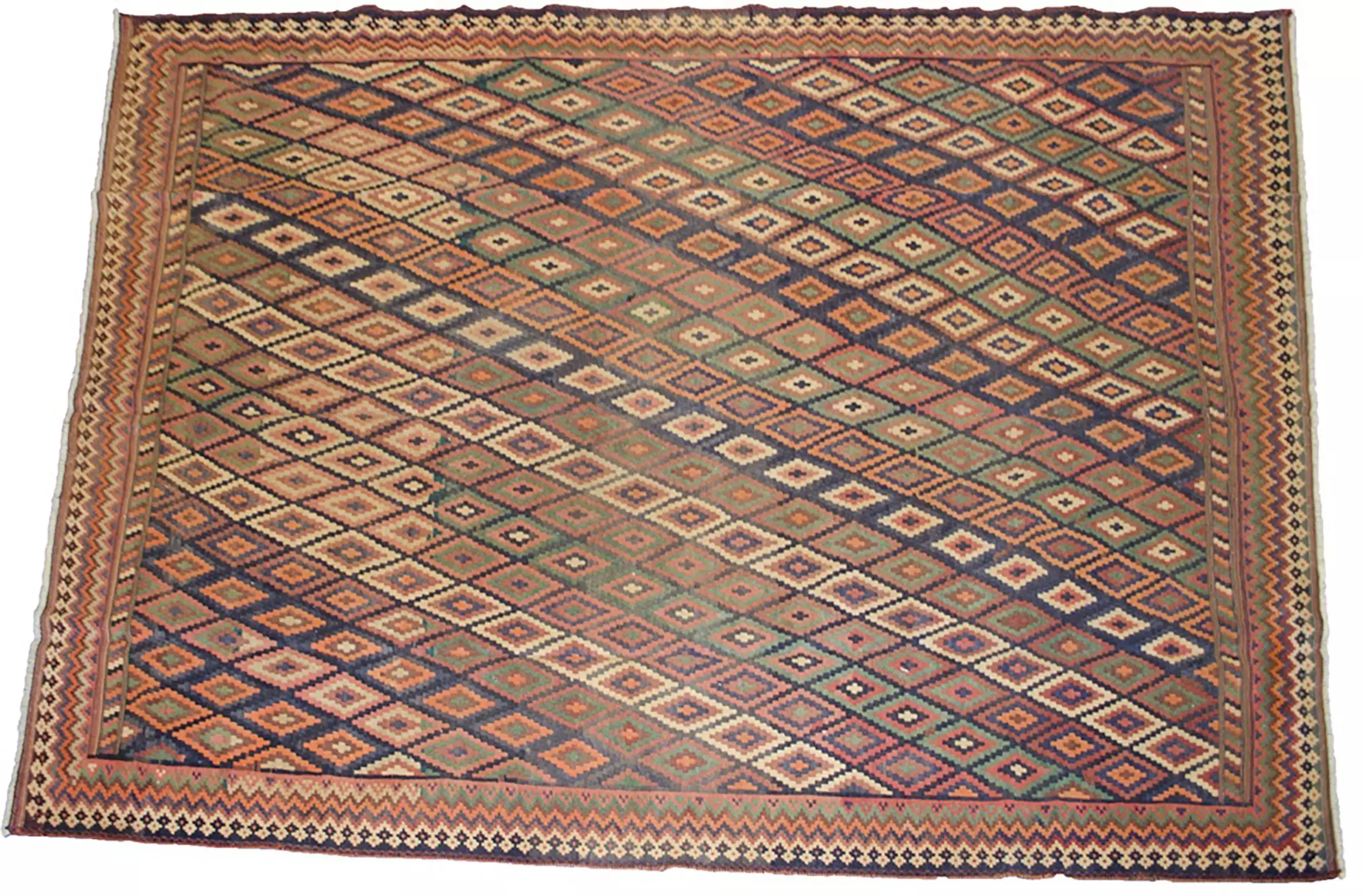 The design features an allover pattern of small lozenges in a subtle, harmonious colour palette that lends it a soft, understated charm. These delicately woven motifs are beautifully framed by a zigzag border, adding rhythm and structure to the piece without overwhelming its simplicity.