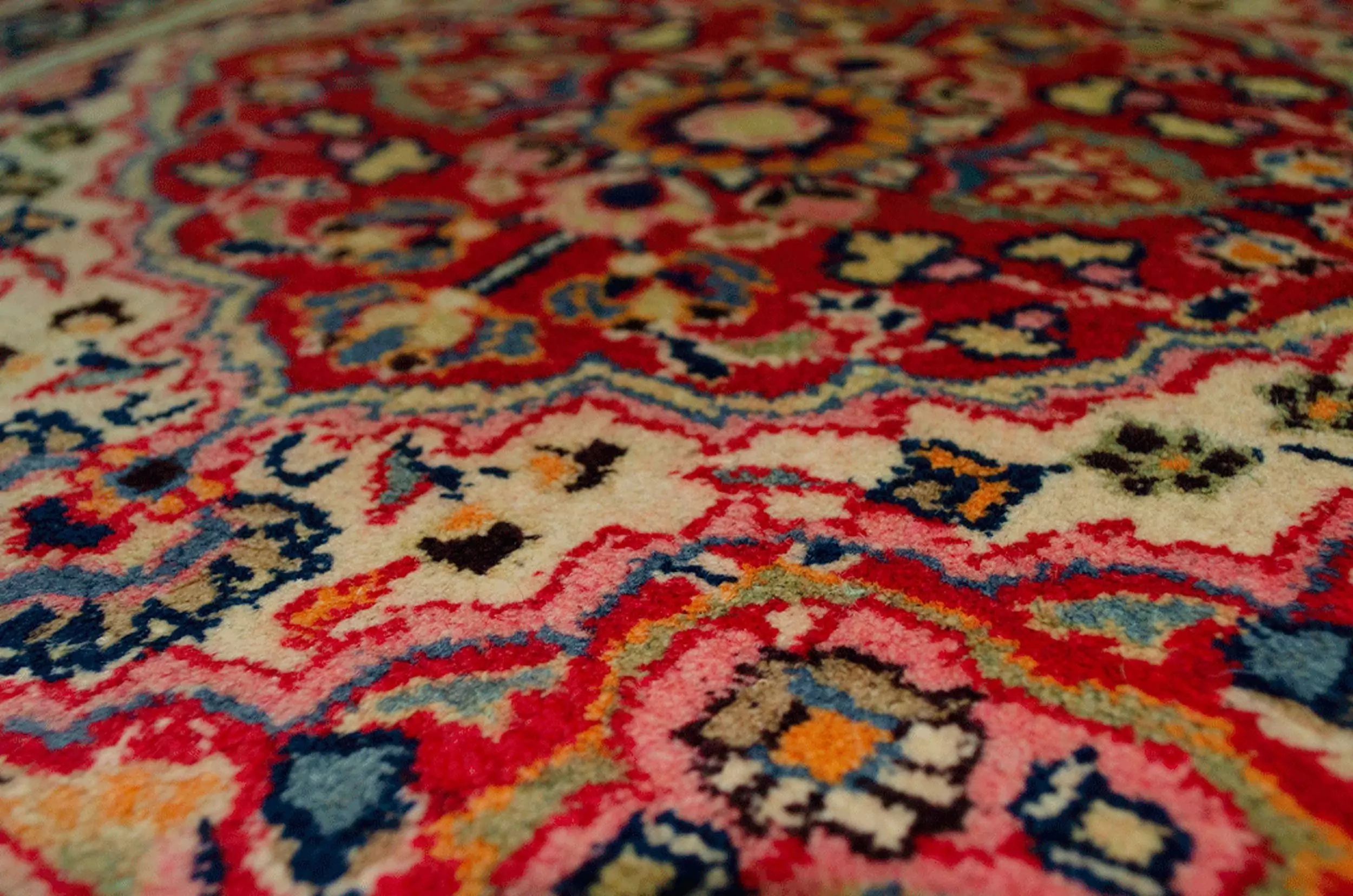 The design features a delicate floral pattern, rendered in a harmonious palette of soft reds, blues, and creams—colours that are gently muted yet luminous, thanks to the use of naturally dyed, high-quality wool. The shiny wool gives the piece a subtle sheen, adding depth and elegance to its visual appeal.