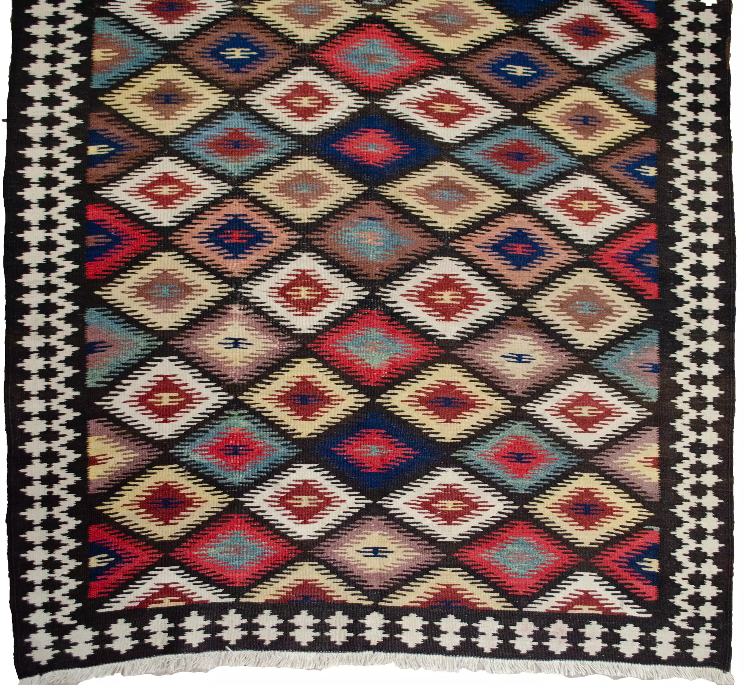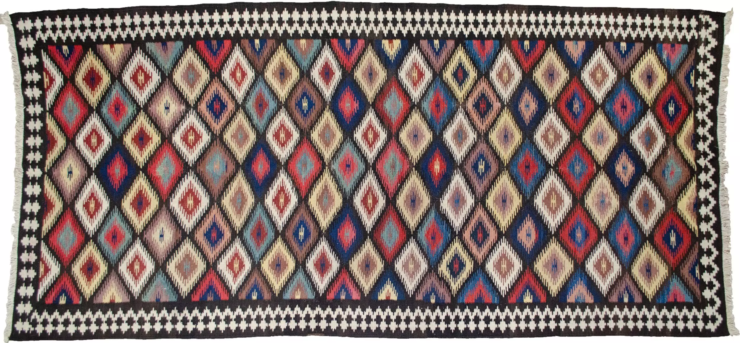 The kilim features a dazzling all-over lozenge design, bold and rhythmic, creating visual energy that draws the eye and enlivens any space. The field is framed by a soft cream border, which not only softens the dynamic central pattern but also elevates the overall composition with elegance and balance.