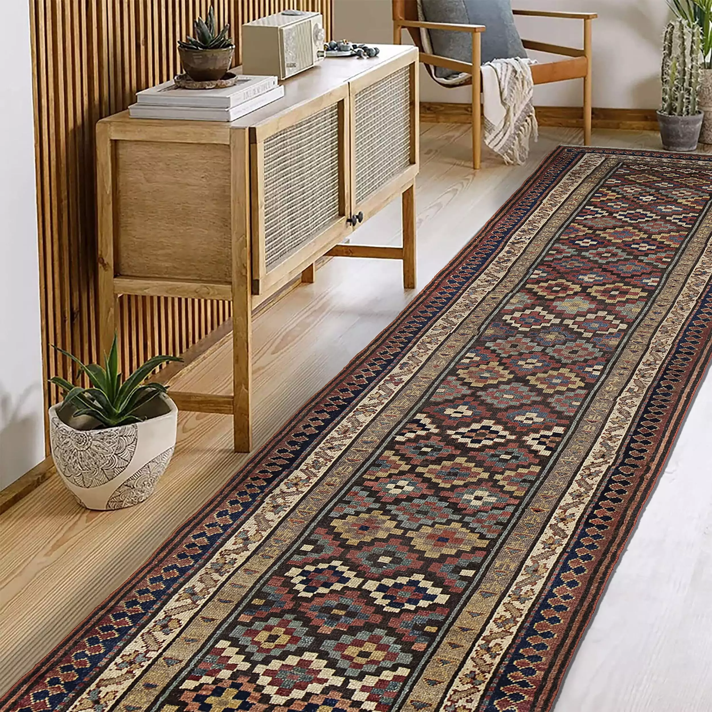 The runner is beautifully framed with multiple outer borders, each adding visual texture and refinement to the overall design. The earthy palette, contrasted with soft pops of colour in the tablet bands, makes this piece both decorative and versatile, well-suited to a range of interior styles.