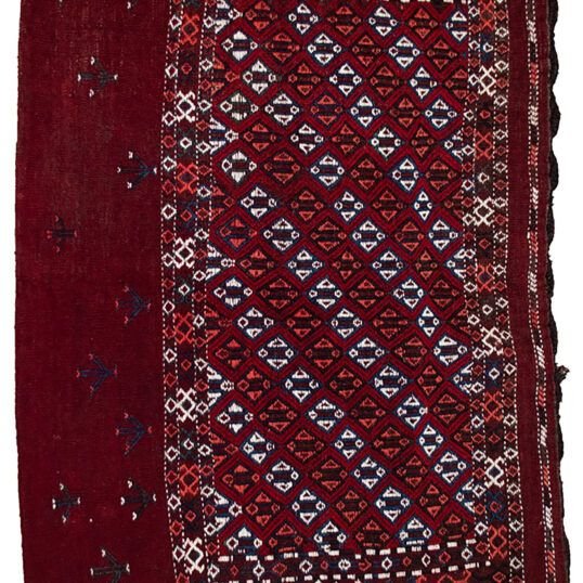 At the center of the composition are geometric lozenges, classic motifs in Turkman weaving that represent protection and continuity. Below these, stylised bushes are delicately placed, adding a natural, decorative flourish that softens the bold geometry of the central field.