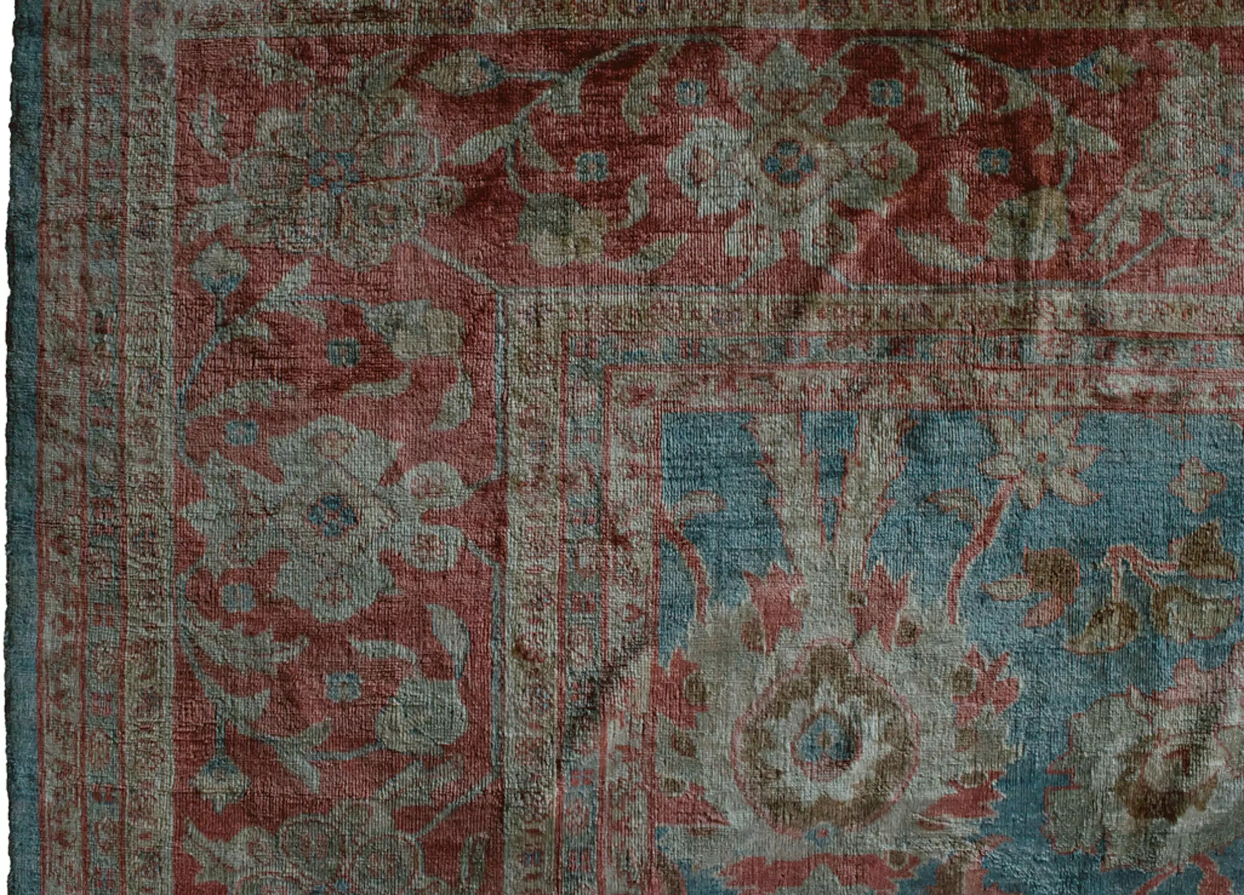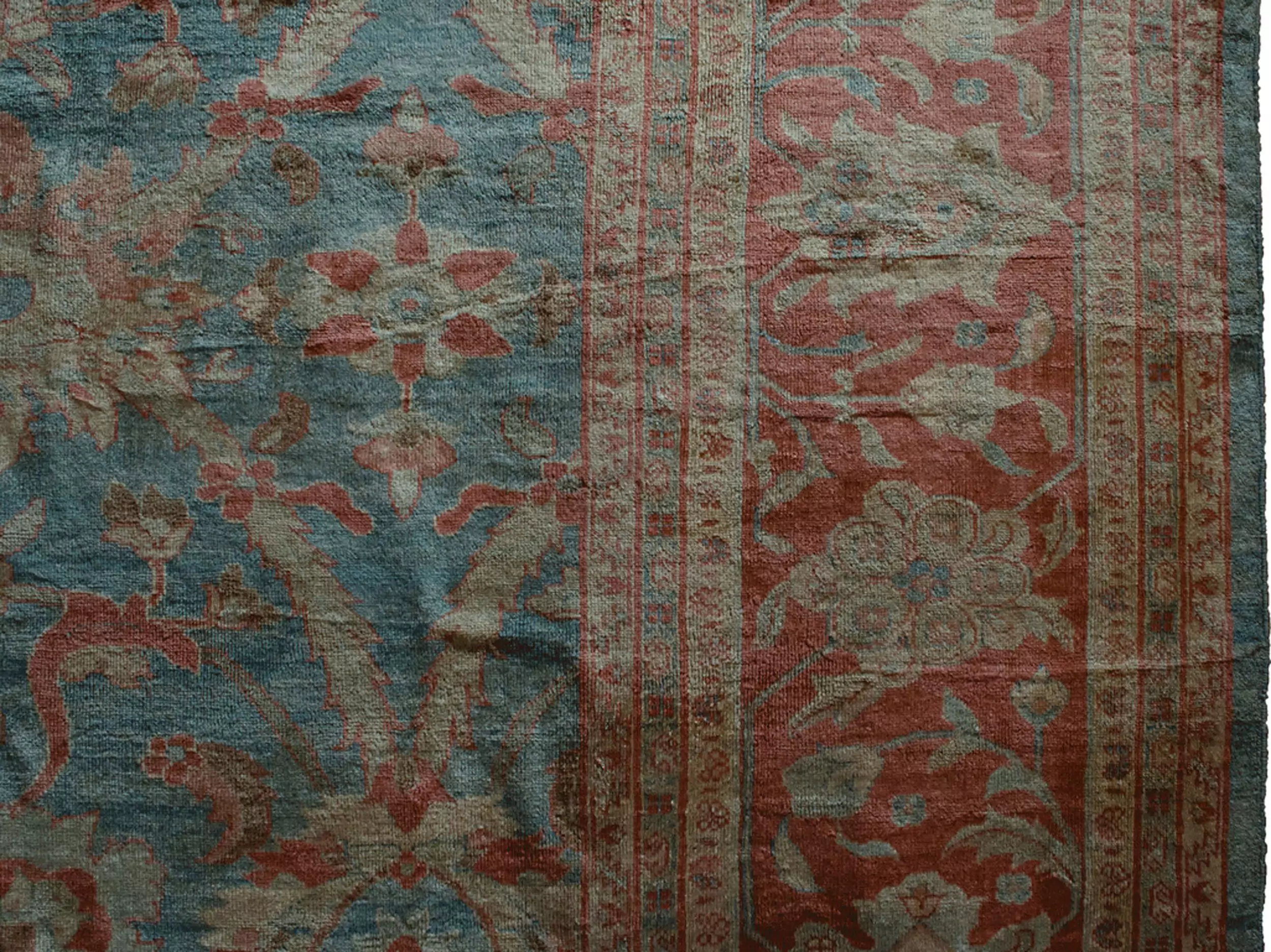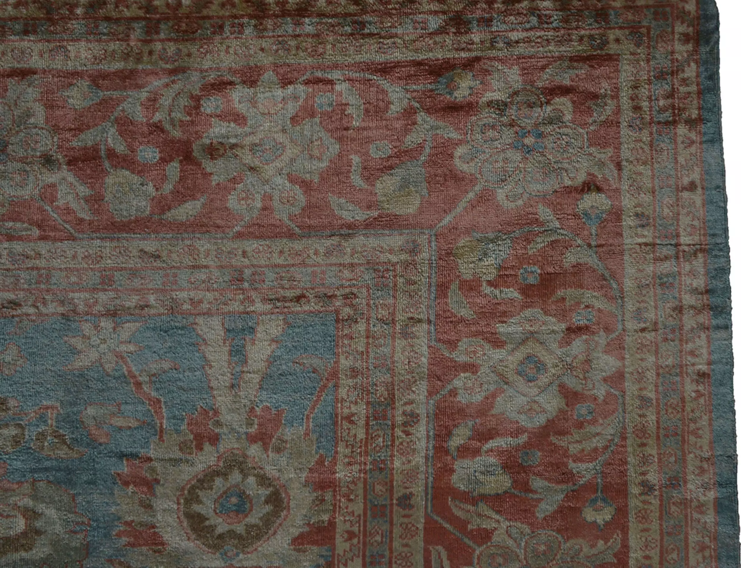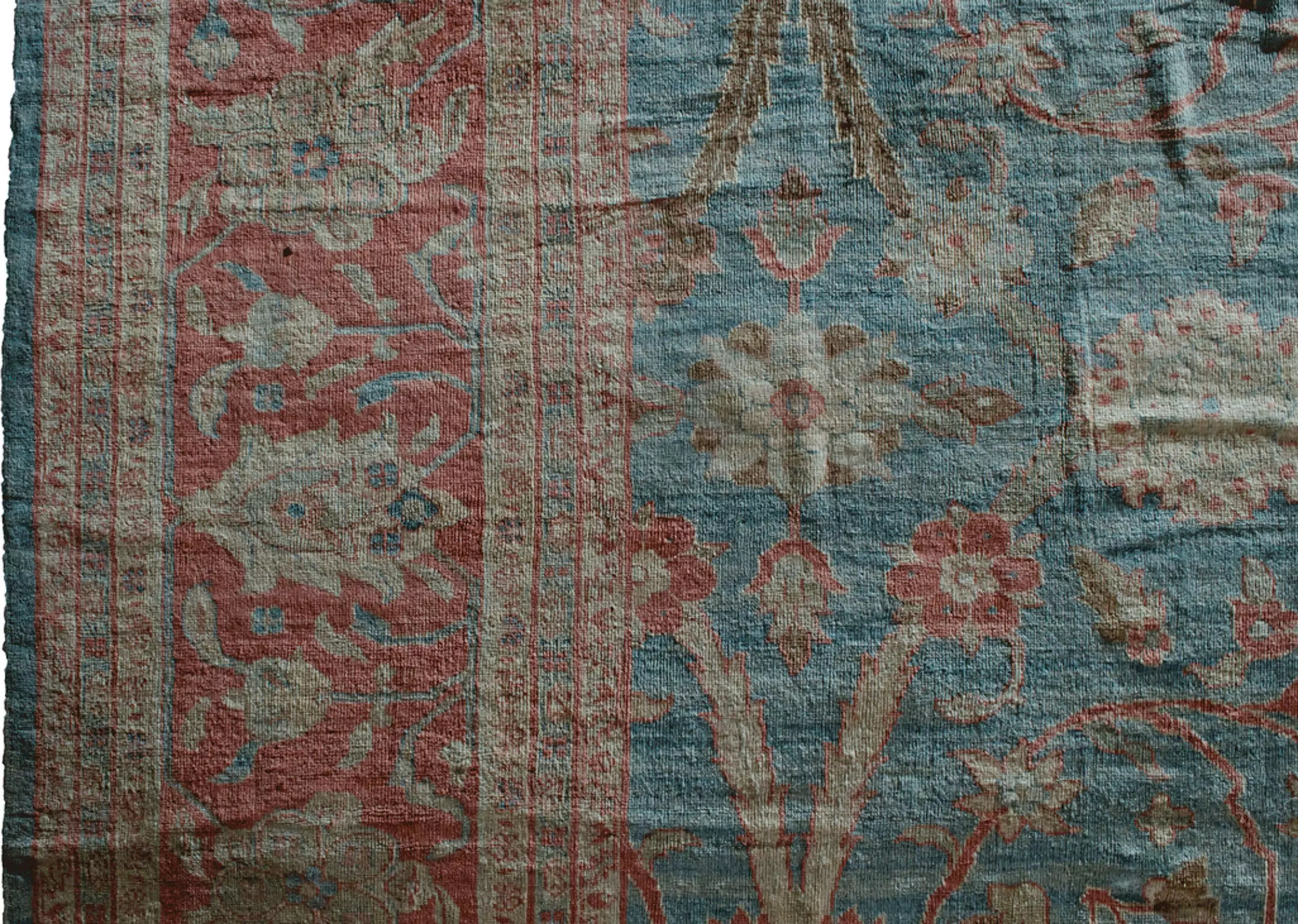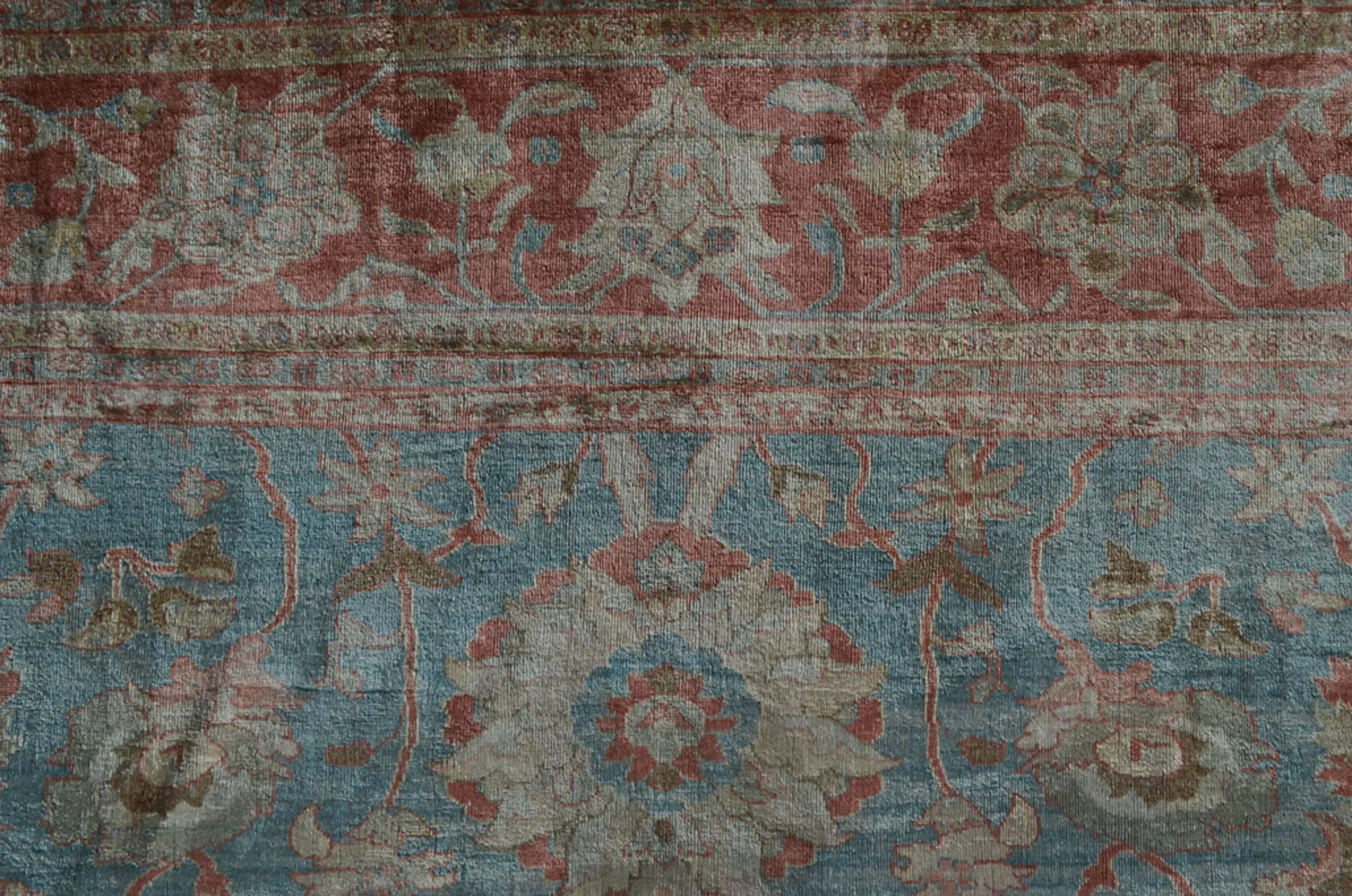 The soft red border frames the central design perfectly, adding warmth and depth while enhancing the overall balance of the rug. The colour harmony achieved in this piece—between the sky-like ground and the floral accents—is a rare and prized quality, even among fine handmade carpets.