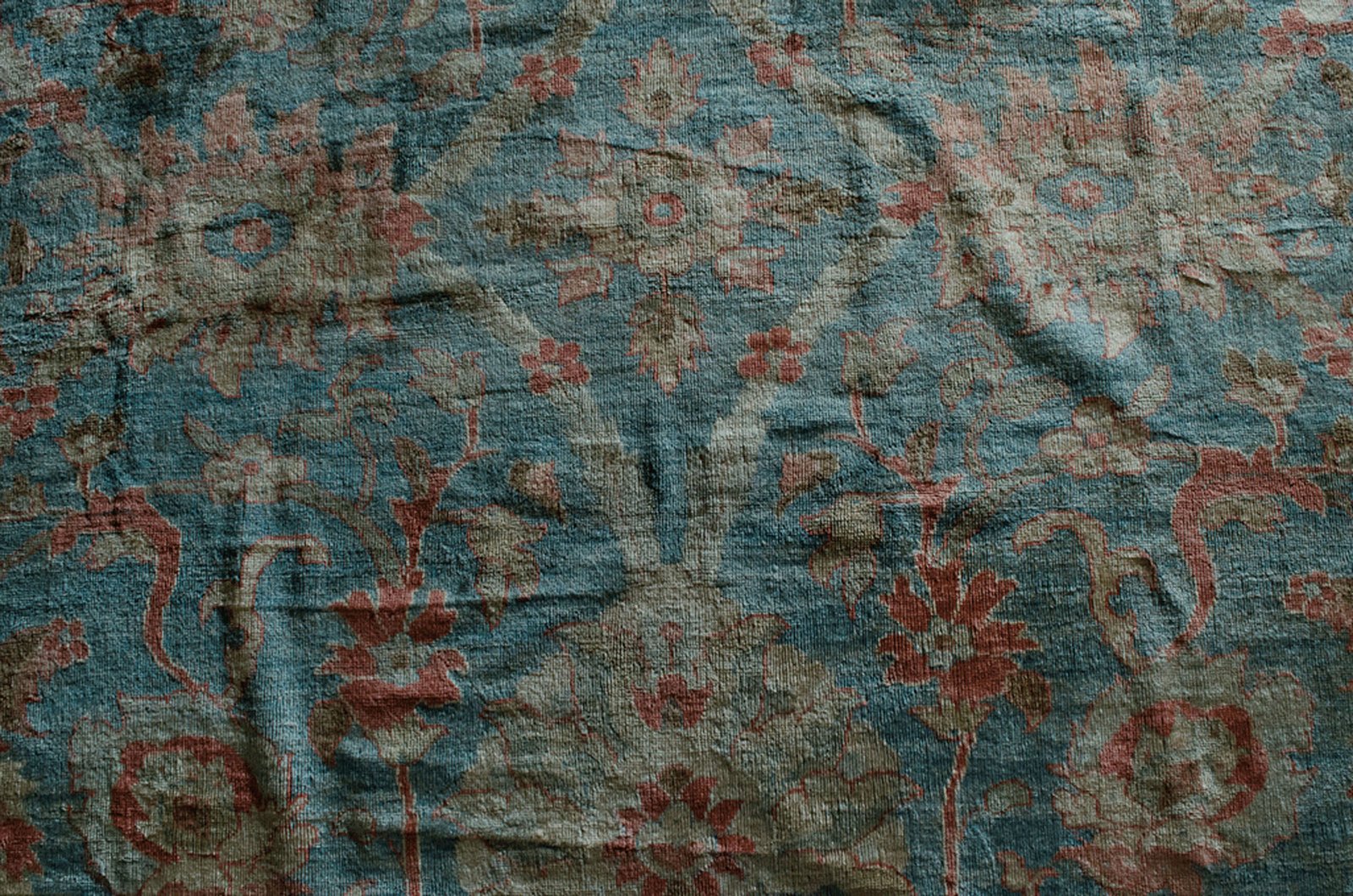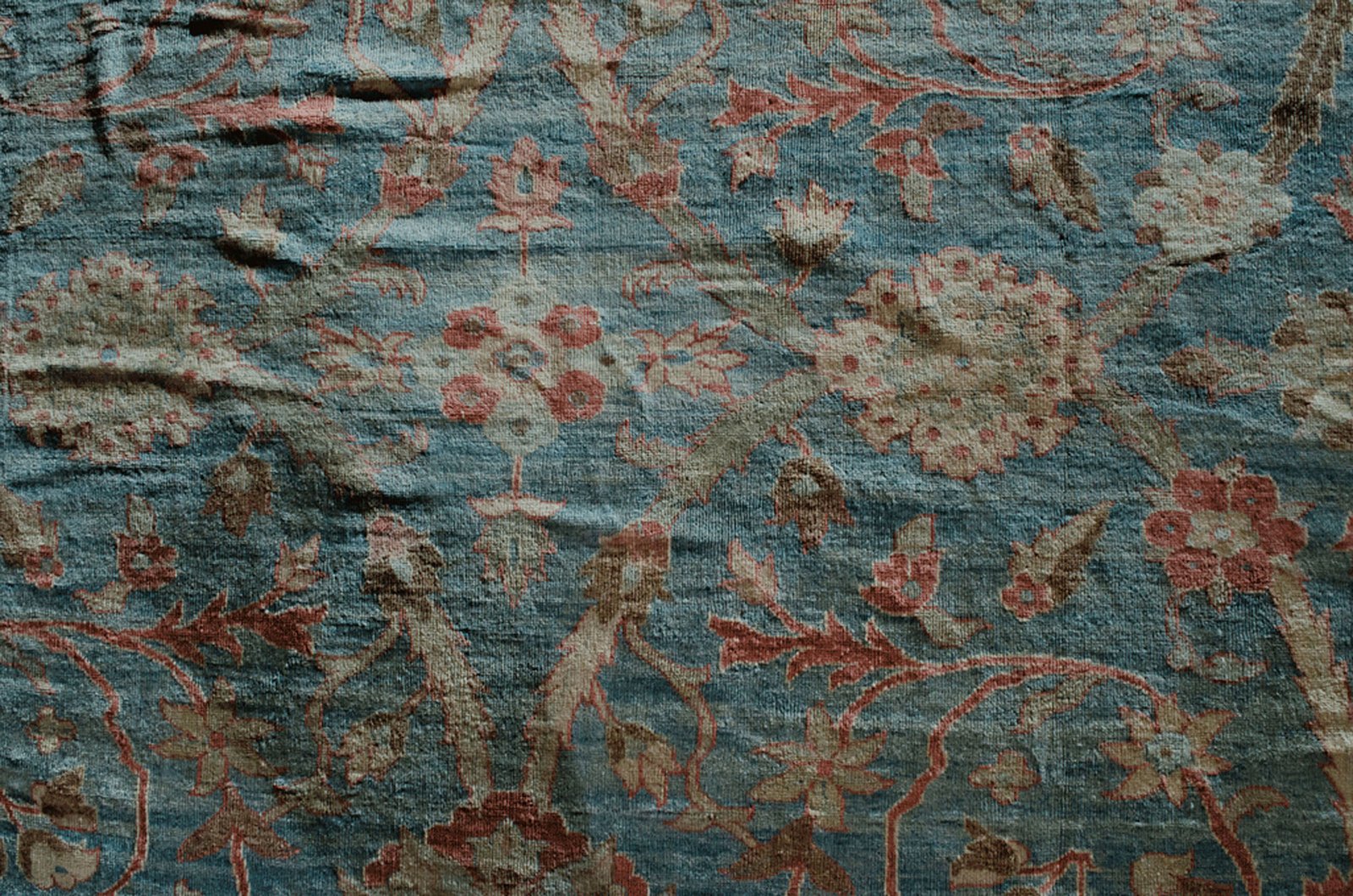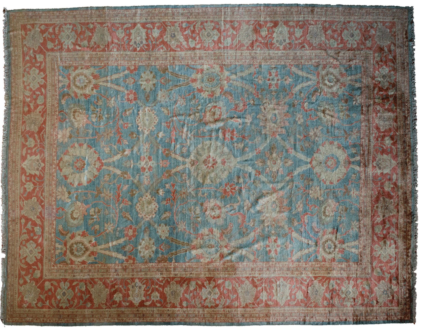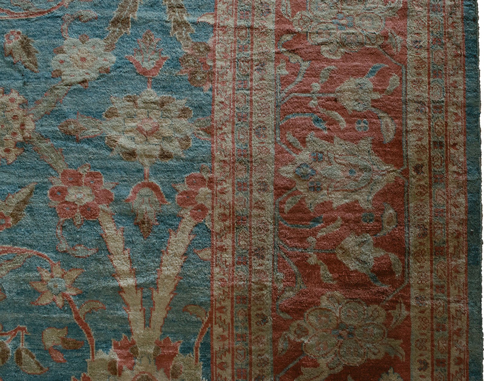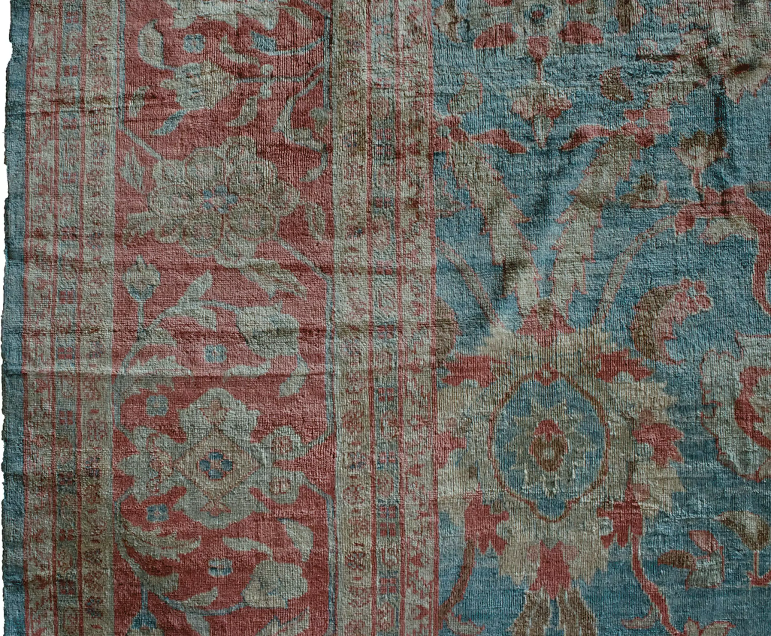 The soft red border frames the central design perfectly, adding warmth and depth while enhancing the overall balance of the rug. The colour harmony achieved in this piece—between the sky-like ground and the floral accents—is a rare and prized quality, even among fine handmade carpets.