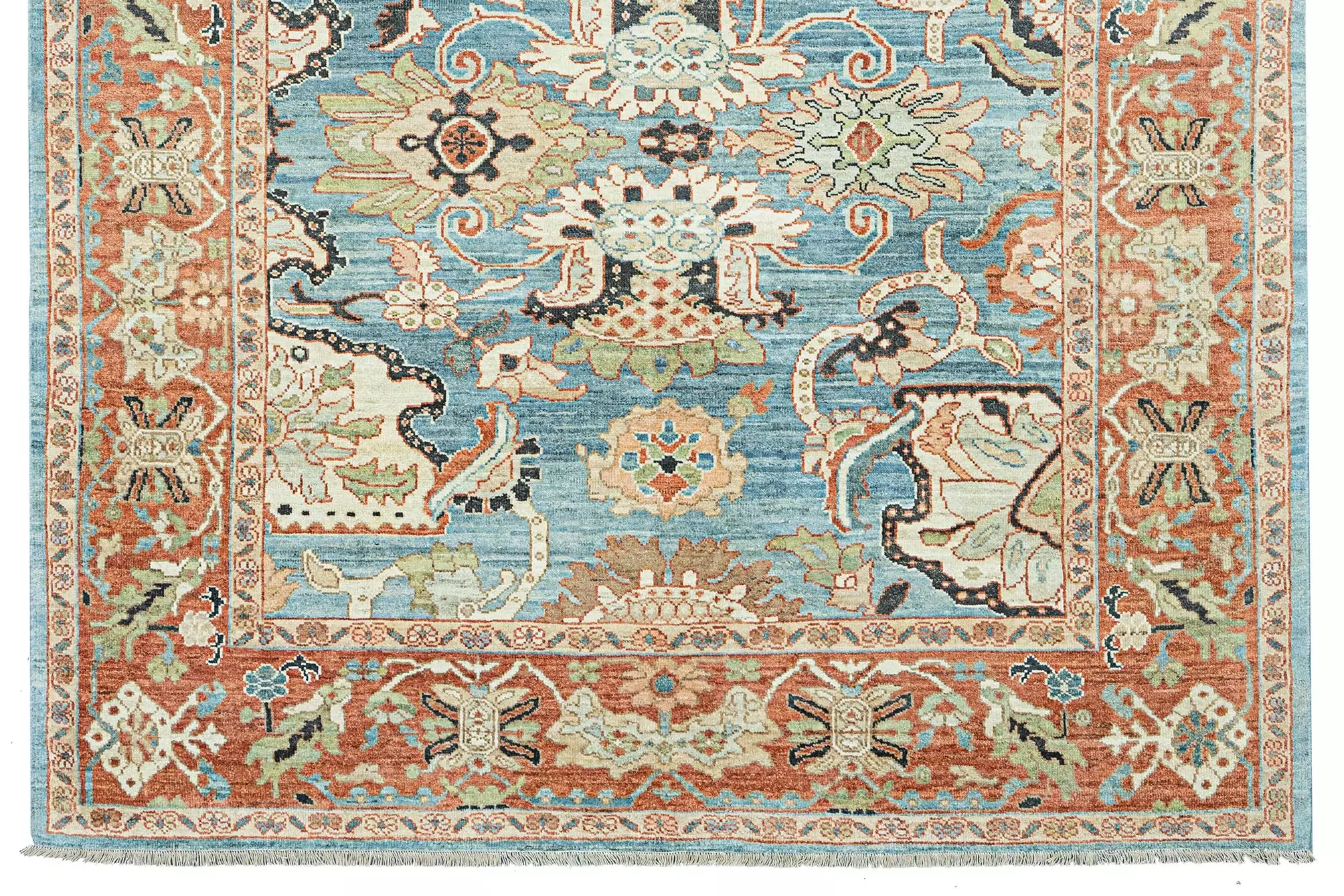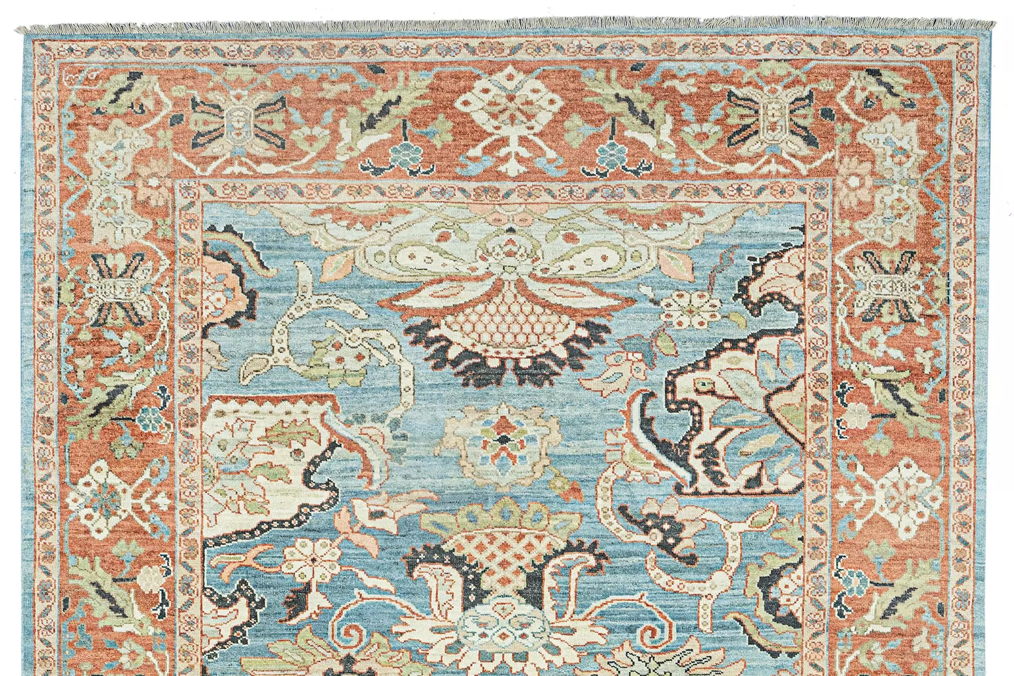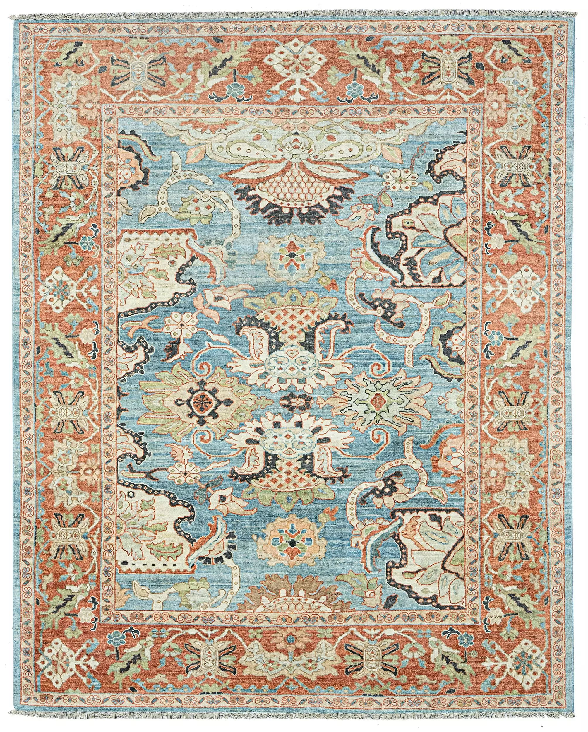 The light blue ground sets a tranquil tone, adorned with large, stylised floral motifs that flow elegantly across the field. The red border, richly decorated with stylised flower heads and leafy vines, provides vibrant contrast and a sense of structure—making the piece visually captivating from every angle.