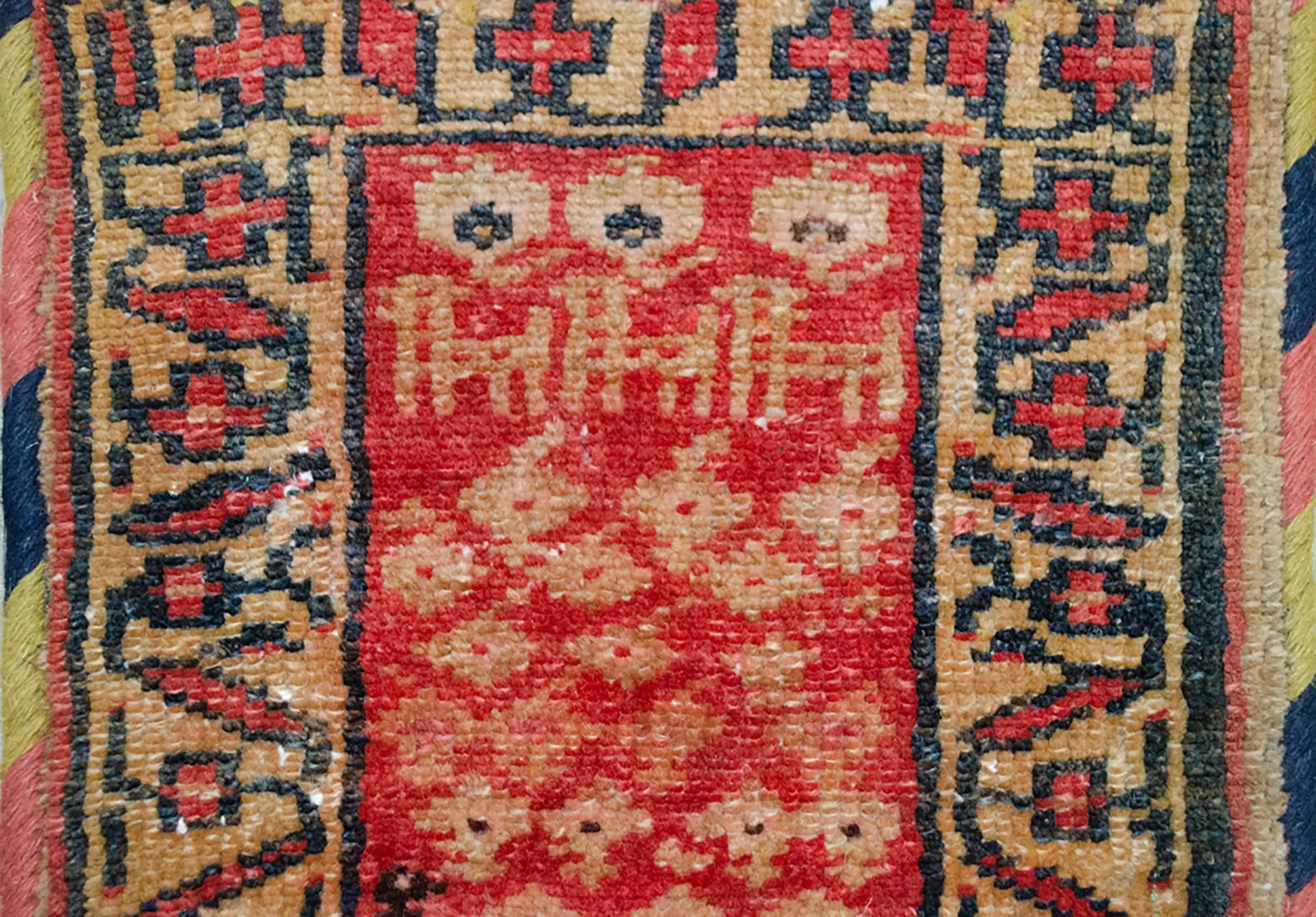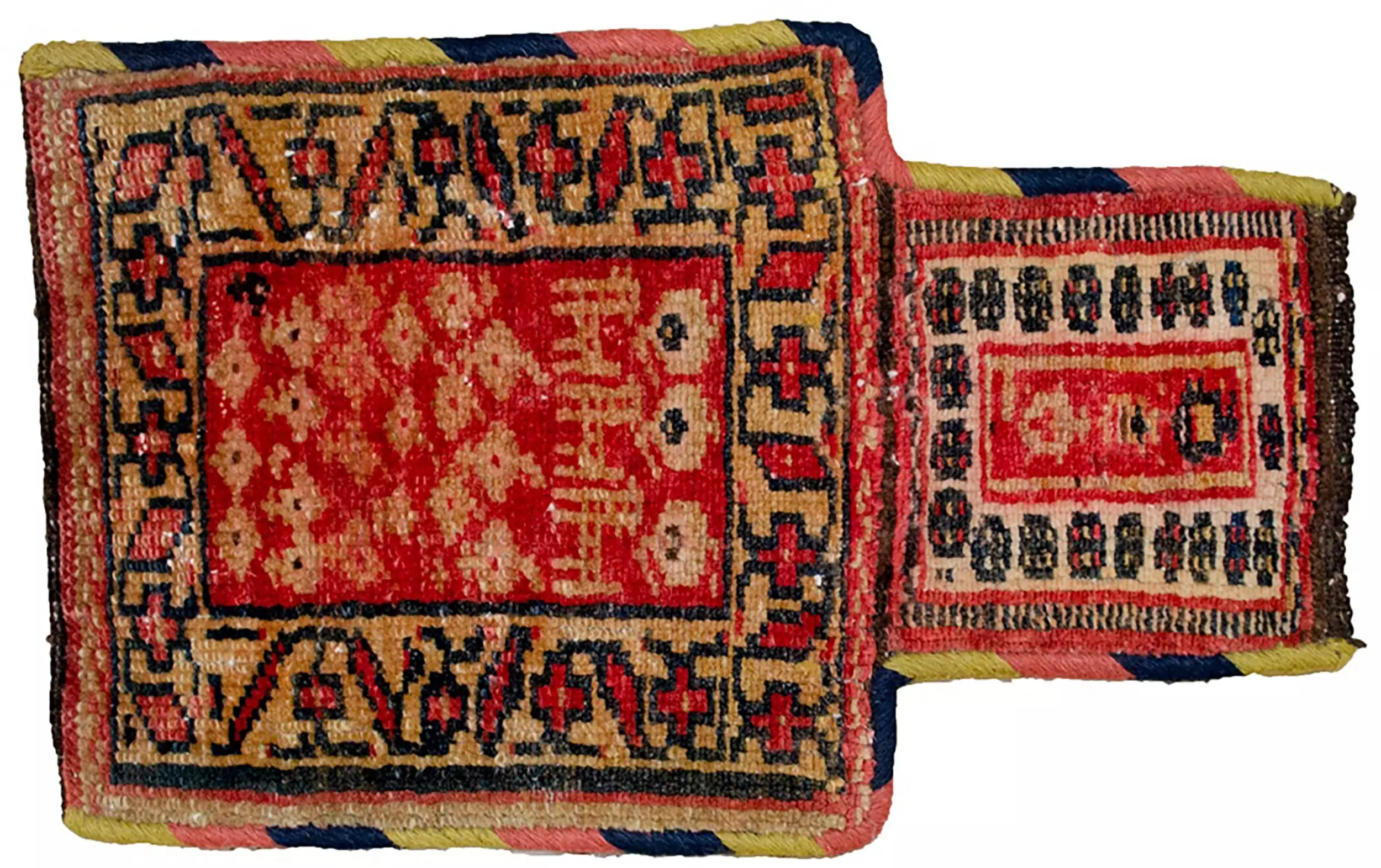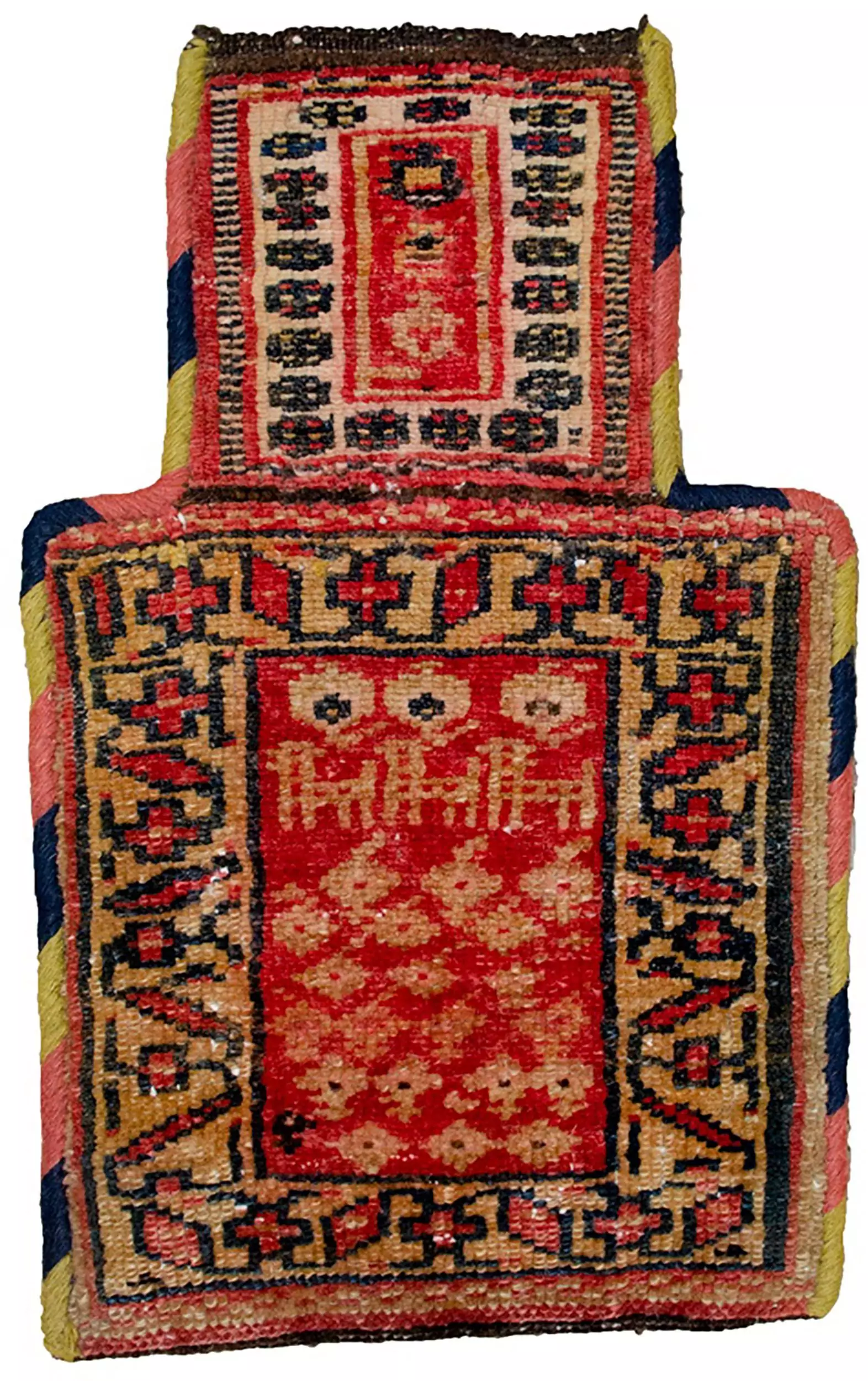 This piece showcases the charm of authentic tribal weaving, featuring a wonderful colour palette achieved with natural dyes that have matured beautifully over time. At the heart of the bag is a delightful scene with three stylised dogs, surrounded by a field of paisley (boteh) designs, a symbol of fertility and eternity in Persian art.