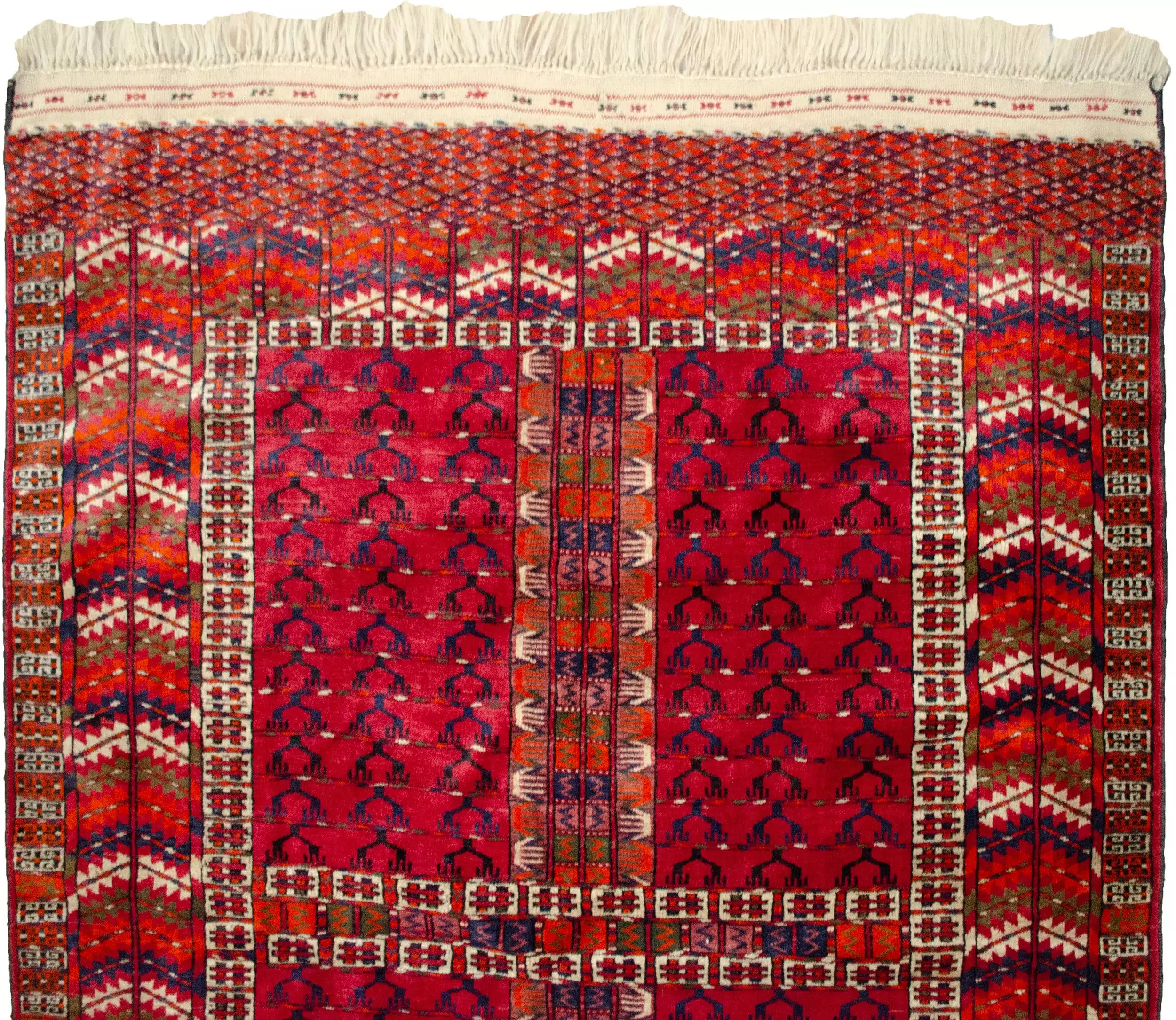 This exquisite antique Turkmen rug features the classic Pardeh (curtain) design, a type traditionally used as a tent divider or entrance barrier in yurts. Distinguished by its fine weaving, this piece showcases the hallmarks of Turkmen craftsmanship: a vibrant red ground, low-cut pile for sharp detail, and an array of small, intricate motifs that repeat across the field.