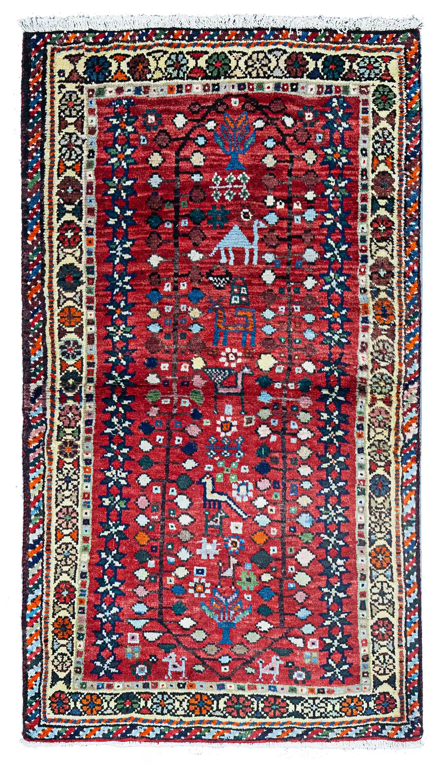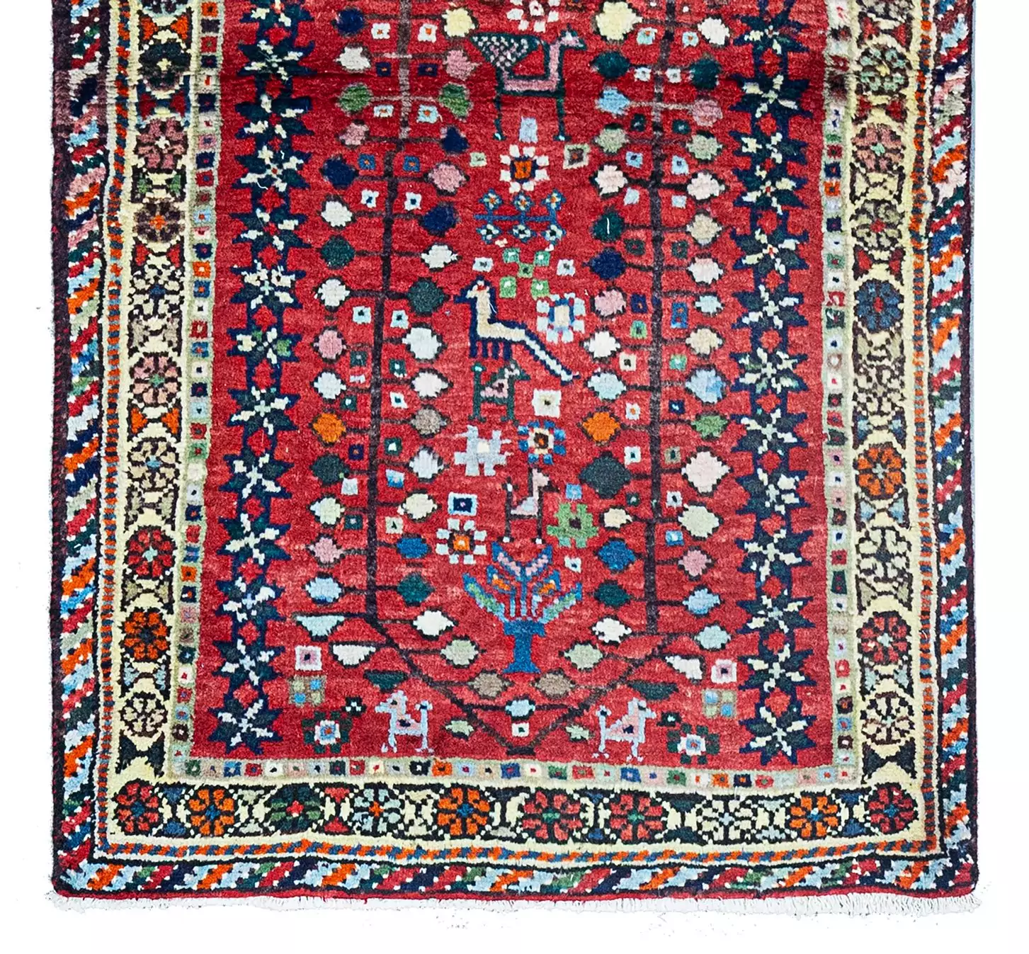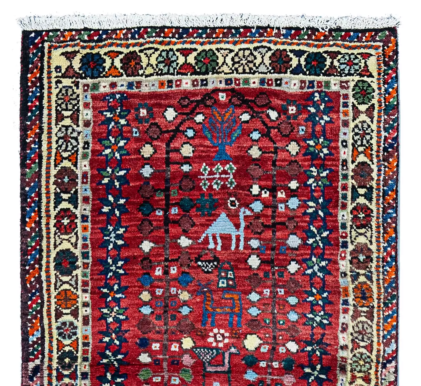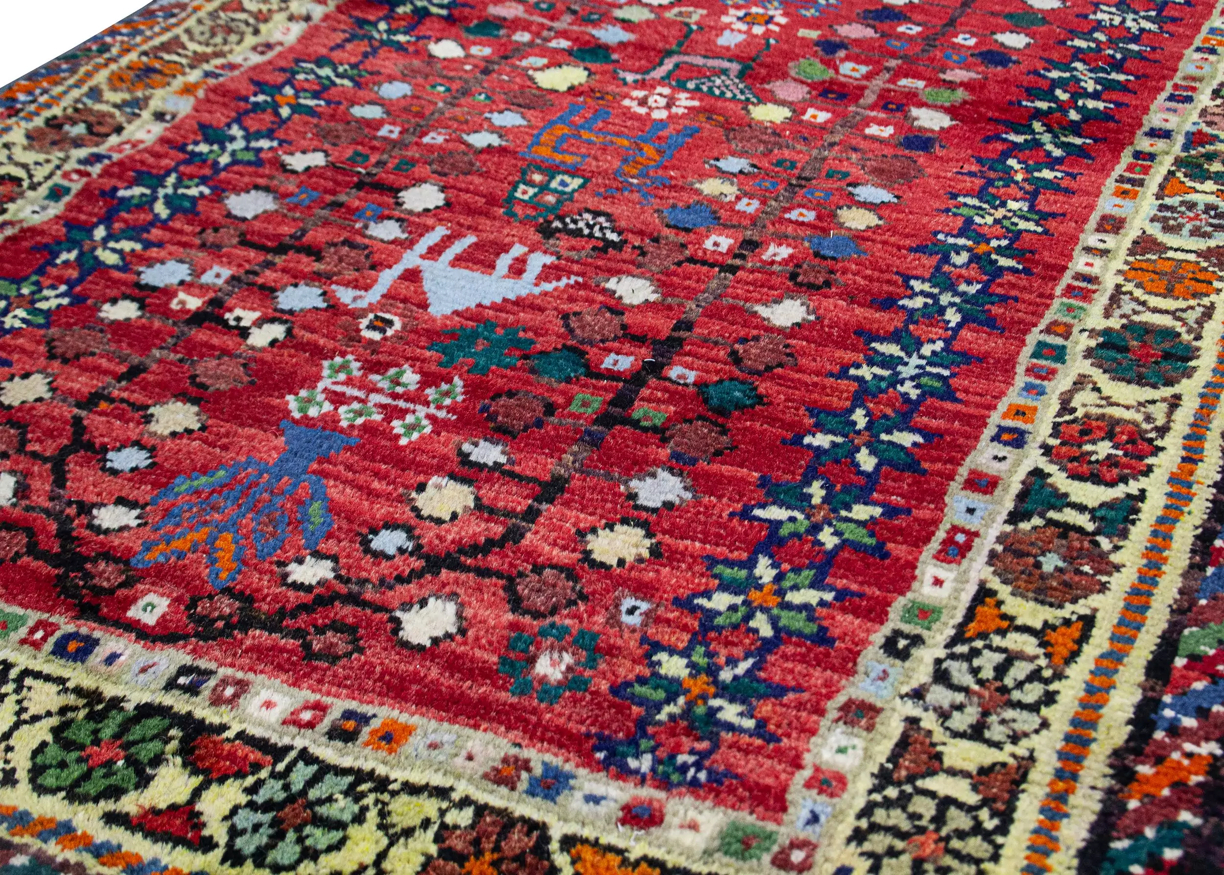 The deep red field, enhanced by abrush (intentional variations in dye), creates a vivid backdrop for an enchanting array of animal and nature motifs. You’ll find camels, dogs, peacocks, and sweet stylised trees at either end—all woven with character and intention, adding visual interest and a sense of joy.