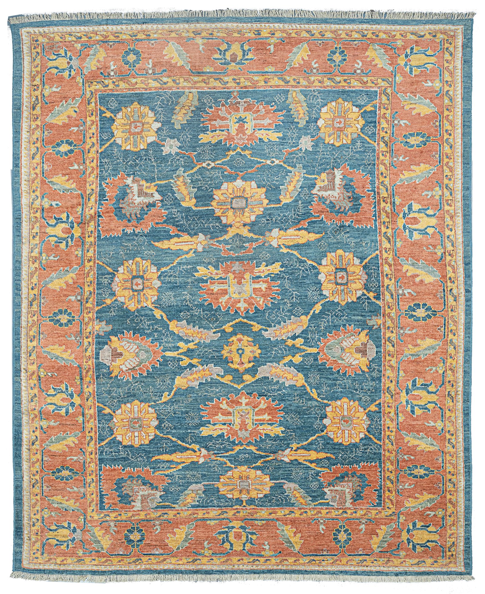 The border, executed in a warm terracotta tone, is filled with floral and leafy motifs that create a harmonious frame around the central design. The colors, textures, and proportions are thoughtfully balanced, resulting in a decorative carpet that works beautifully in both traditional and contemporary interiors.