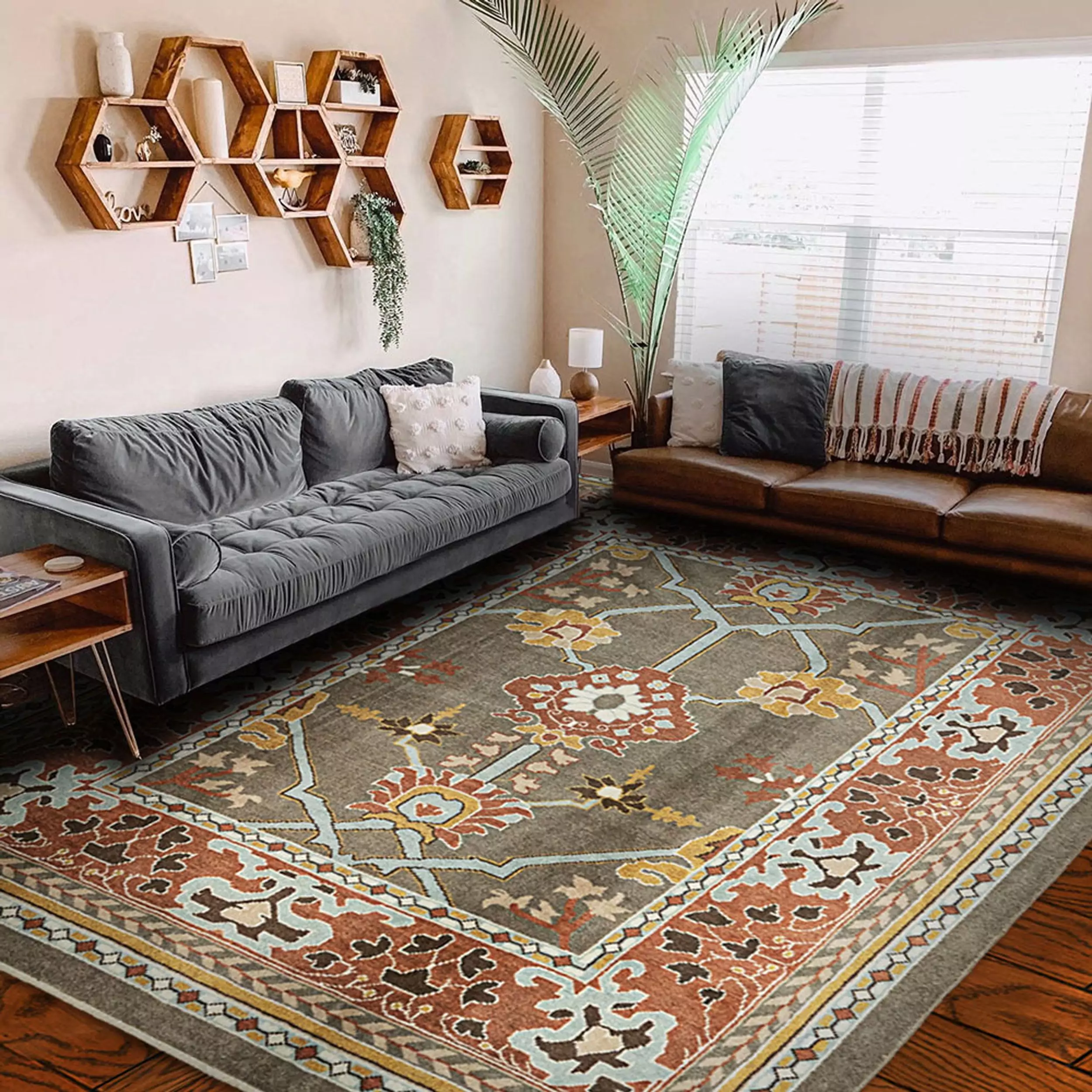 A beautifully contrasting red border encircles the central field, providing a vibrant pop that enhances the rug’s overall harmony. The interconnected branching forms continue seamlessly into the border, creating a unified and balanced composition. The outer structure is completed with multiple narrow guard borders, which offer refinement and gently direct focus toward the core design.
