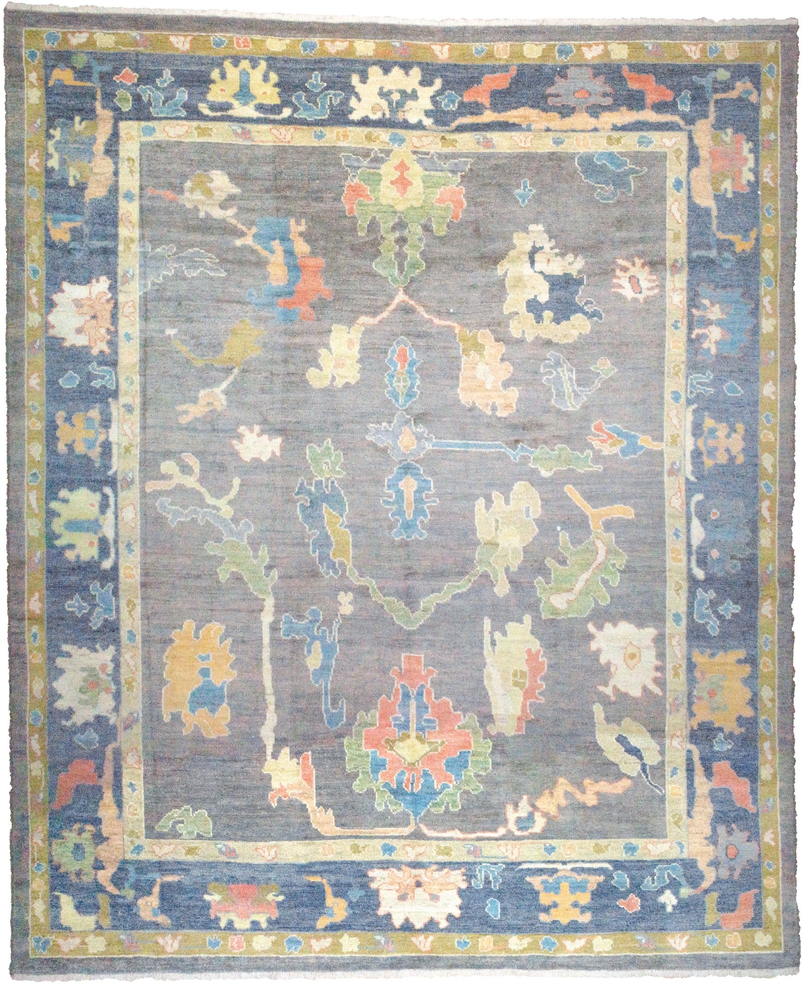 The design features an all-over floral and leafy motif, inspired by antique Ushaks, elegantly rendered on a grey-blue field. The petrol blue border provides bold contrast and frames the composition beautifully, bringing depth and balance to the rug’s appearance.