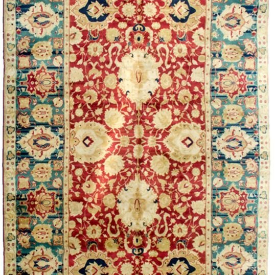 A beautifully contrasting green-blue border frames the composition, also filled with palmettes and floral forms that echo the central field. This clever interplay between warm red and cool blue-green creates a perfectly balanced palette that stands out in both traditional and contemporary interiors.