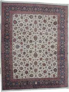 Excellent Mashad carpet from Northeast of Iran. Allover floral design on a cream background, framed with a floral blue border. This piece is woven by “Astane Ghods”. Almost all their production is large pieces for the Holy Shrine of the 8th Shia Emam in Mashad. They use the best weavers as it is an honour to weave for the Shrine and the highest quality wool and natural dyes. Their carpets are invariably excellent and difficult to find in the open market. After 20 to 30 years of use in the Shrine, they are auctioned off in Mashad, and because of their provenance, they are very sought after by the Iranian public. The signature reads “Astane Ghods Carpet Factory”.