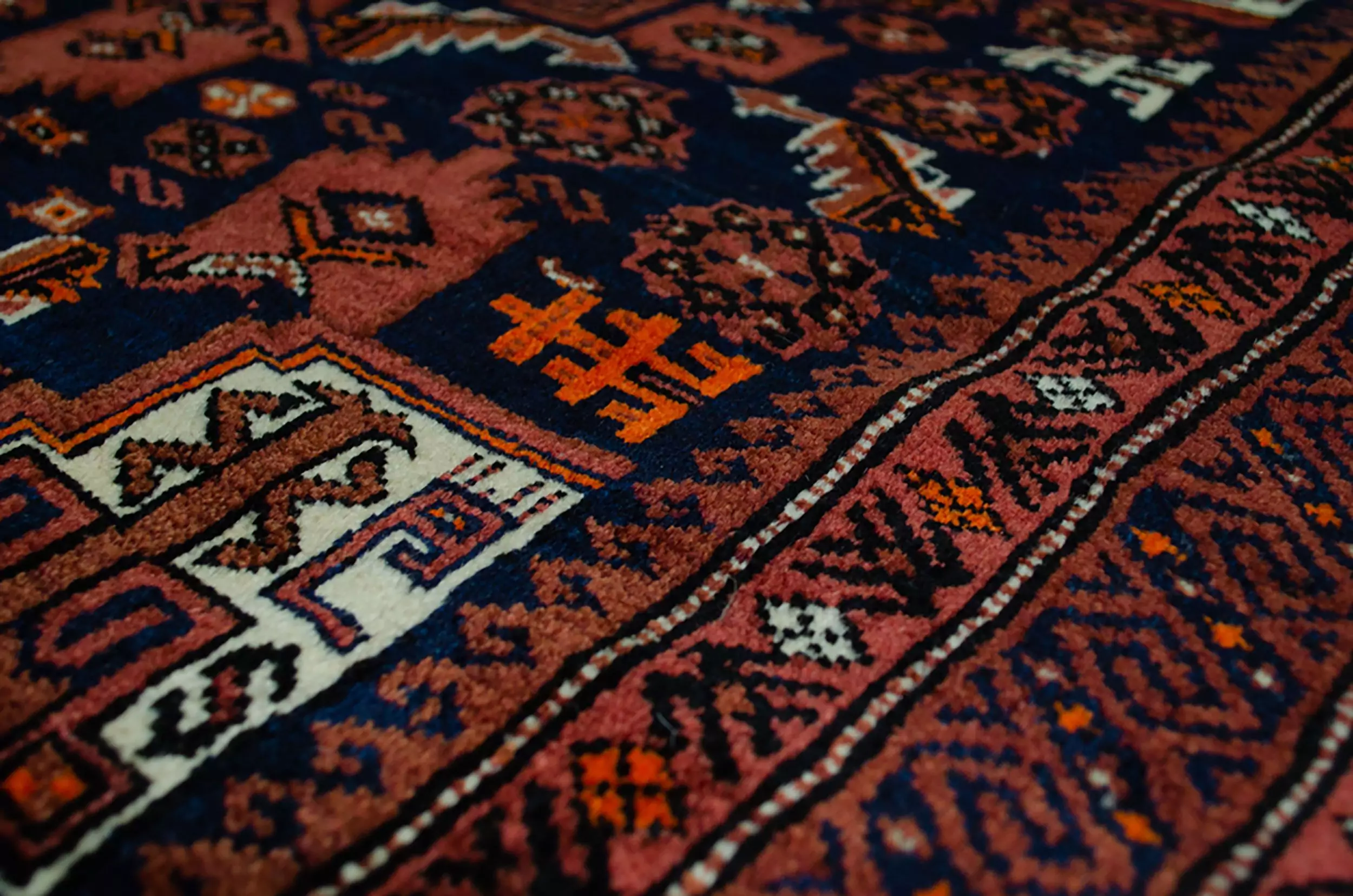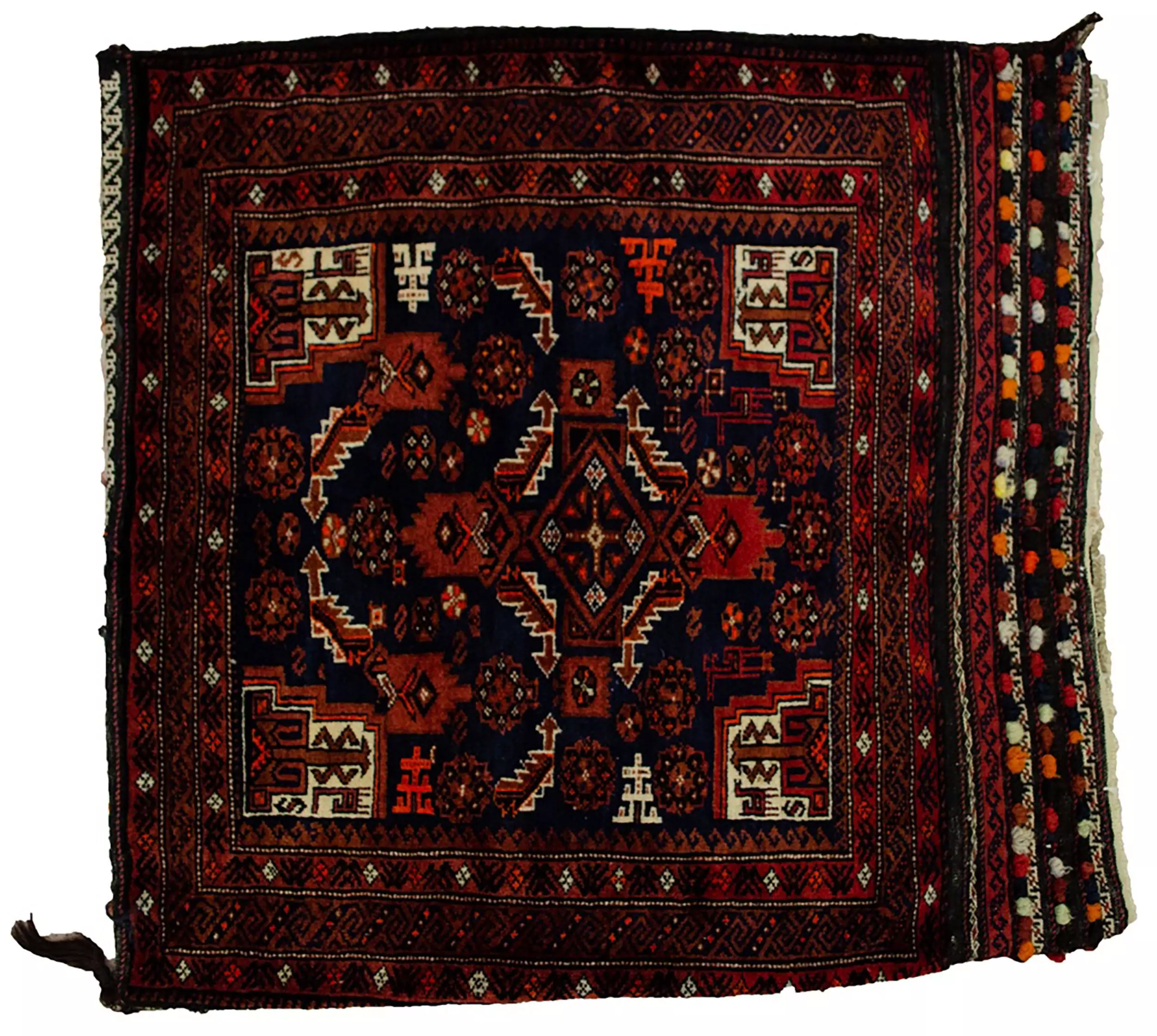Crafted using high-quality, soft wool, the bag is dyed with the Baluchis’ signature saturated reds and blues. Scattered across the central field are small flowerheads, and in each corner, a charming goat motif—evoking life, protection, and fertility in traditional tribal symbolism.