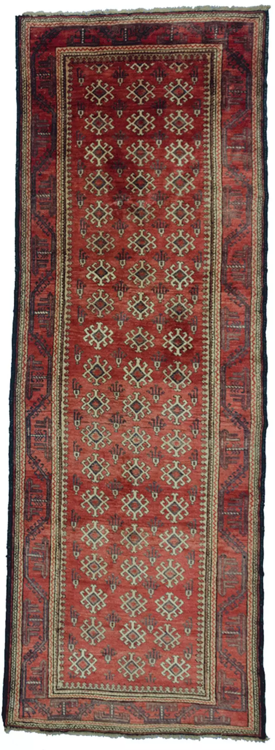 Decorative vintage Baluch Runner from Northeast of Iran. Allover diamond design on a soft red ground framed with a pretty geometric red border. The wool has a lovely sheen to it and is very soft. Runners in Baluch are not often found.