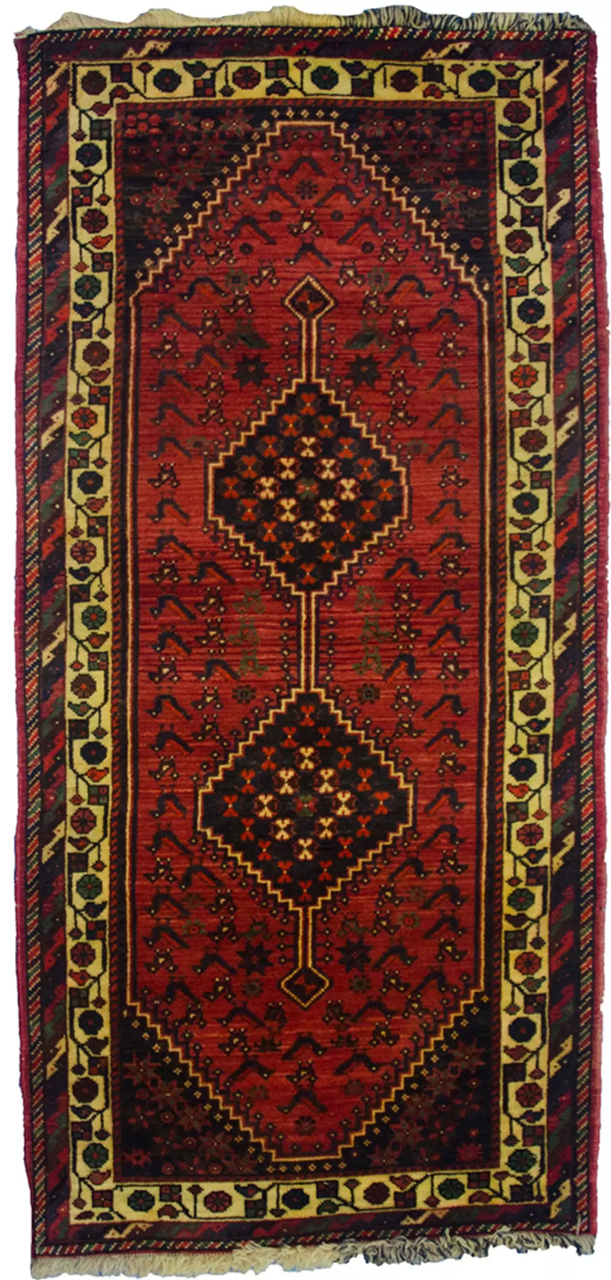 This charming vintage Bownat runner from South Iran is a striking example of tribal artistry. Featuring a bold double medallion design, the runner is set on a richly abrushed deep red ground, offering visual texture and depth.