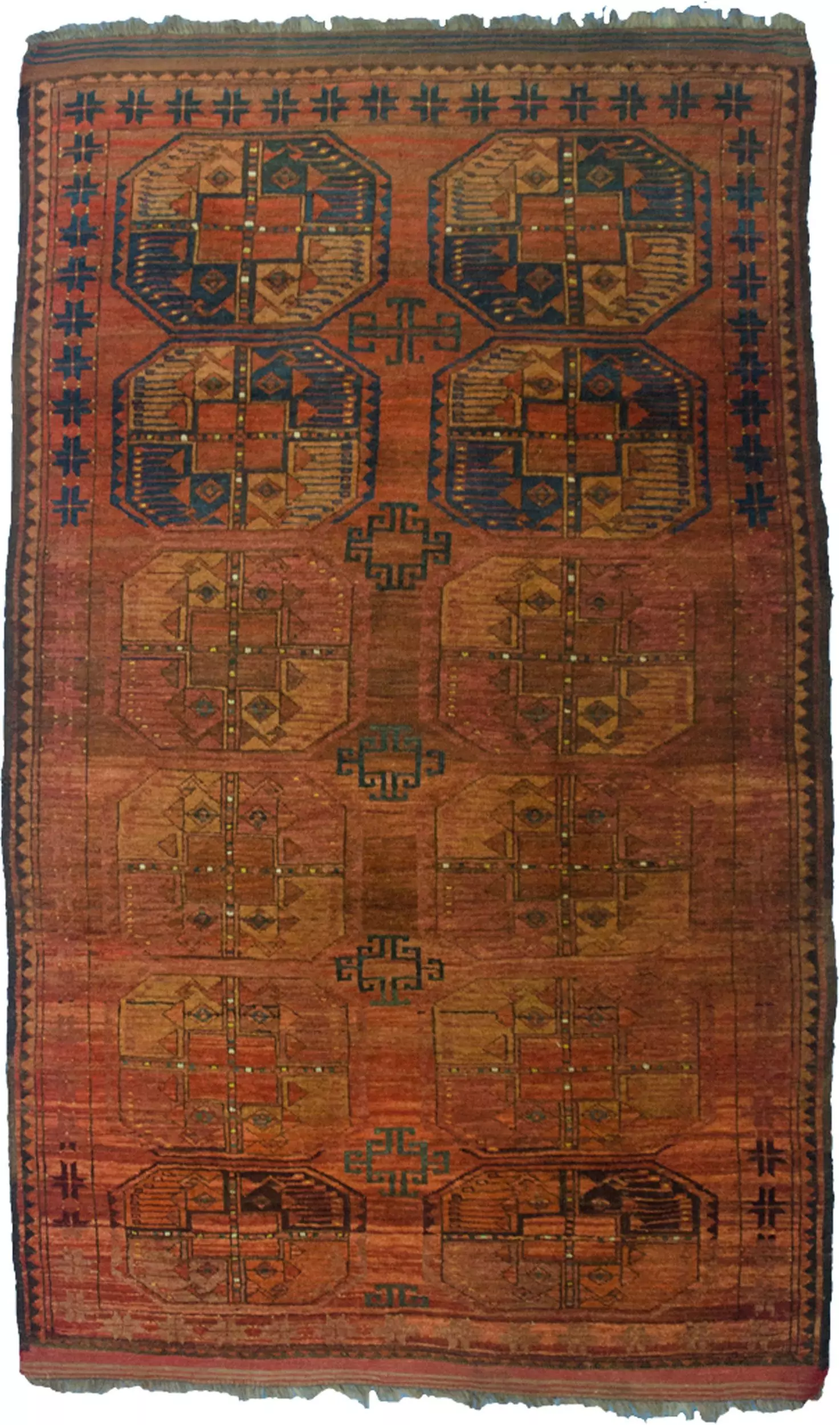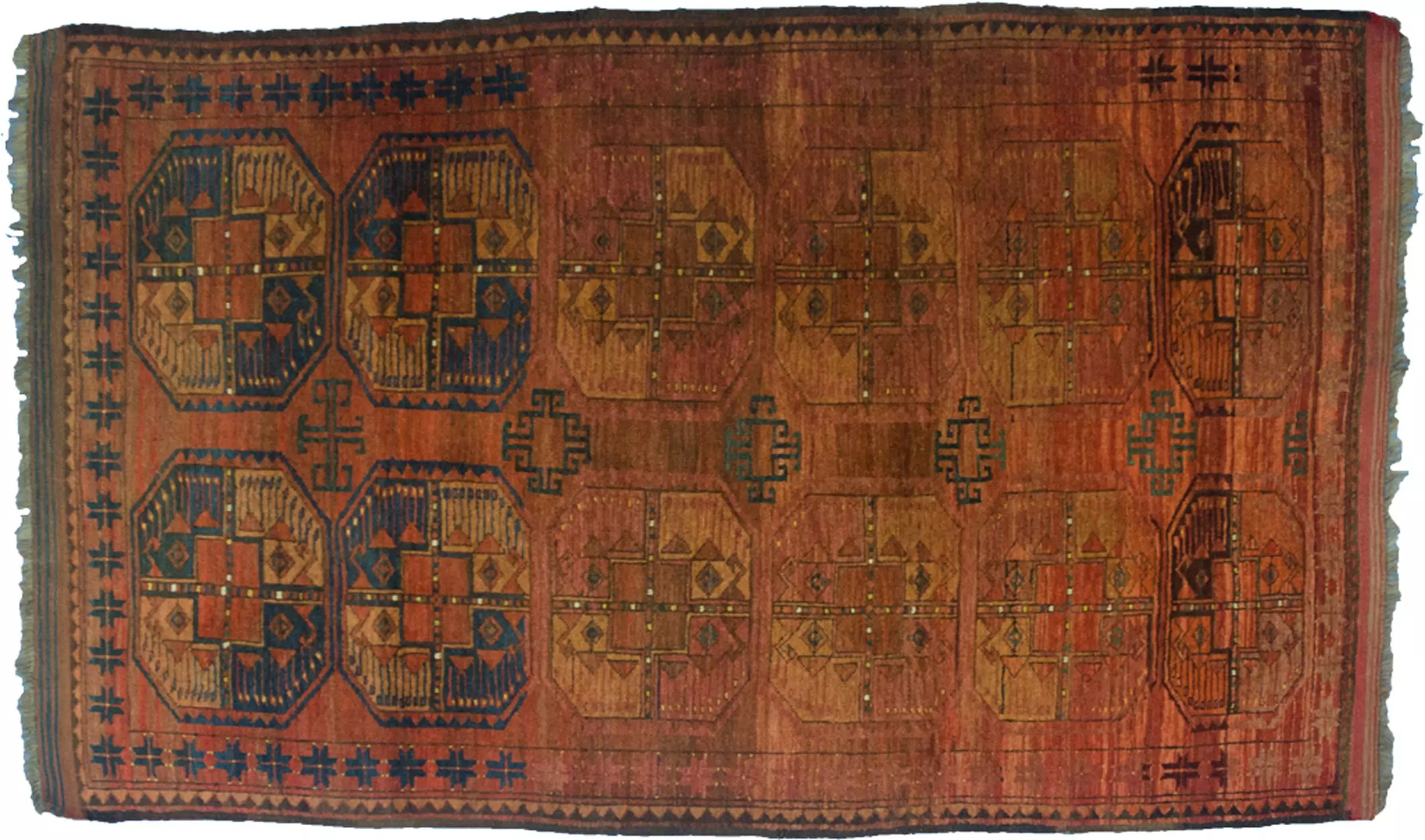 Charming vintage Ersari rug. Two rows of large elephant foot design on a wonderful copper red ground with various abrushes and changes of colour that give this piece a lot of character. An unusually narrow star border with pretty kilim ends.
