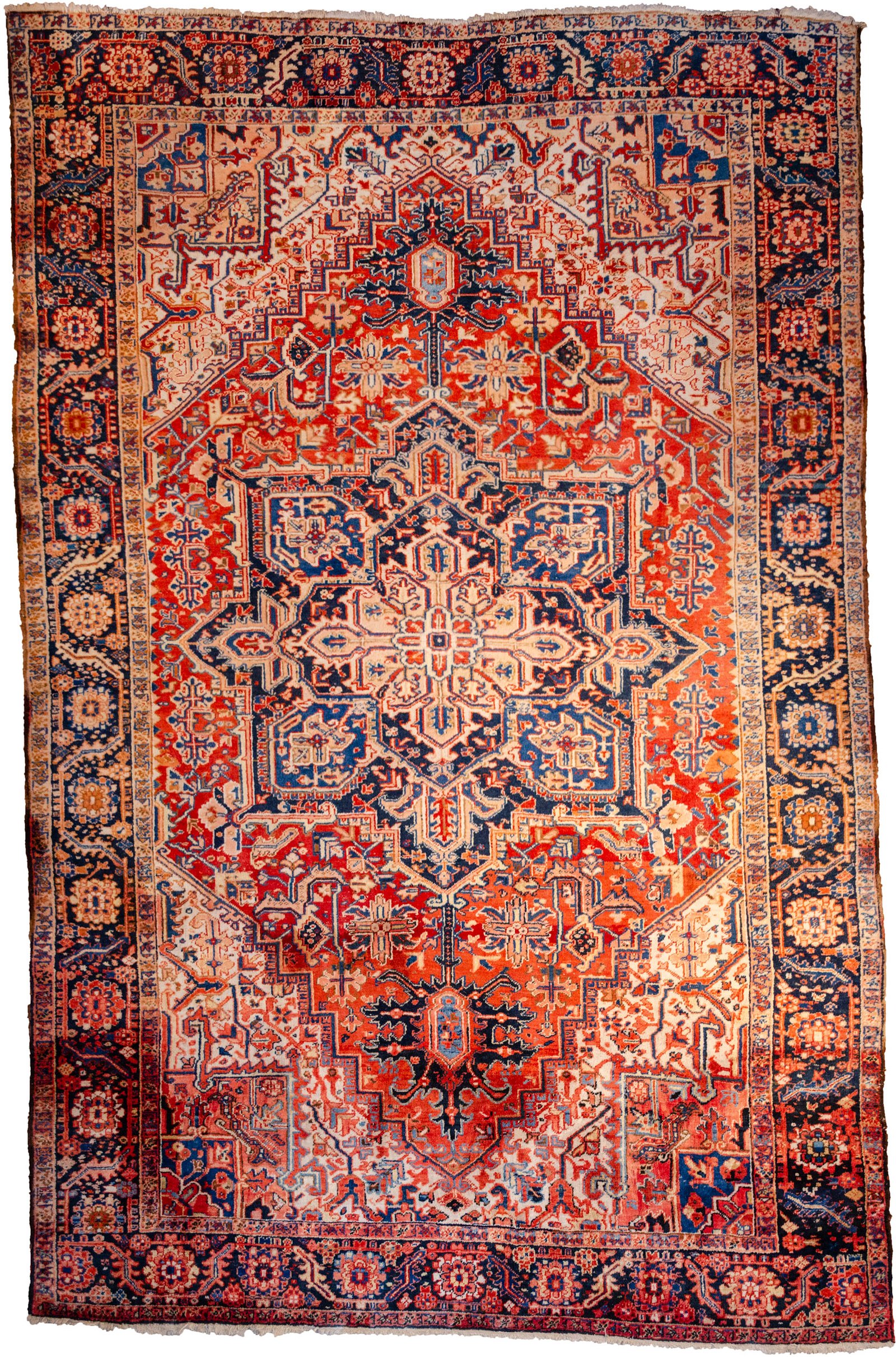 This vintage Heriz carpet embodies the bold, graphic style that defines rugs from this iconic weaving region in Northwest Iran. At the heart of the design lies a striking central medallion with angular, geometric detailing, framed by a flowing floral border that softens the composition with an elegant rhythm.