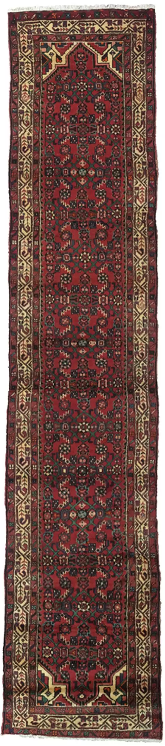 Classic vintage Hosseinabad runner from West of Iran. This piece benefits from a thick, soft pile. The red ground is decorated with Herati design and cream spandrels and its framed with a cream geometric border. Good narrow width for such a long runner.