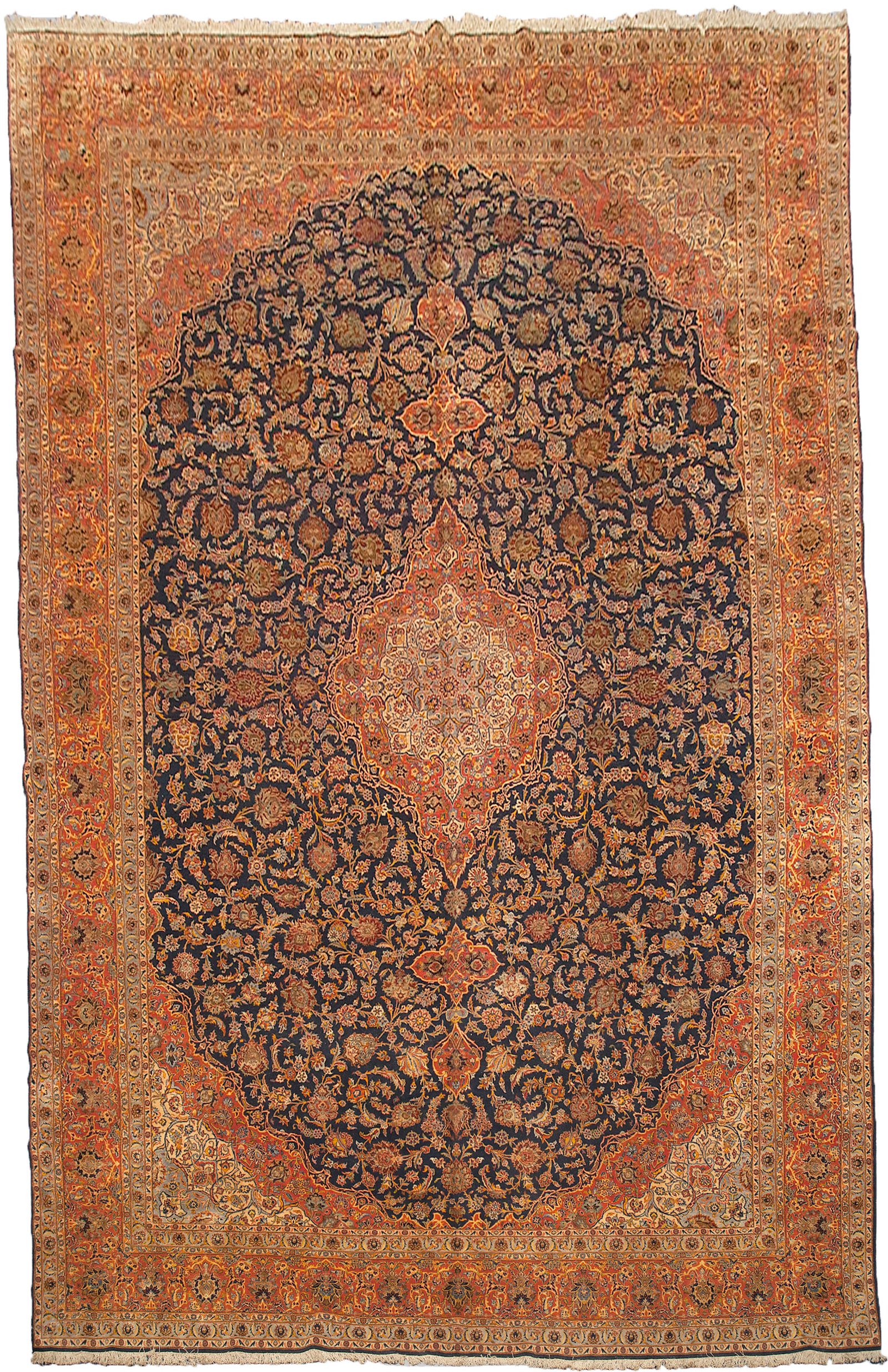 Crafted by master artisans in Kashan, Central Iran, this rug is not just a floor covering but a true statement piece—an investment in both beauty and heritage. The level of detail, combined with the rare silk content and large dimensions, makes this an exceptional offering for collectors and interior designers alike.