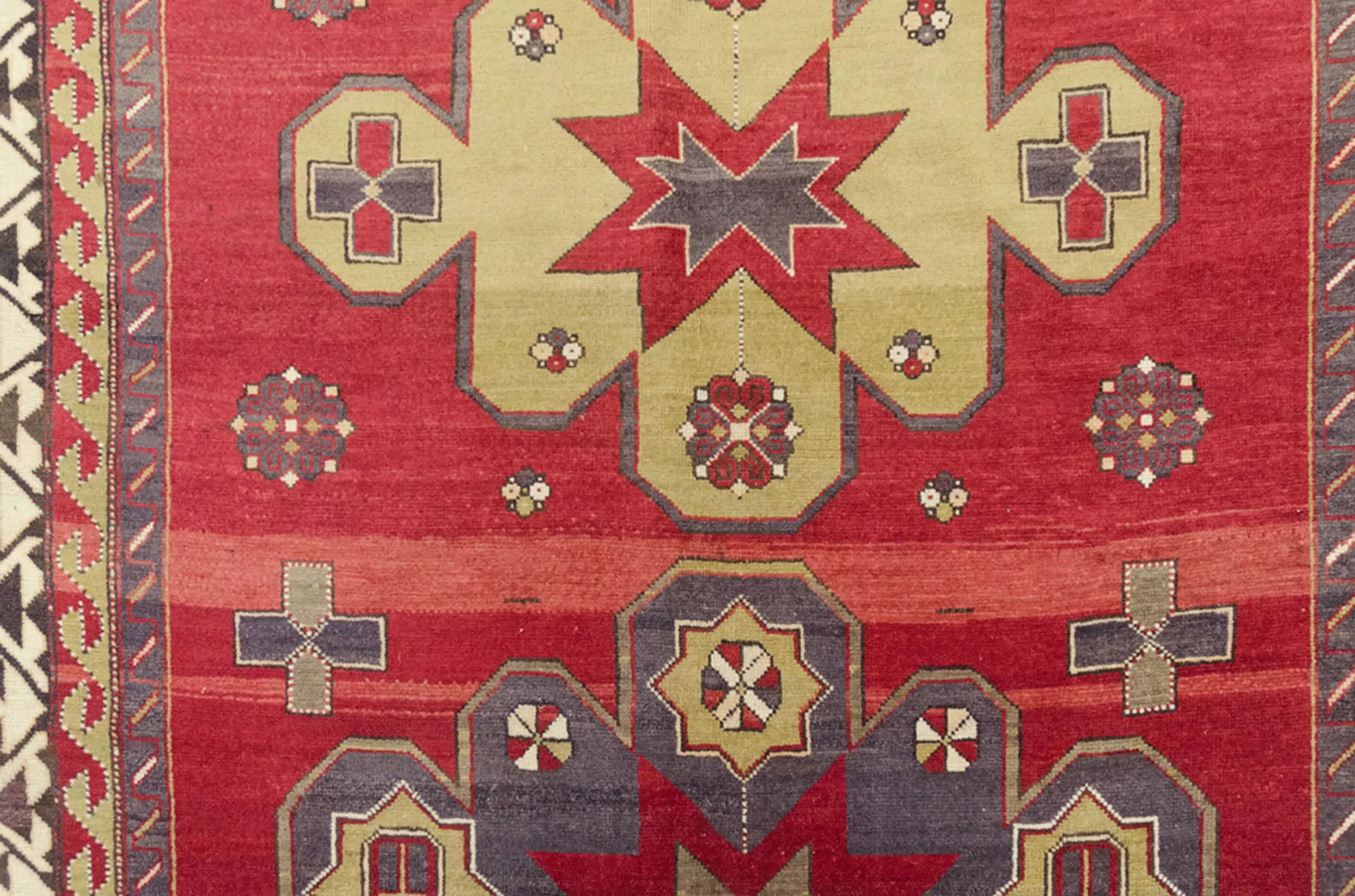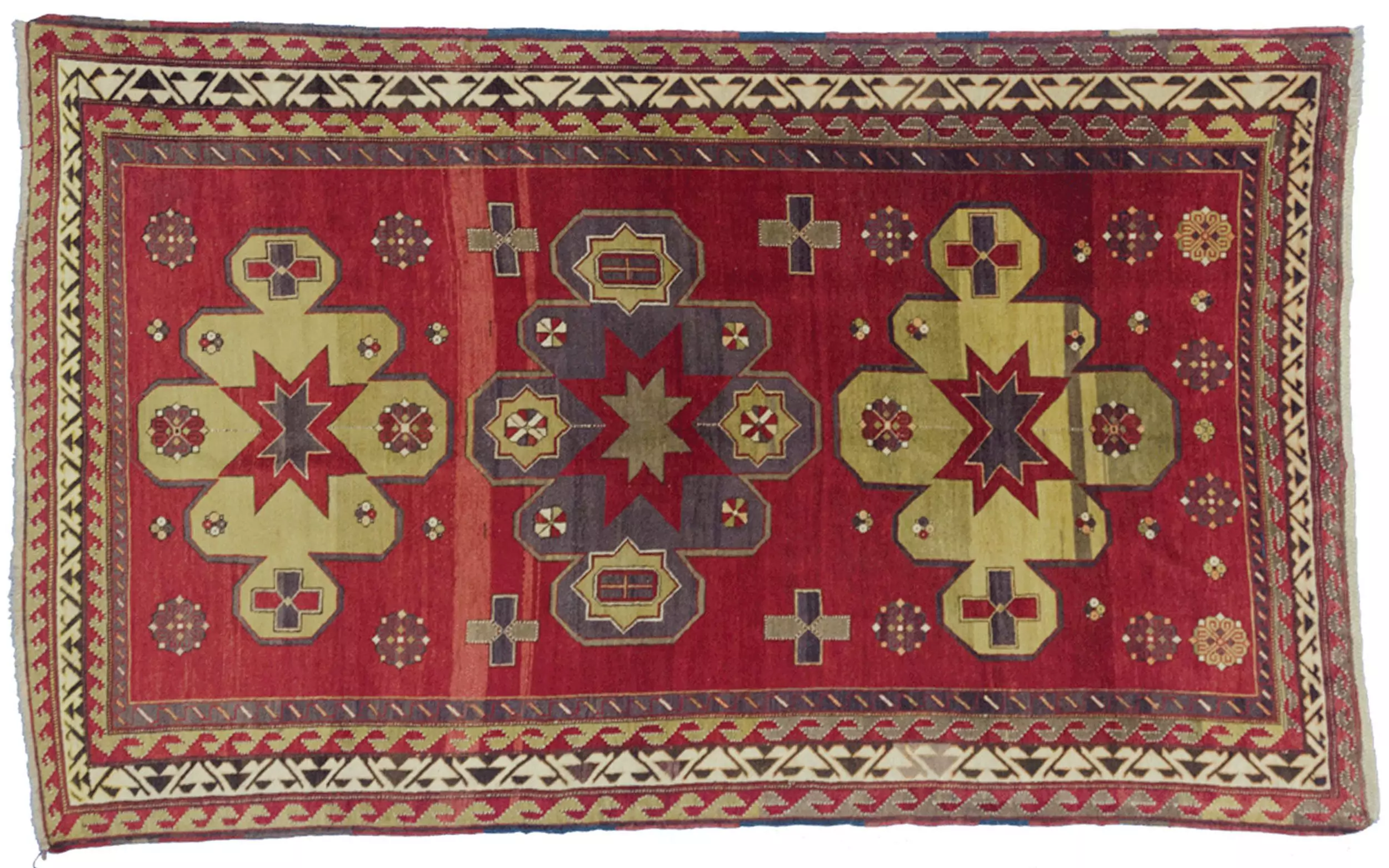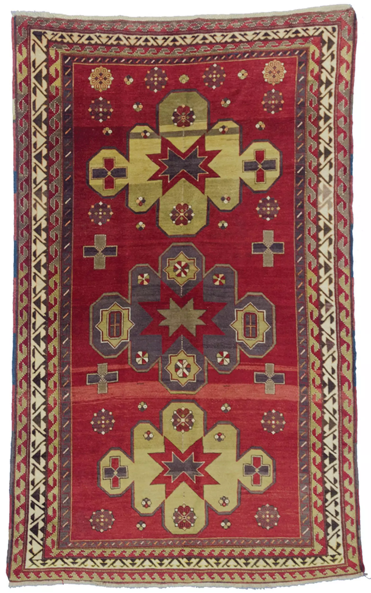 Attractive vintage Kazak rug. Three medallions on a rich red ground field with crosses in the field and a cream and green multiple borders.