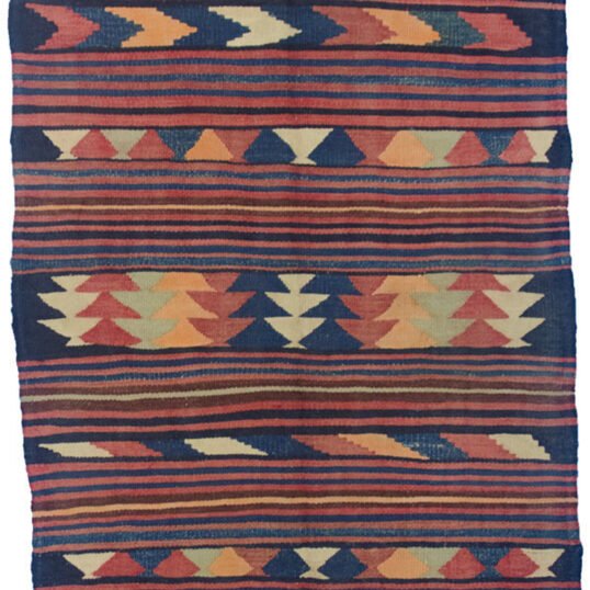 The design features alternating wide and narrow horizontal stripes, with the wider bands filled with tribal motifs, while the narrower ones remain plain, creating a beautiful rhythm and visual contrast. This stylistic structure not only highlights the strength of Kurdish design sensibility but also adds a decorative and versatile appeal that makes the kilim suitable for a variety of interior settings.