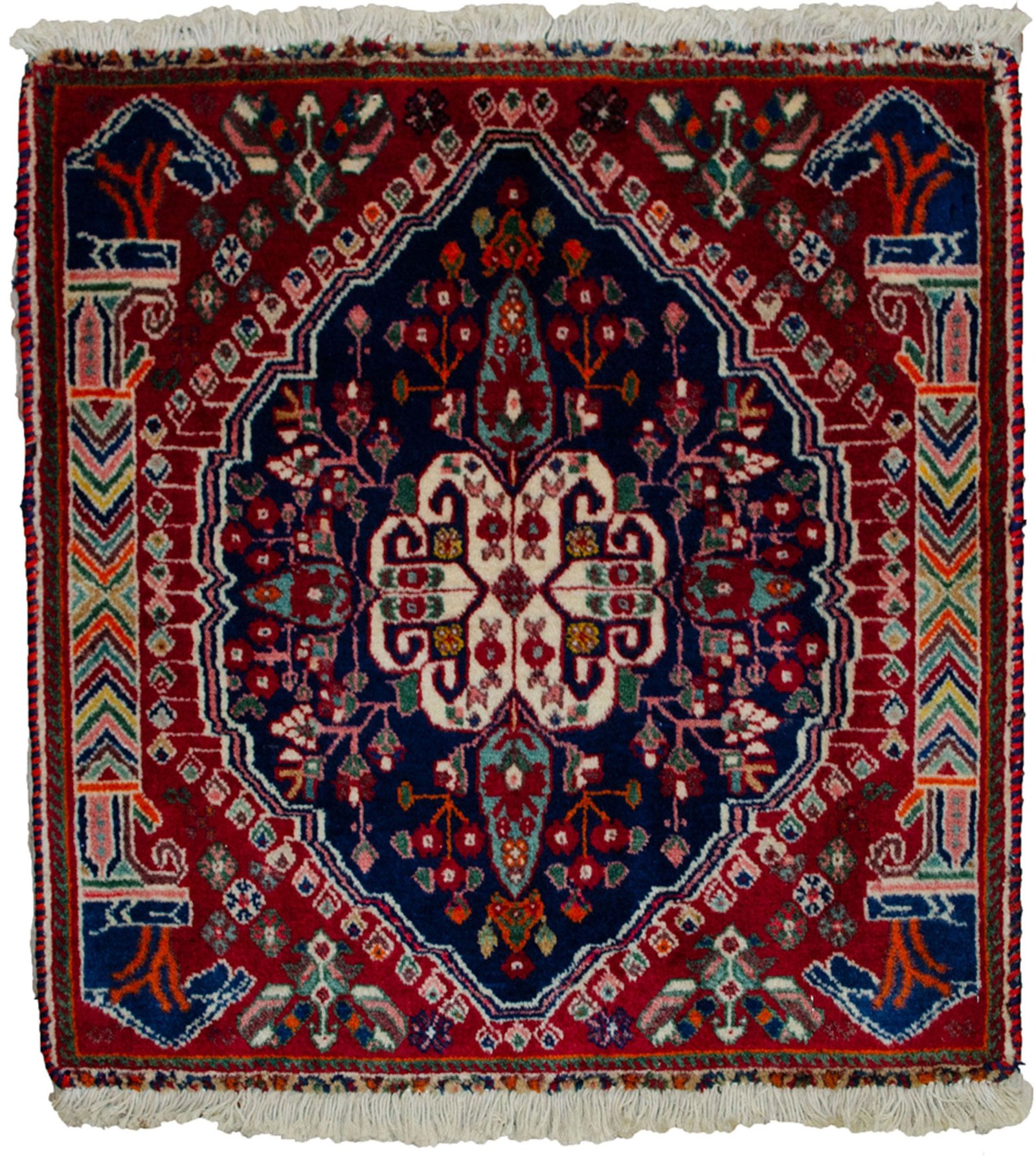 Rich coloured vintage Qashqai bag face from the tribes of South Iran. This is one of the typical bag face motifs from the Qashqai Tribes with a bold centre and the horse’s head Persepolis pillars at each side. The centre of the medallion is eight back to back paisley motifs protruding branches and four cypress trees. The multicoloured pillars give it a certain charm.