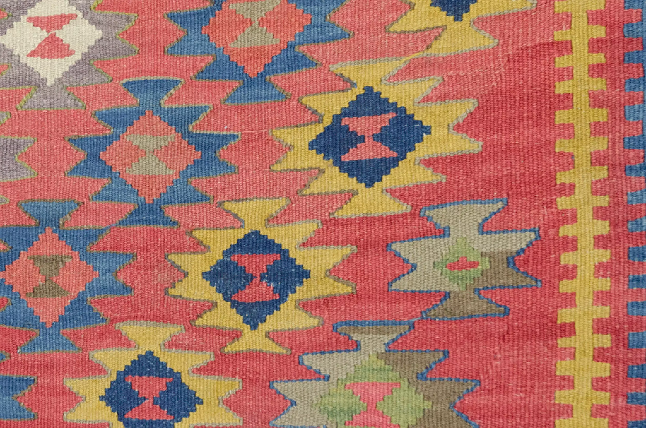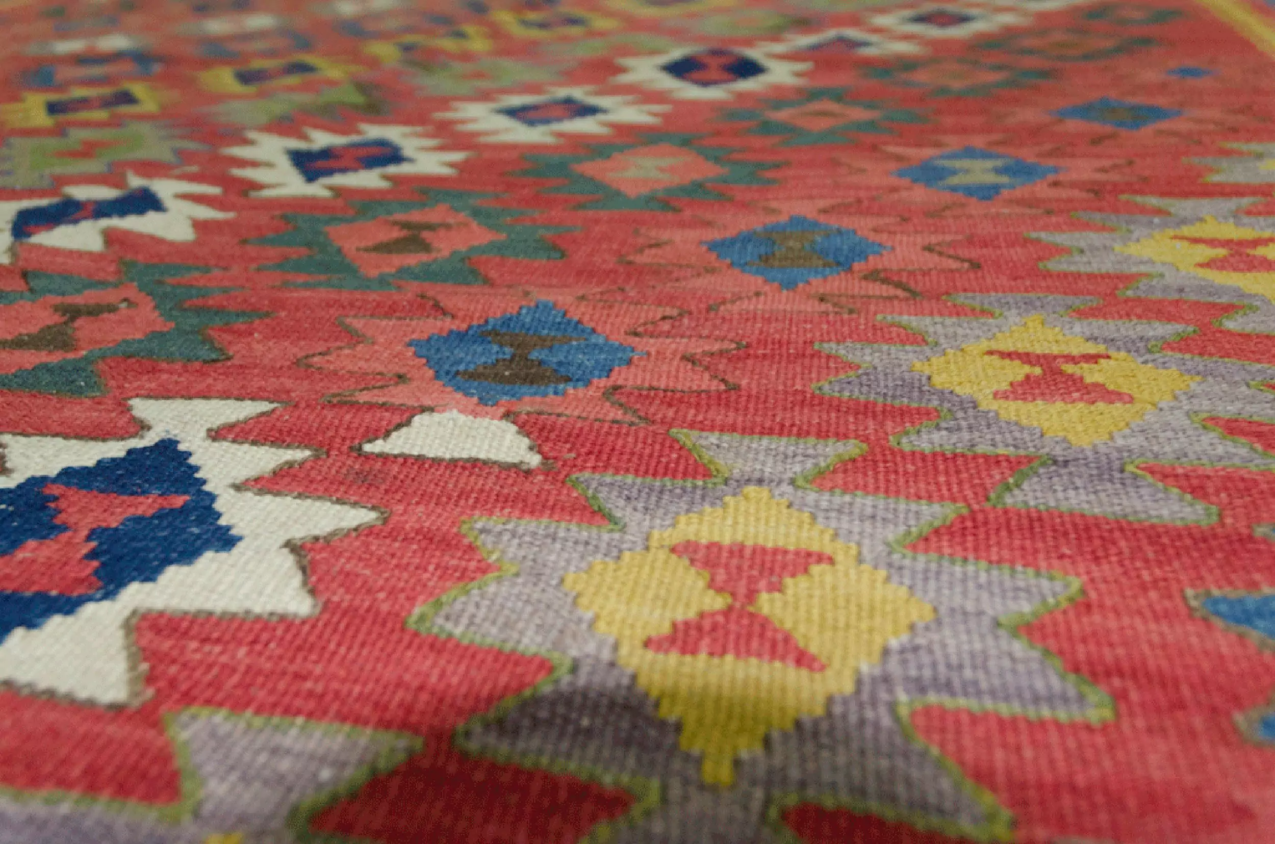 The kilim features a warm soft red ground that acts as a harmonious backdrop for a series of intricate star motifs, rendered in vivid shades of blue, yellow, and green. These colours pop against the red field, producing a striking visual contrast that captivates the eye without overwhelming the senses.